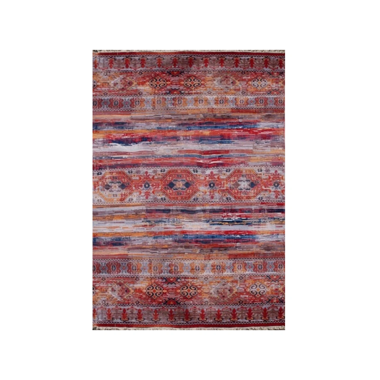 Apuesta por una alfombra granate con tejido transversal, capaz de integrar hasta 18 colores en una sola pieza y acabada en colores sólidos que mantienen su intensidad. Su composición de 100% poliéster aporta una superficie suave, agradable y sin pelusa, mientras el fleco de algodón añade un detalle manual distintivo.