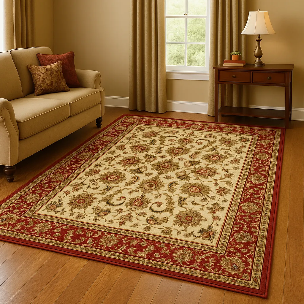Explora la esencia Persa en esta alfombra acrílica Suany, distribuida desde Crevillente, donde su diseño tradicional y sus colores transmiten calidez y carácter. Fabricada en 100% Poliacril Heat-Set, aporta un acabado definido que realza cada detalle del dibujo.
