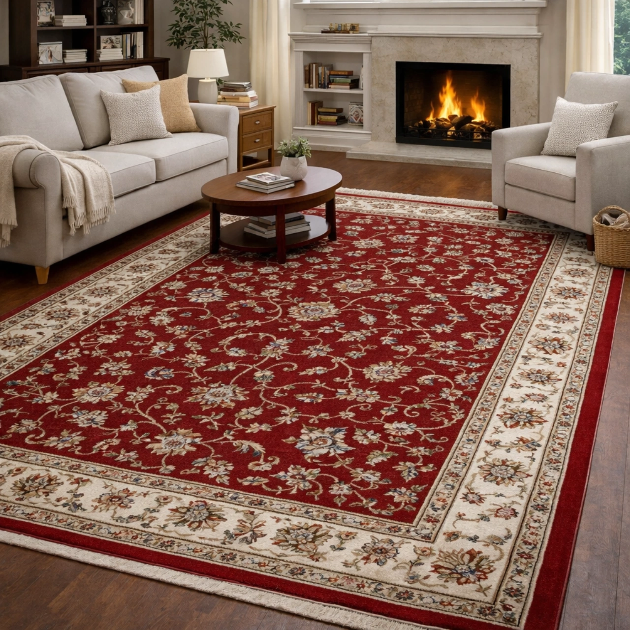 Apuesta por una alfombra acrílica de estilo Persa que combina colores tradicionales y materiales de calidad como el 100% Poliacril Heat-Set, ofreciendo una superficie suave y resistente con 330.750 puntos/m² y una altura total de 13 mm. Su diseño en tono beig o granate se integra con facilidad en dormitorios, pasillos o salones.
