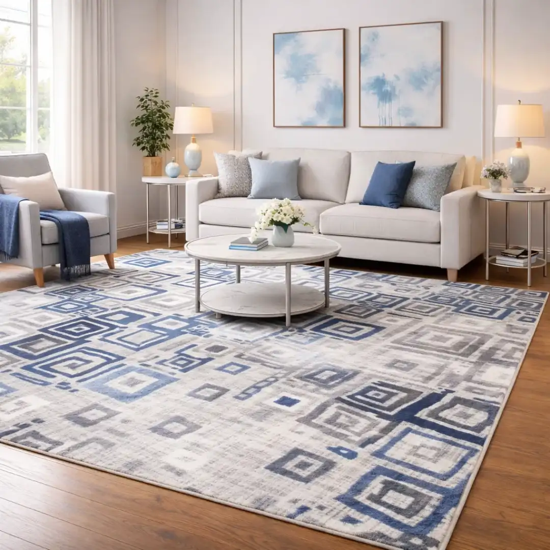 Disponible en AZUL y BEIG, se adapta a distintas estancias gracias a sus medidas 0,67 x, 120×160, 133×190, 160×230, 200×290 y 80×150, manteniendo el diseño original del modelo en cada formato.