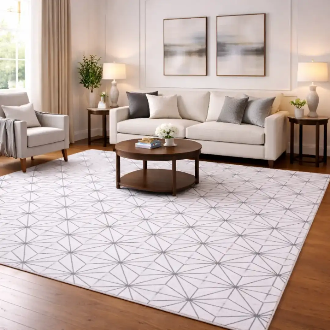 Disponible en gris y marfil, se adapta desde hall hasta salón en medidas 133X195, 160X230, 200X290 y 240X340, facilitando una elección precisa para cada ambiente y mejorando la coherencia estética del hogar.
