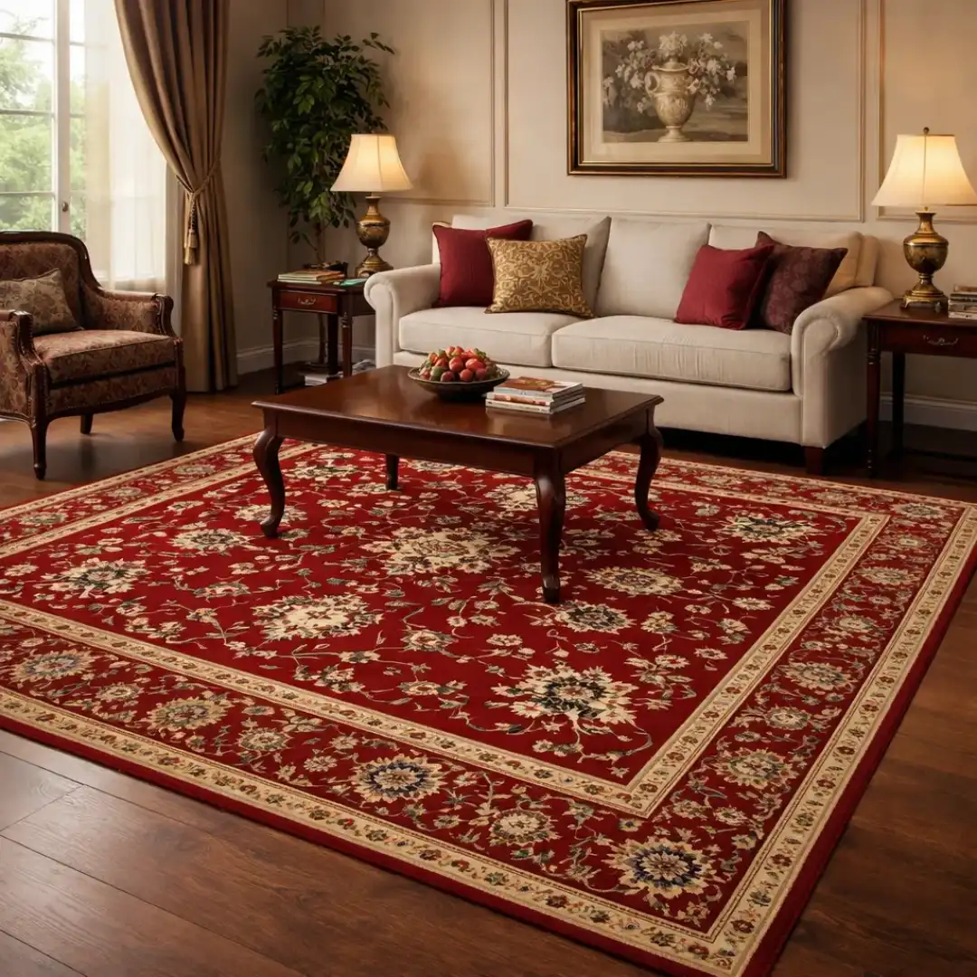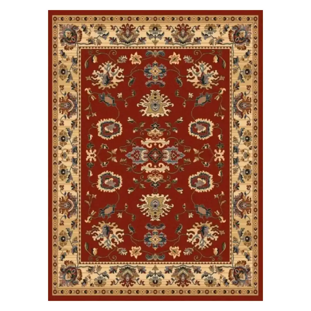 Disponible en varios tamaños y colores granate y beige, con medidas como 70X135, 120X180, 170X240, 200X300 y 300X400, adaptándose con facilidad a diferentes espacios del hogar.
