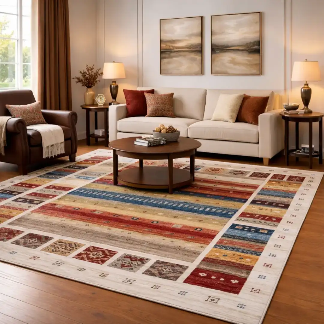 Diseño multicolor: Aporta carácter decorativo y calidez visual gracias a su combinación de hasta 14 colores y estética Oushak estilo Gabbe.