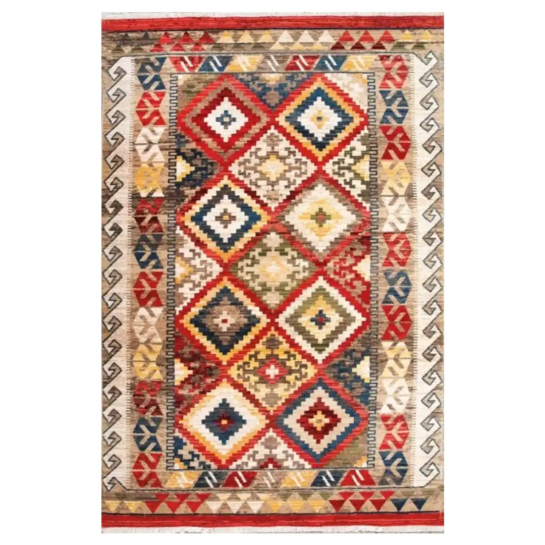 Alfombra OUSHAK Serie 232 de estilo Kilim, multicolor y con motivos étnicos, tejida al través y elaborada con hasta 14 colores. Incorpora un pequeño fleco integrado en la trama que aporta un acabado artesanal y una presencia decorativa muy marcada.