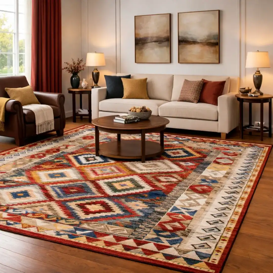 Estética Kilim: Diseño multicolor con motivos étnicos que aporta carácter decorativo y presencia visual en hall, salón o pasillos.
