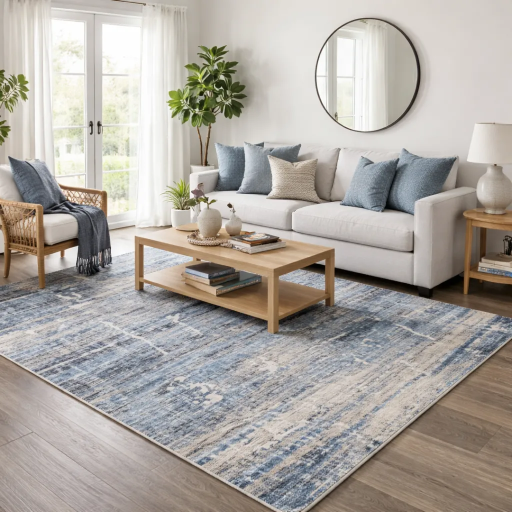 Disponible en Azul y Beig, se adapta a distintas estancias gracias a sus medidas 0’67 X, 67X120, 100X150, 133X190, 160X235 y 200X285, ofreciendo versatilidad decorativa sin perder identidad visual.