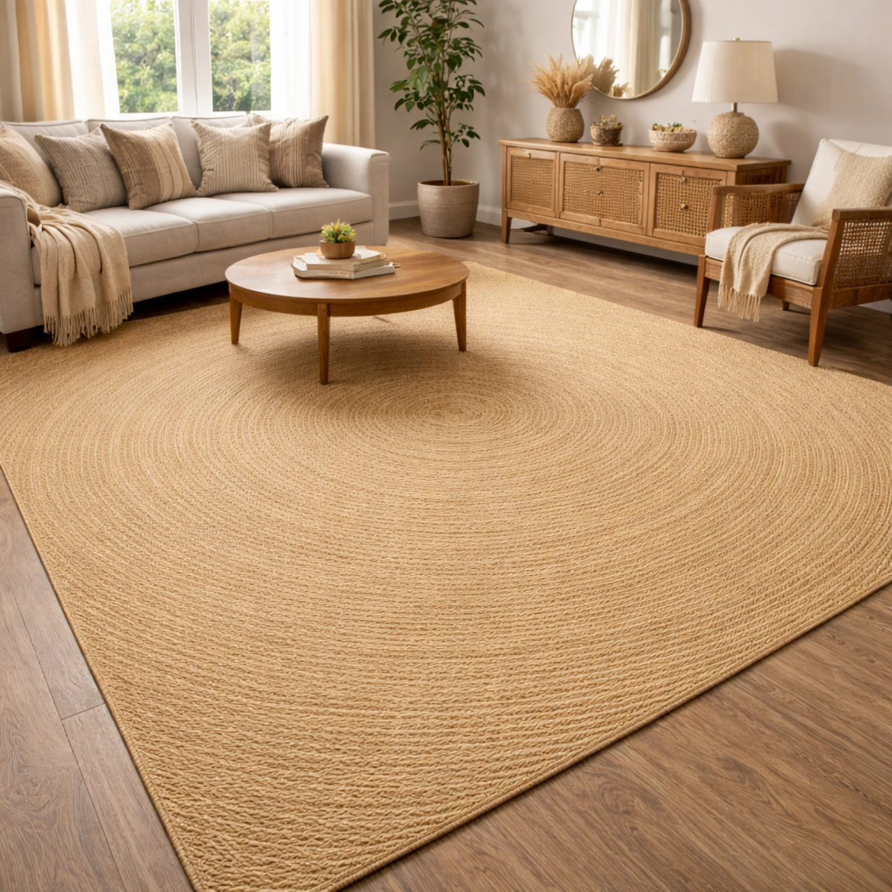Explora una alfombra artesanal confeccionada en yute natural, trabajada por expertos de India y distribuida desde Crevillente. Su acabado reversible aporta versatilidad y encaja con ambientes rústicos sin alterar la estética del espacio.