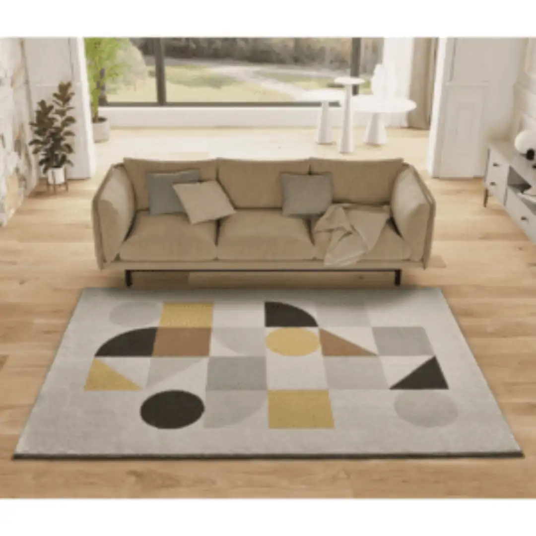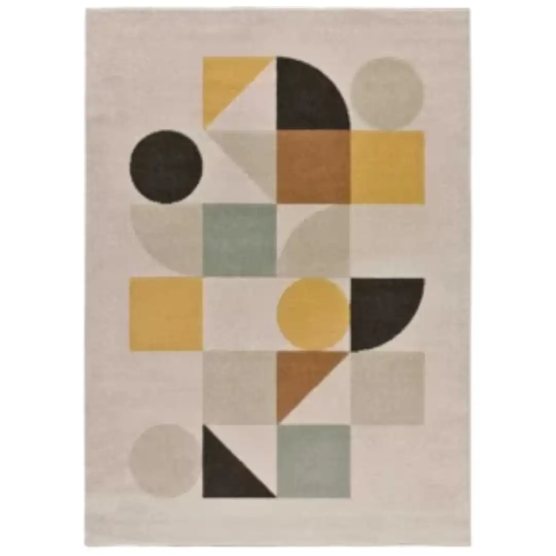 La alfombra DOMUS se caracteriza por sus formas suaves y gráficos únicos. Presenta un diseño contemporáneo en color crema, realzado con motivos geométricos en tonos empolvados, lo que la convierte en una pieza impactante.
