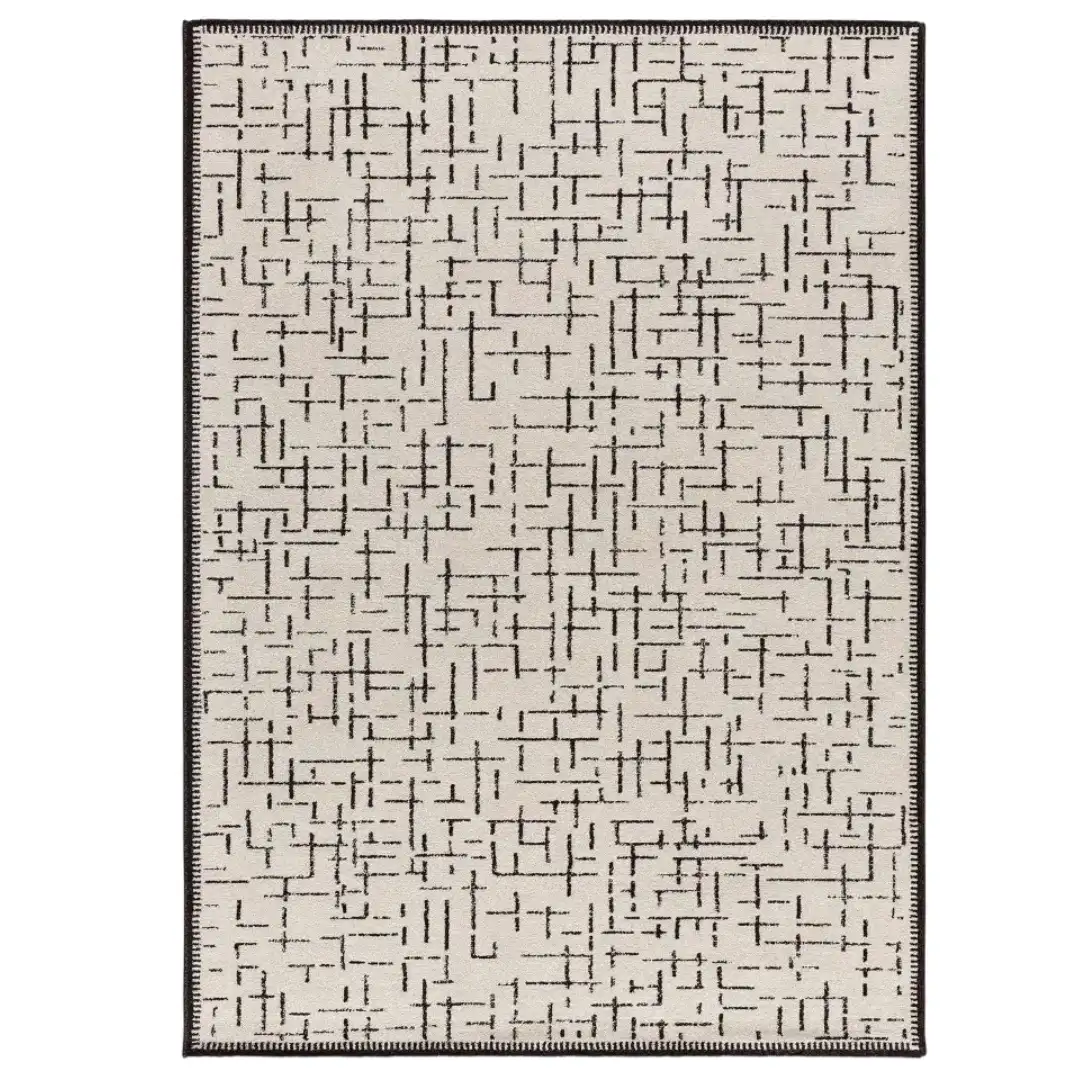 Aprecia el diseño de esta alfombra moderna con patrón geométrico, creada para dar un toque retro, elegante y actual a tu salón. Disponible en 80×150, 133×190, 160×230 y 200×290, ofrece un aspecto limpio en tonos blanco que potencia la luz y la amplitud del espacio.