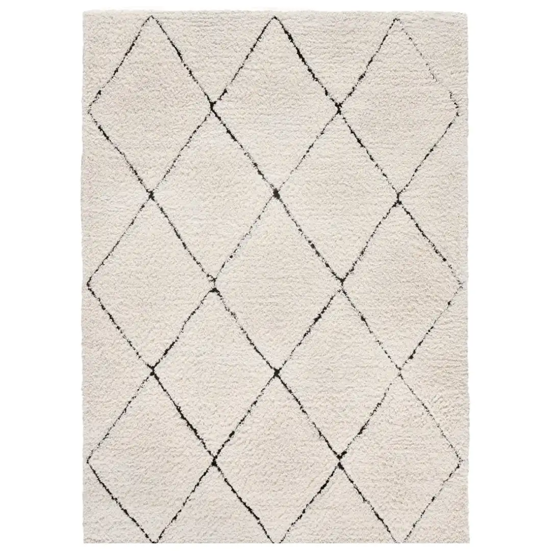 Alfombras ATESA, el inicio perfecto para revitalizar y darle vida a tus ambientes. Este producto, de pelo alto y toque escandinavo, incorpora un diseño en rombos en tonos cremas que hará tu salón o dormitorio lucir con autenticidad.