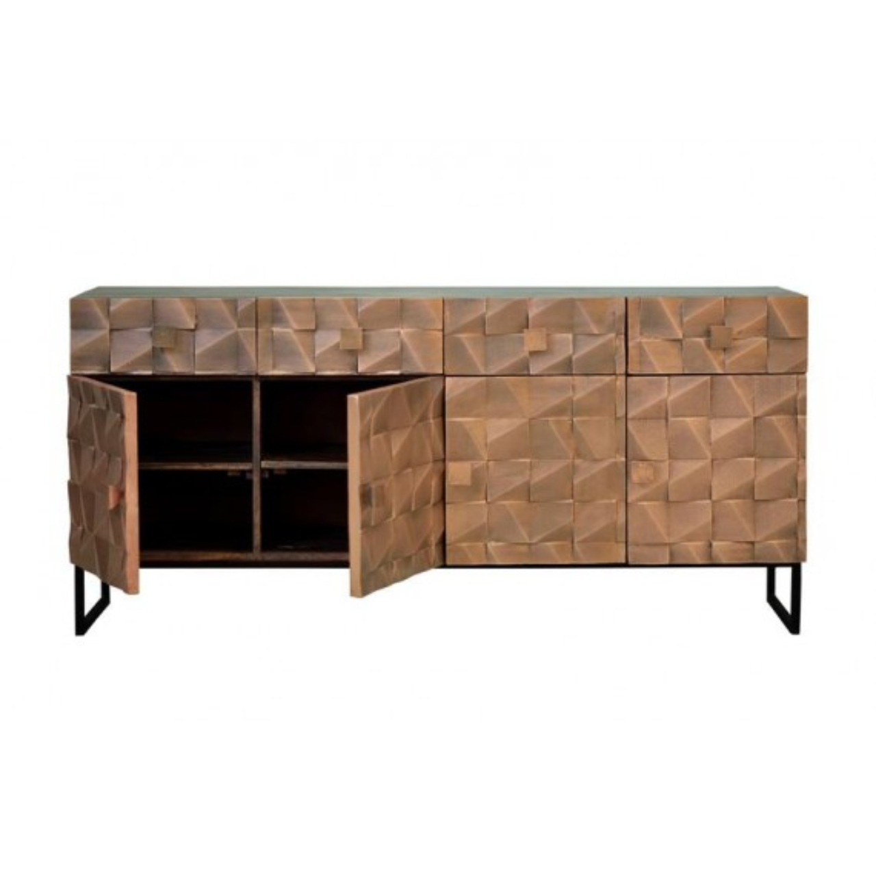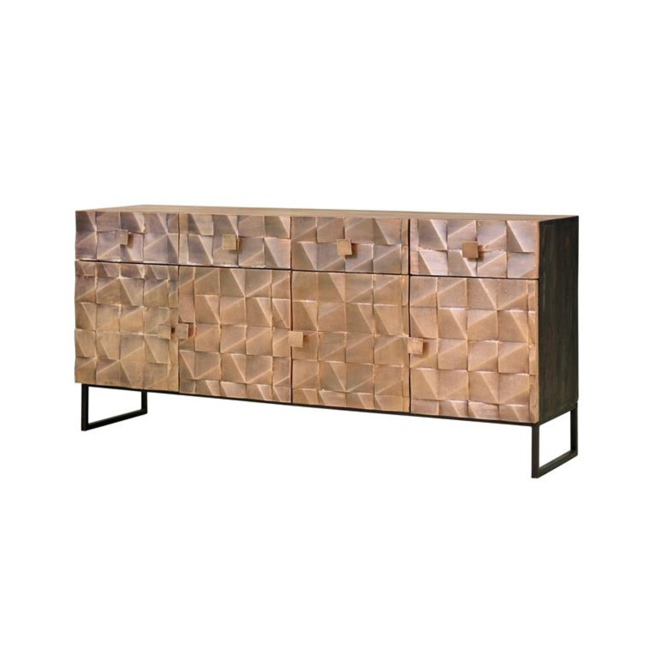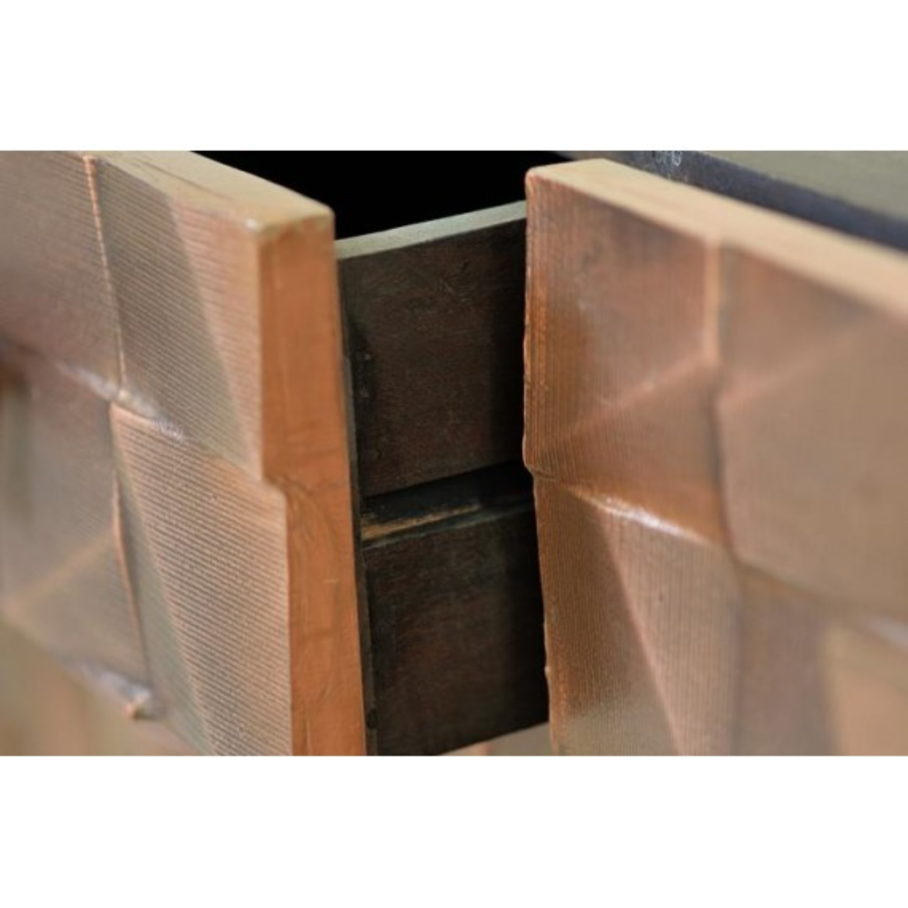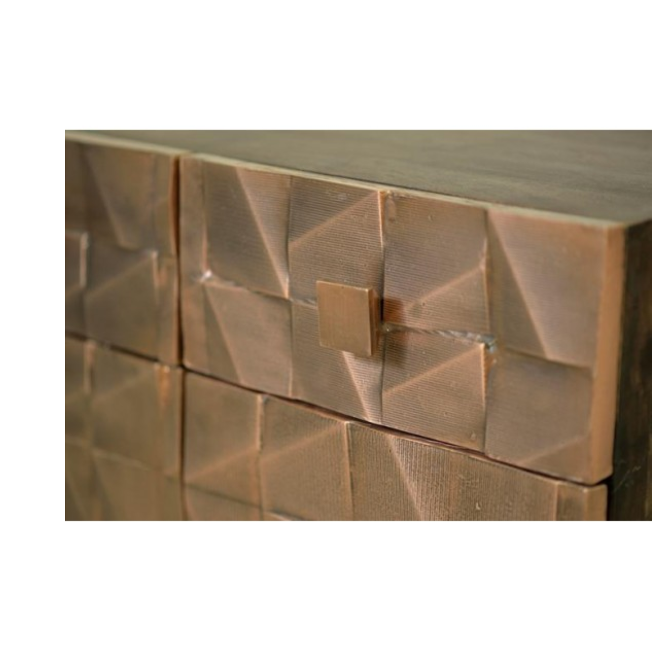 Con una lámina de cobre repujado que recubre toda su superficie, el aparador brilla con un resplandor cálido y atractivo que atraerá a todos los invitados. Su base está hecha de hierro, lo que le propociona estabilidad adicional y se suma al atractivo visual de la pieza.