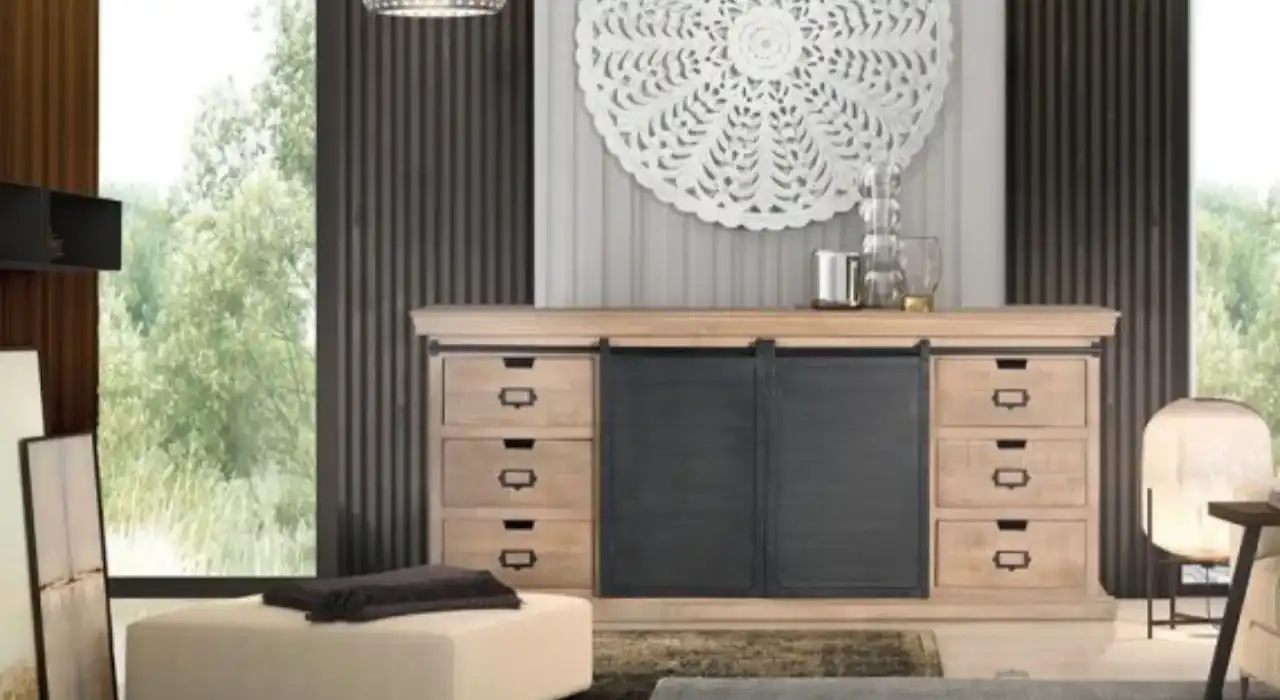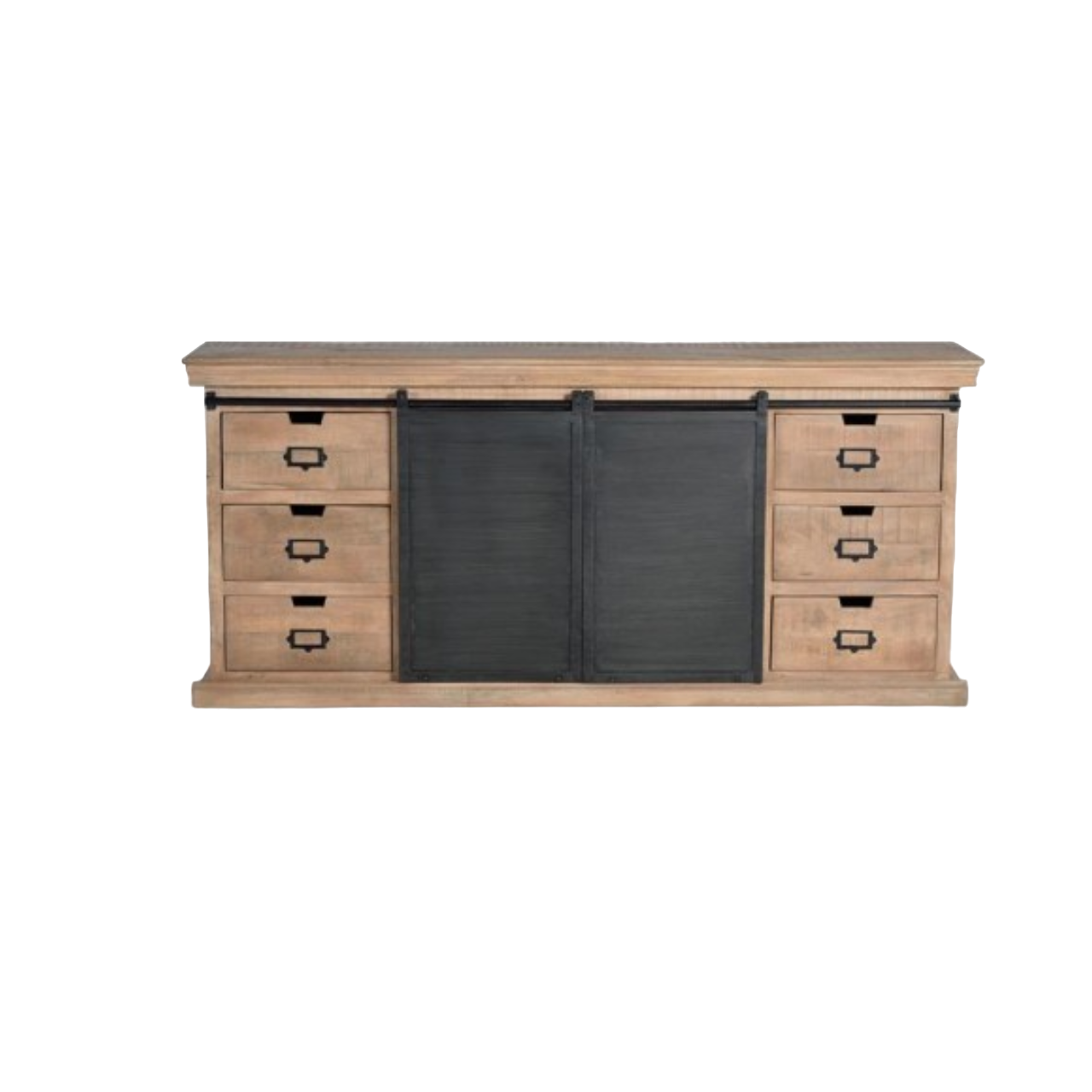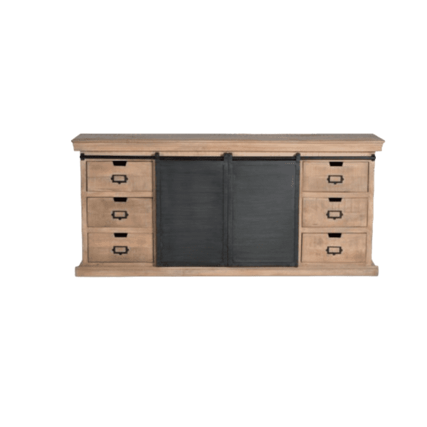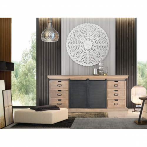 Exhibiendo su casi artística funcionalidad, este mueble presume de 6 cajones y 2 puertas corredizas de metal negro. Aportando no solo utilidad sino también diversidad a tu espacio, estructurará tu entorno a la vez que ofrece amplio almacenamiento. Cada detalle, desde su naturaleza de mandadera maciza hasta sus detalles metálicos negros, profundizarán el aire distintivo de tu hogar.