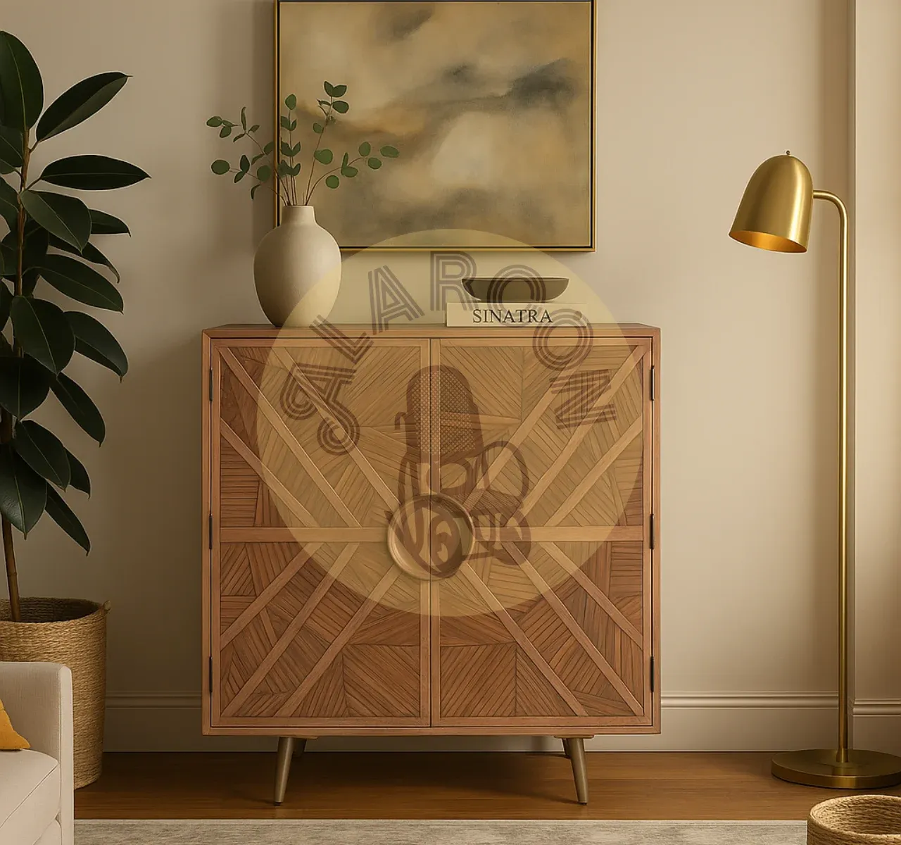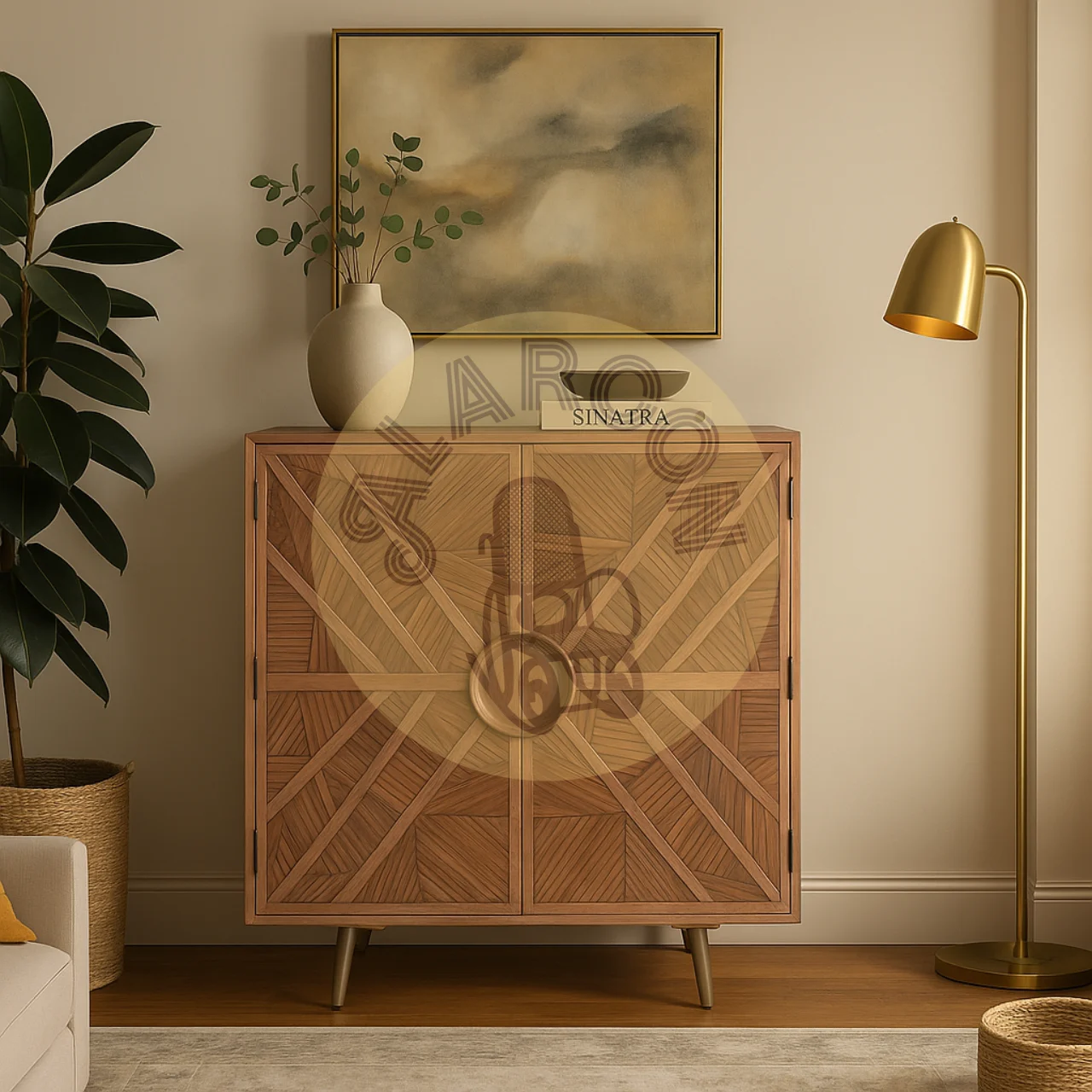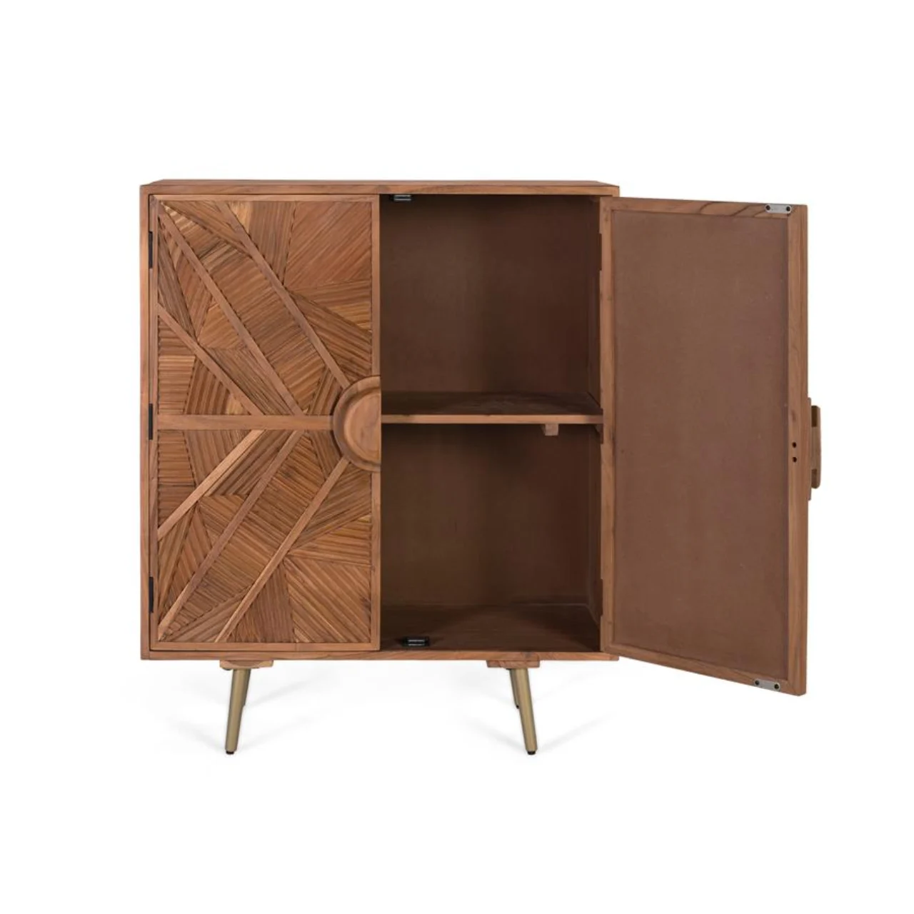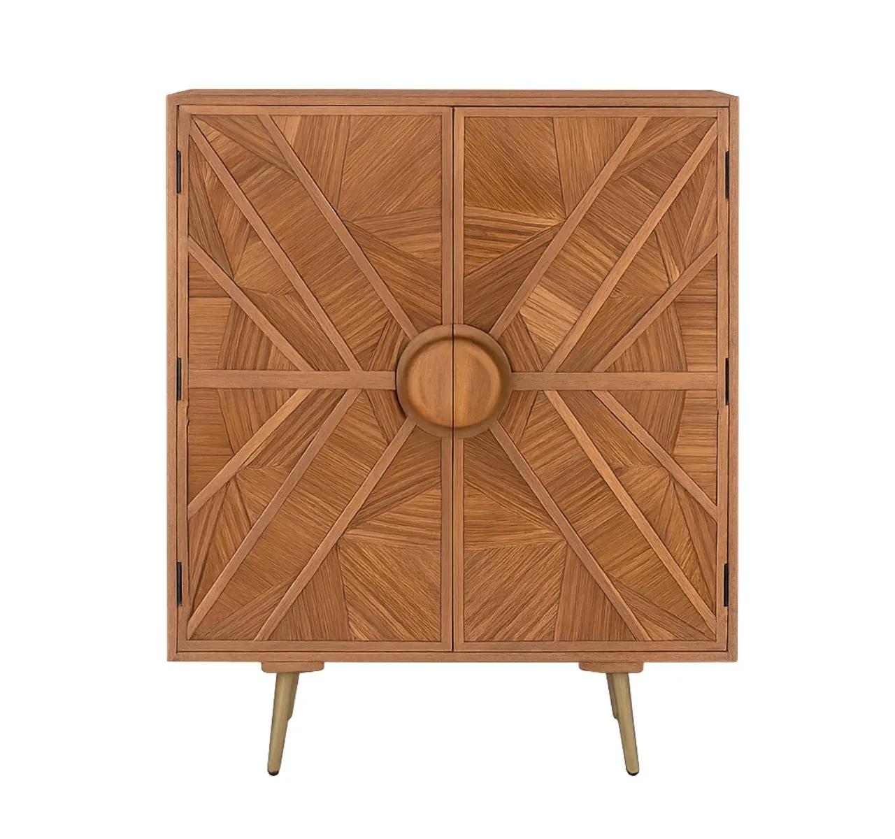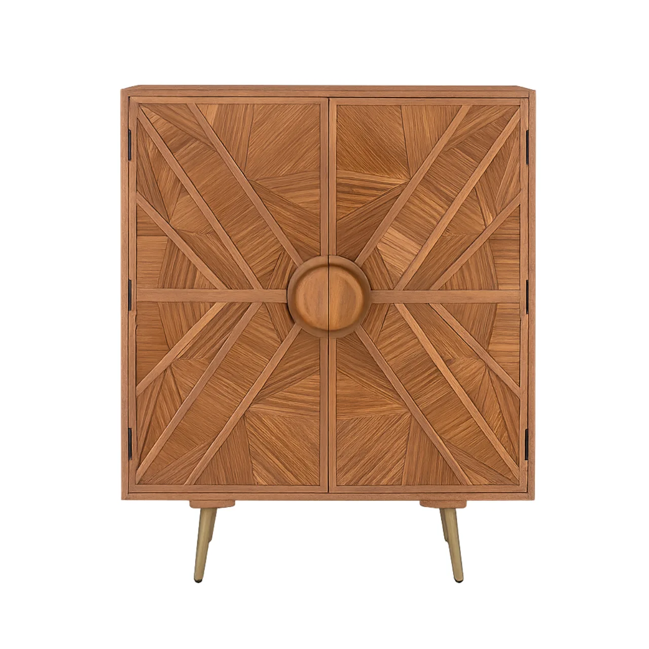 En el centro, un tirador redondo de gran tamaño se convierte en el punto focal, creando un contraste elegante con las líneas del relieve. Las patas cónicas con acabado metálico latonado elevan la pieza, aportando un toque sofisticado y actual.