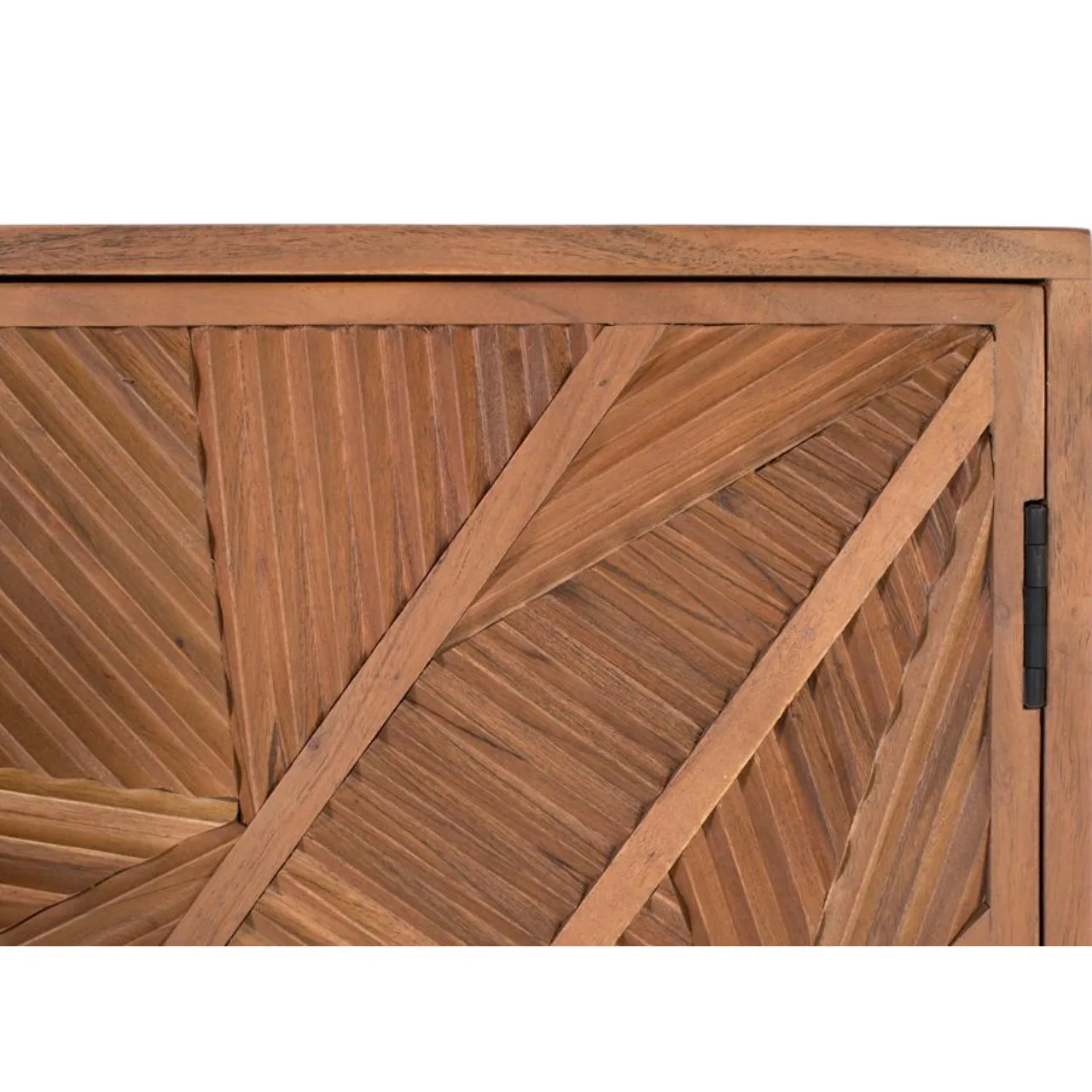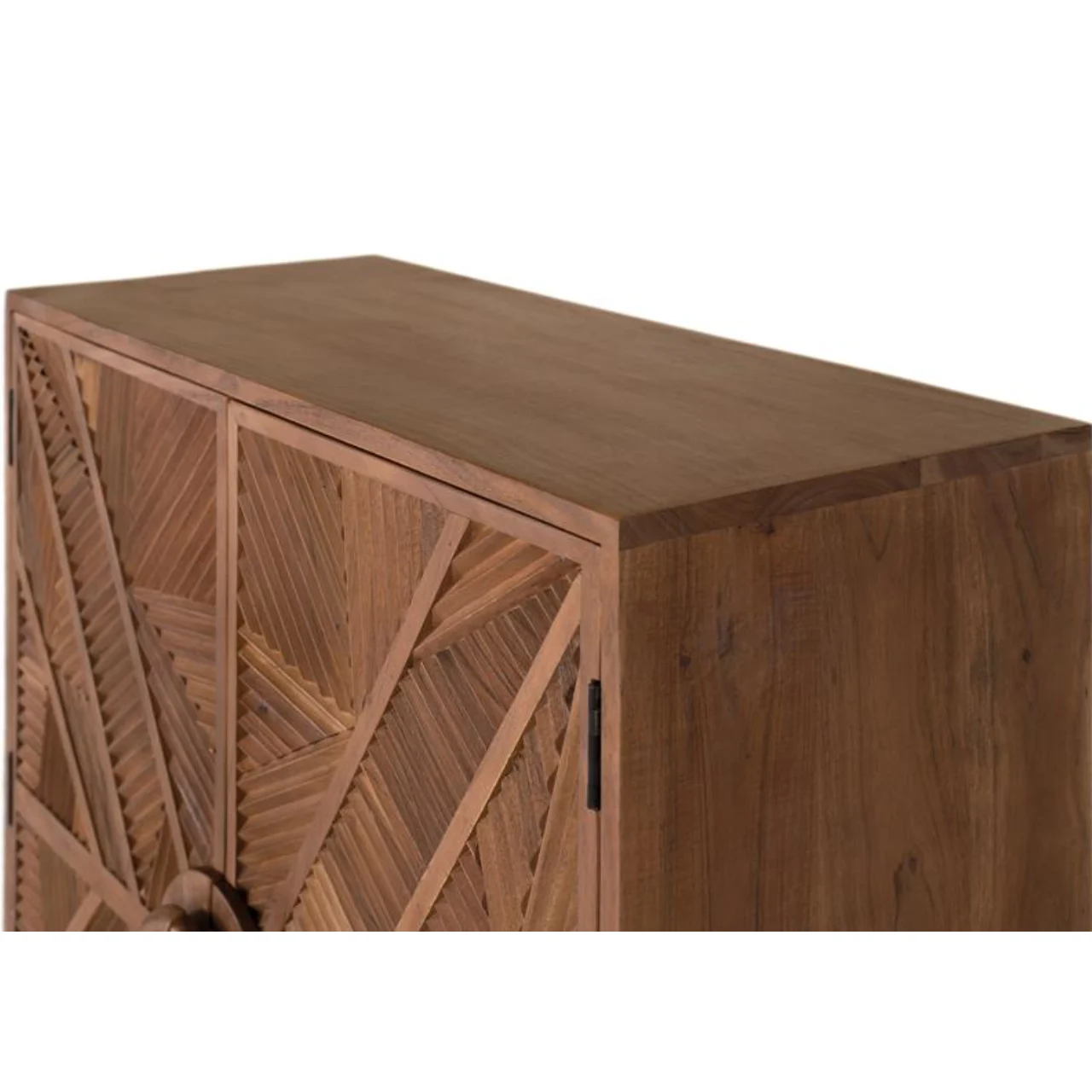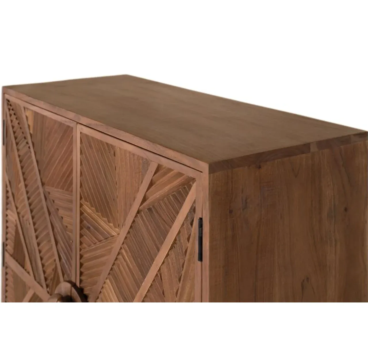Este aparador alto está fabricado en madera maciza de mango, destacando por su diseño exclusivo y su resistencia natural. Su superficie frontal luce un tallado geométrico hecho a mano que aporta carácter y personalidad a cualquier estancia.