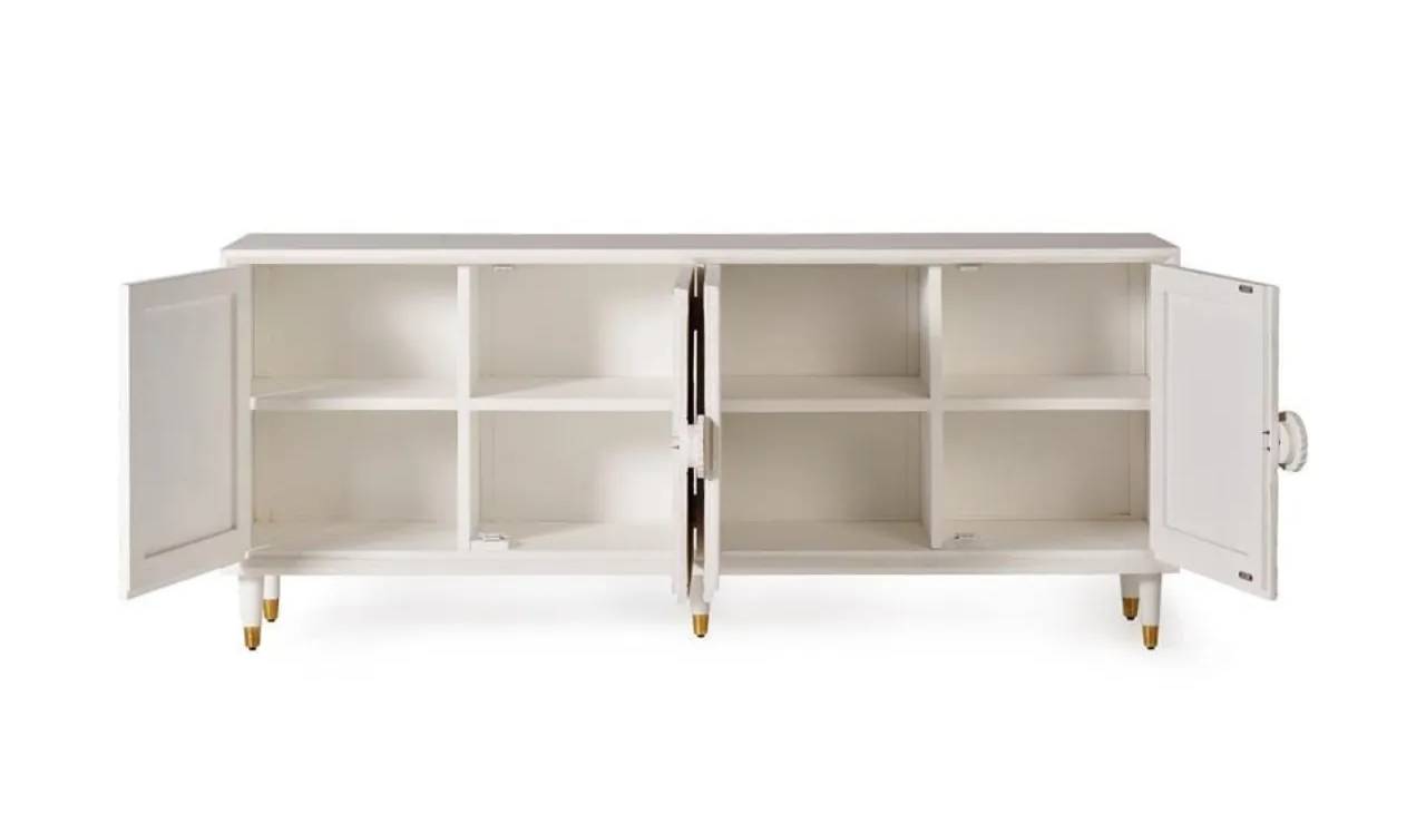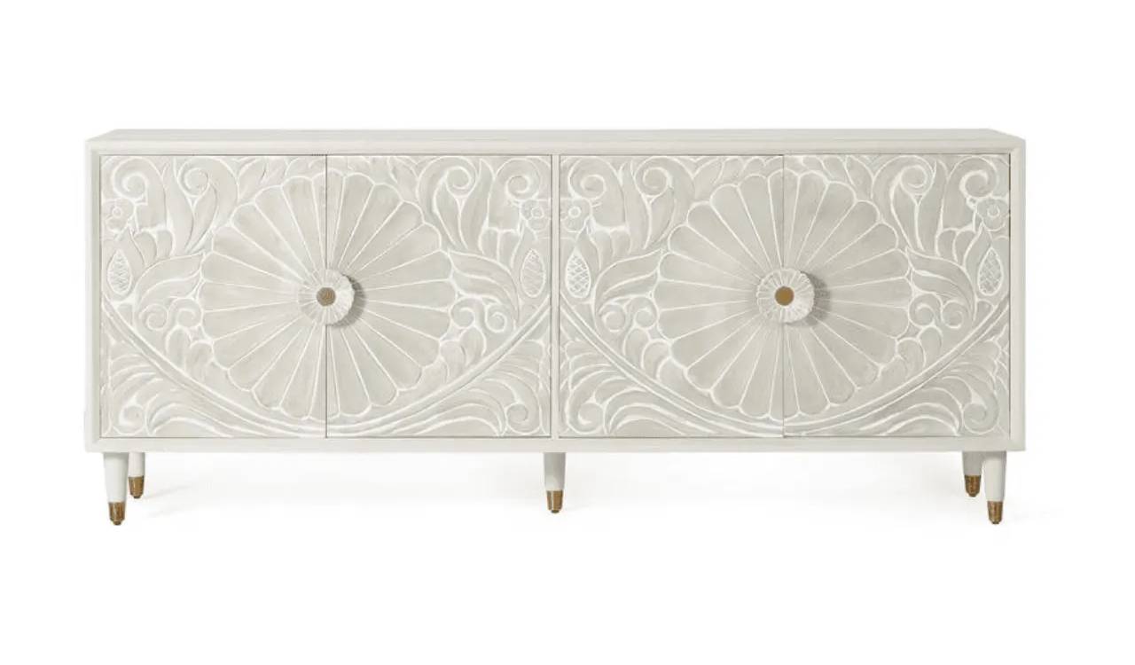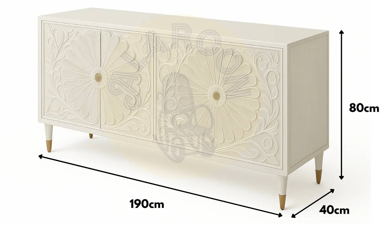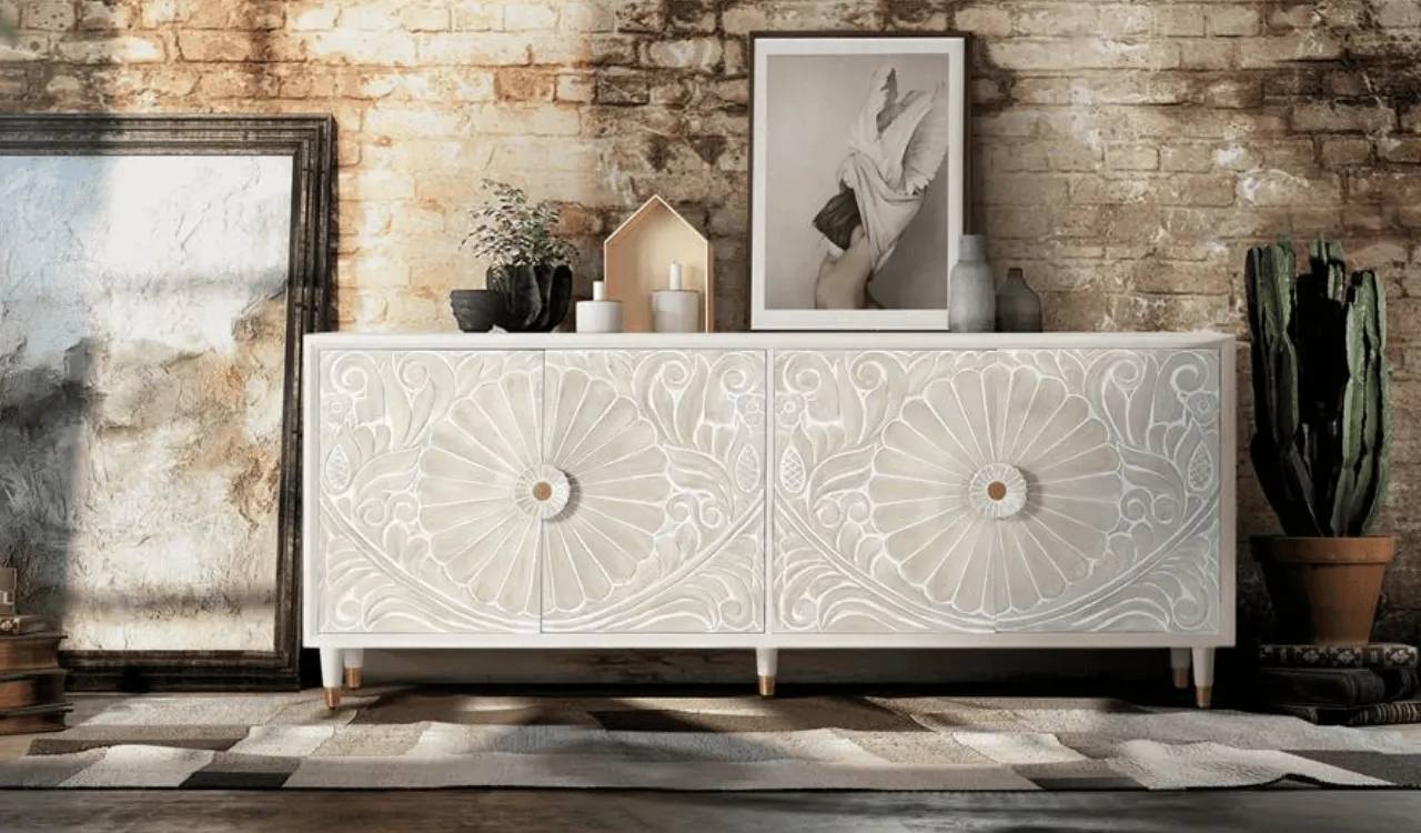 Su diseño resalta por una peculiar estructura pintada exclusivamente en blanco que termina harmonizando a la perfección con las edificantes puertas talladas a mano y salpicadas en color natura. Este acabado otorga un aspecto único y delicado, apropiado tanto para un ambiente moderno como rústico.