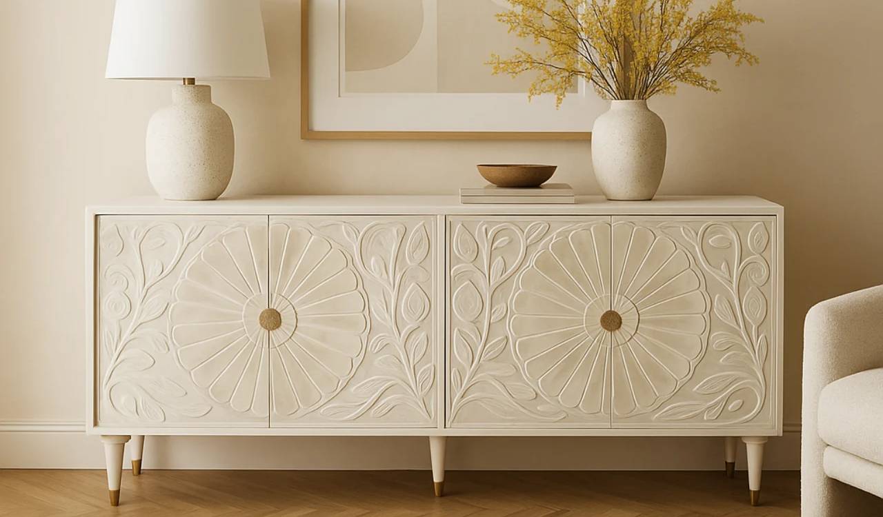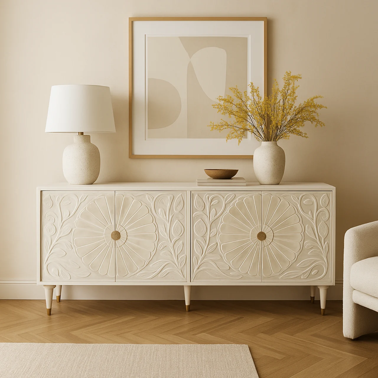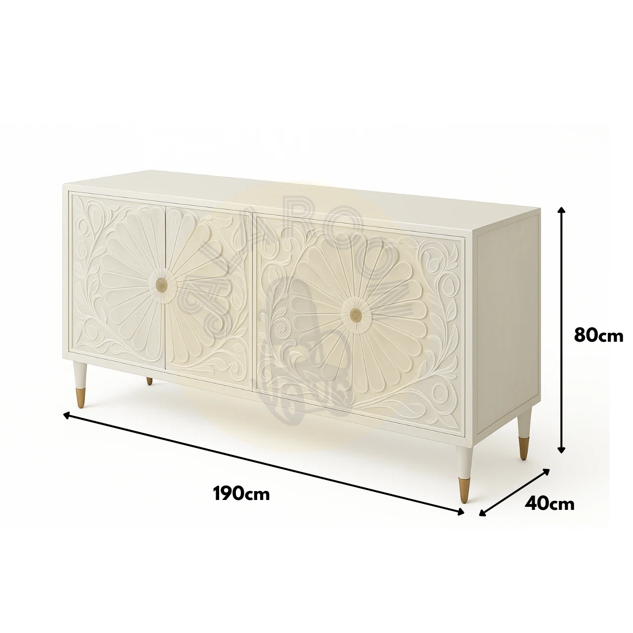 Su diseño resalta por una peculiar estructura pintada exclusivamente en blanco que termina harmonizando a la perfección con las edificantes puertas talladas a mano y salpicadas en color natura. Este acabado otorga un aspecto único y delicado, apropiado tanto para un ambiente moderno como rústico.