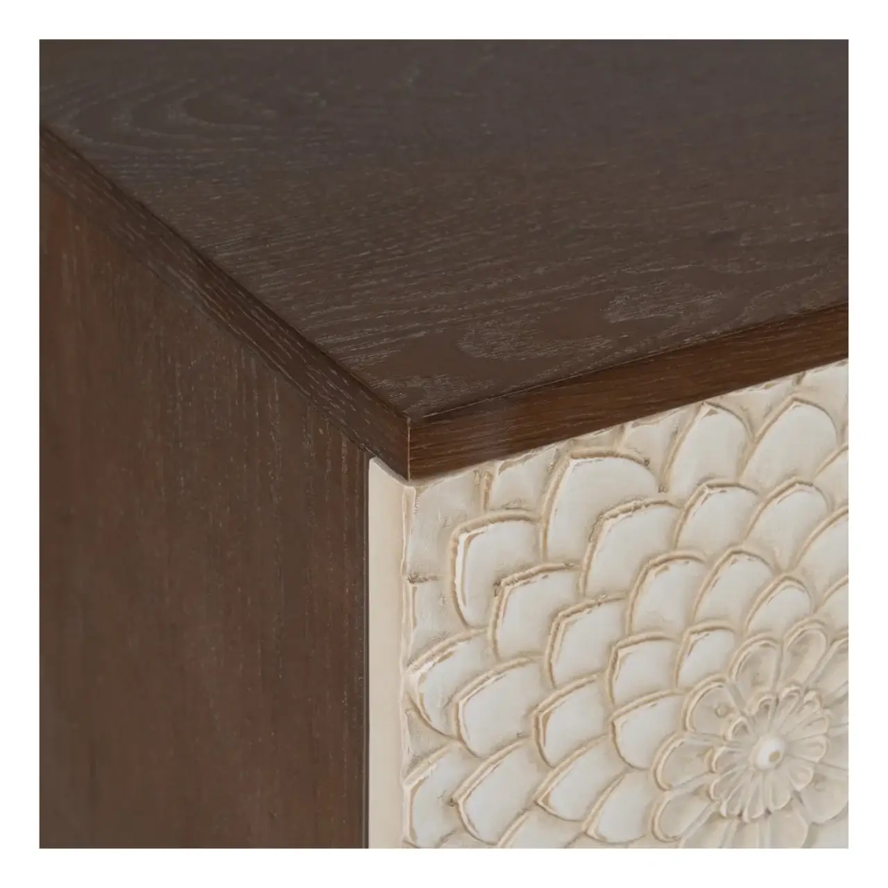 Impresionante y elegante, así es nuestro Aparador con Tallado Floreado Blanco y Marrón de Madera de Pino de Ixia. Un vibrante equilibrio entre funcionalidad y sofisticación que añade vida a cualquier espacio. Sus sutiles detalles tallados y su contraste de color llaman a la admiración, a la vez que ofrece un generoso almacenamiento para sus necesidades diarias.