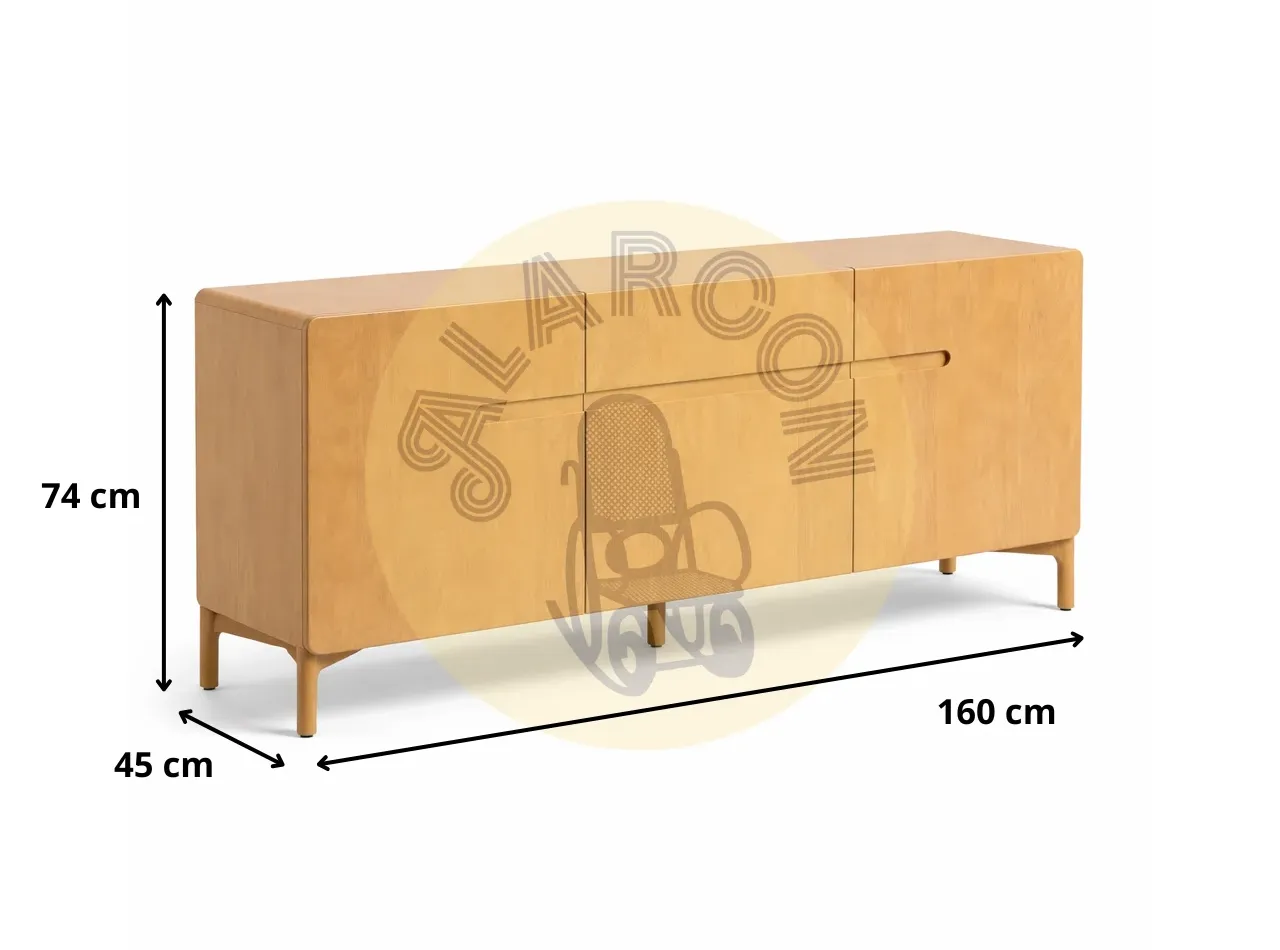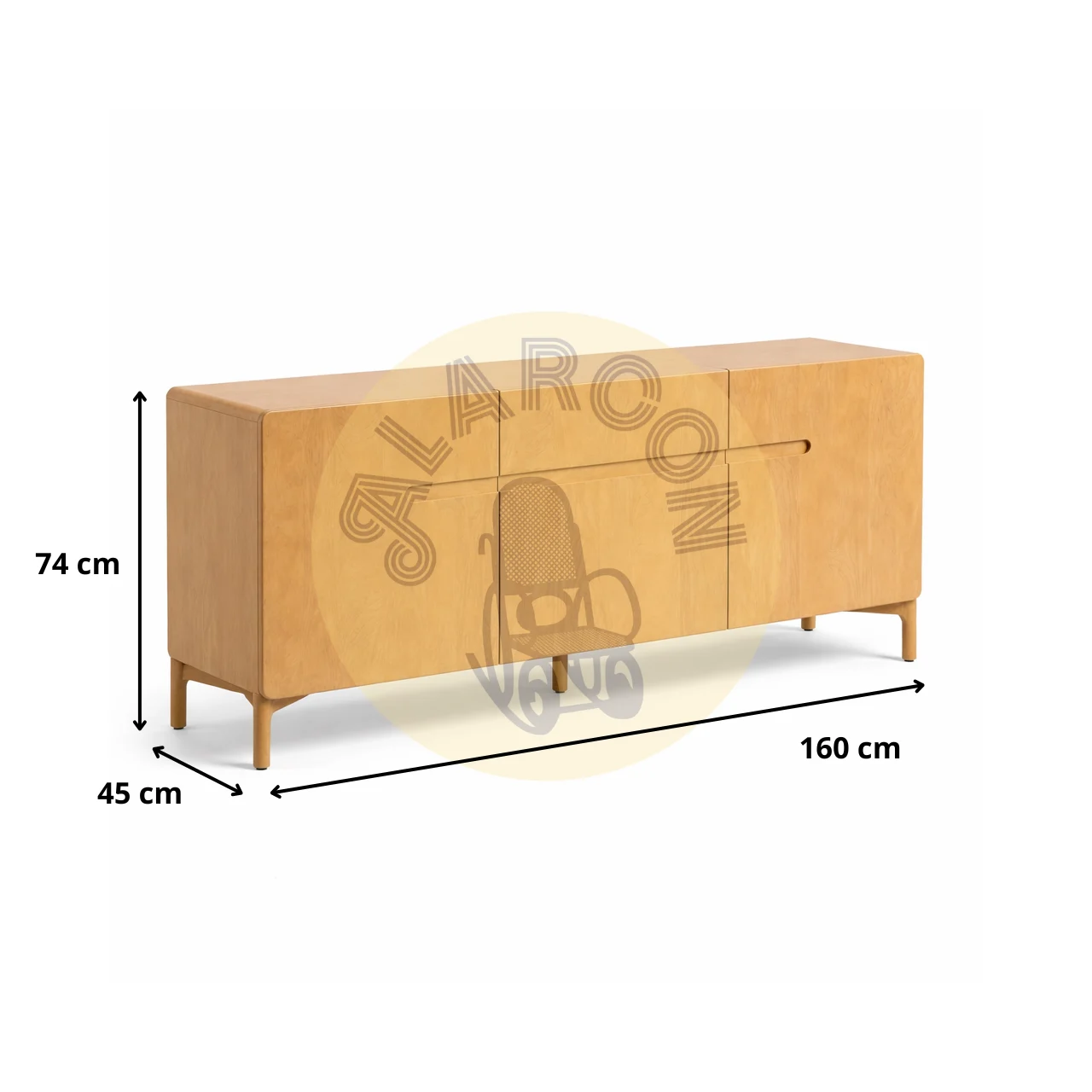 Con unas medidas de 160 x 45 x 74 cm, este mueble incorpora patas elevadas de 15,5 cm que aportan ligereza visual y facilitan la limpieza. Una pieza novedad que combina calidad, capacidad y estilo, ideal para salones o comedores que buscan muebles con presencia y personalidad.