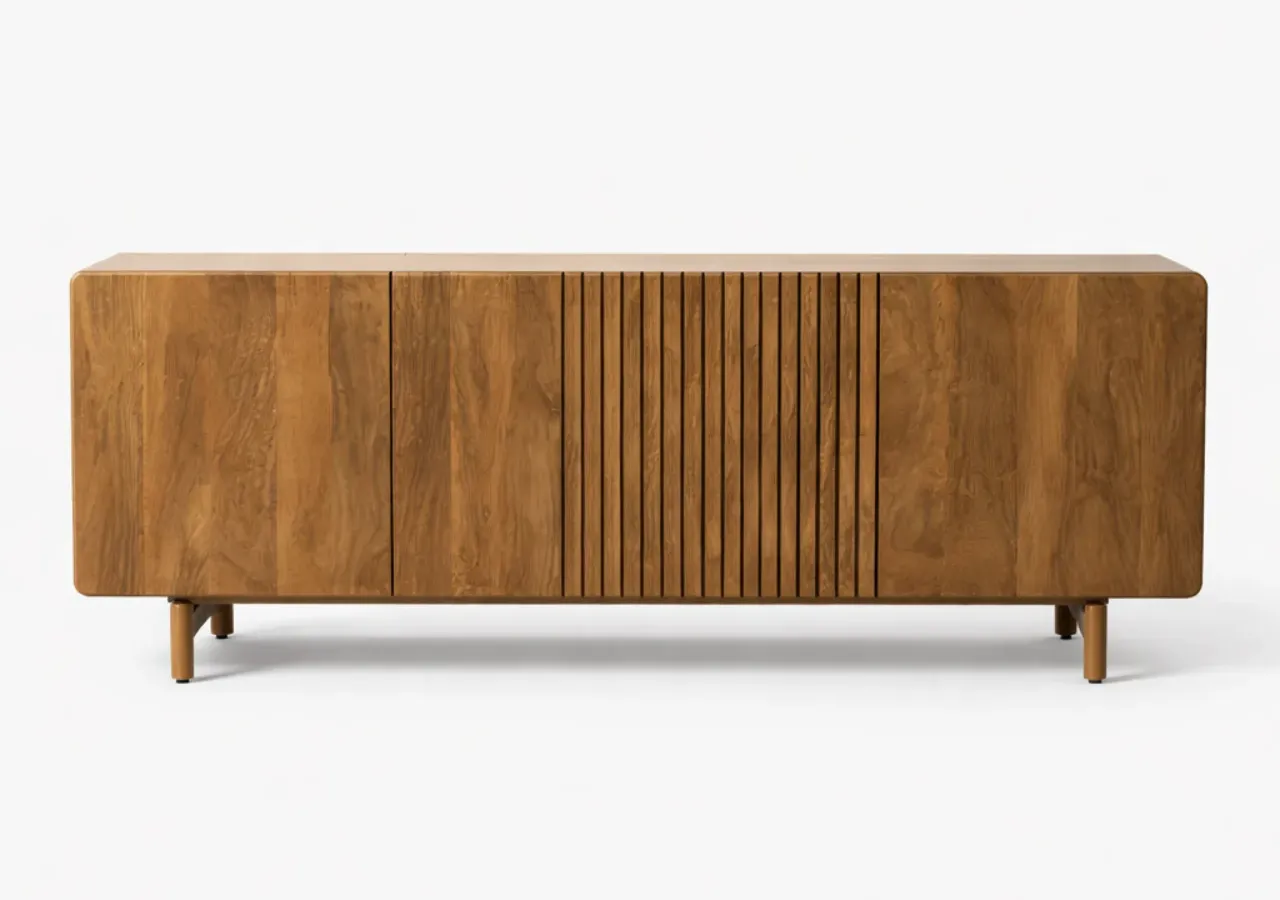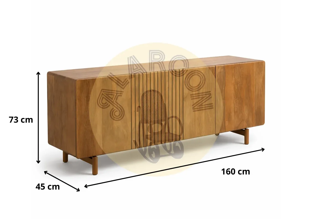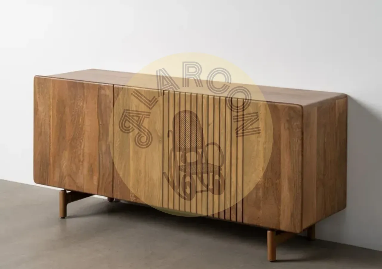 Este aparador de madera de mango destaca por su diseño moderno y su presencia sólida, ideal para interiores que buscan estilo y funcionalidad sin excesos. Su estructura robusta y líneas limpias lo convierten en una pieza protagonista para salones o comedores contemporáneos.