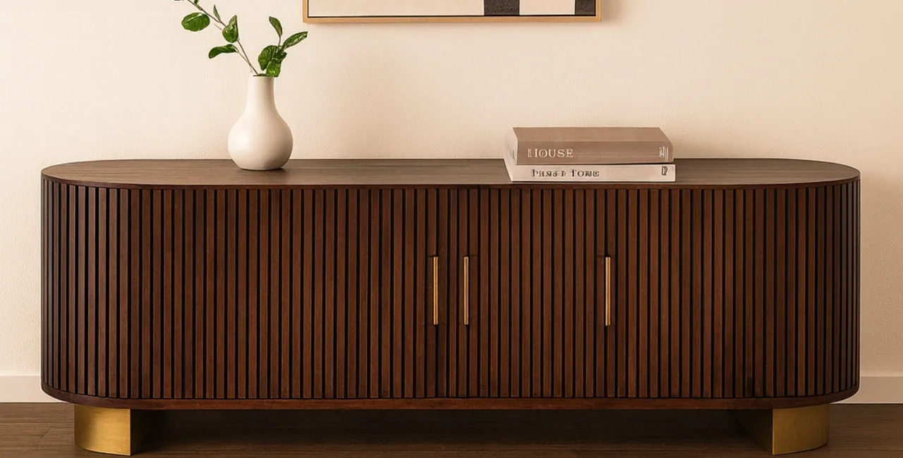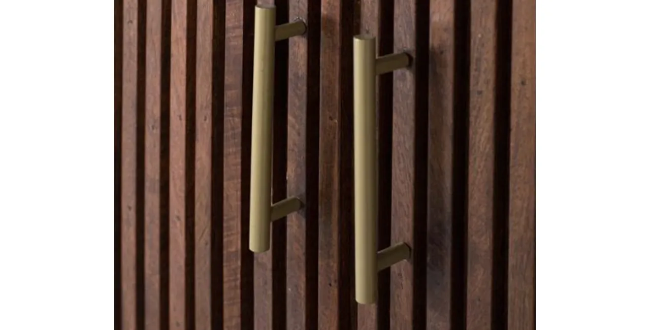 Con unas medidas de 160 cm de largo, 51 cm de alto y 40 cm de ancho, incorpora tres puertas con listones verticales y estantes interiores amplios que facilitan un almacenamiento práctico y ordenado. Los tiradores metálicos dorados añaden un toque distintivo que complementa su diseño.