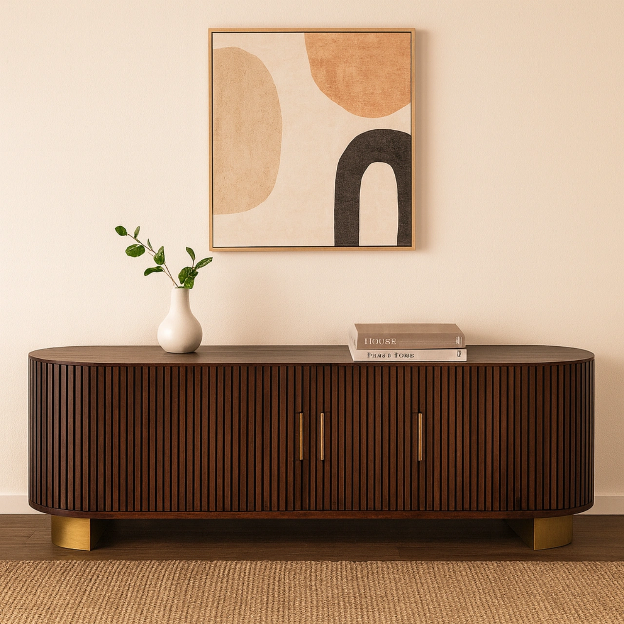 La base metálica en tono dorado aporta estabilidad, ligereza visual y un acabado sofisticado, convirtiendo este aparador en una pieza ideal para salones modernos que buscan calidez, diseño y funcionalidad en un solo mueble.