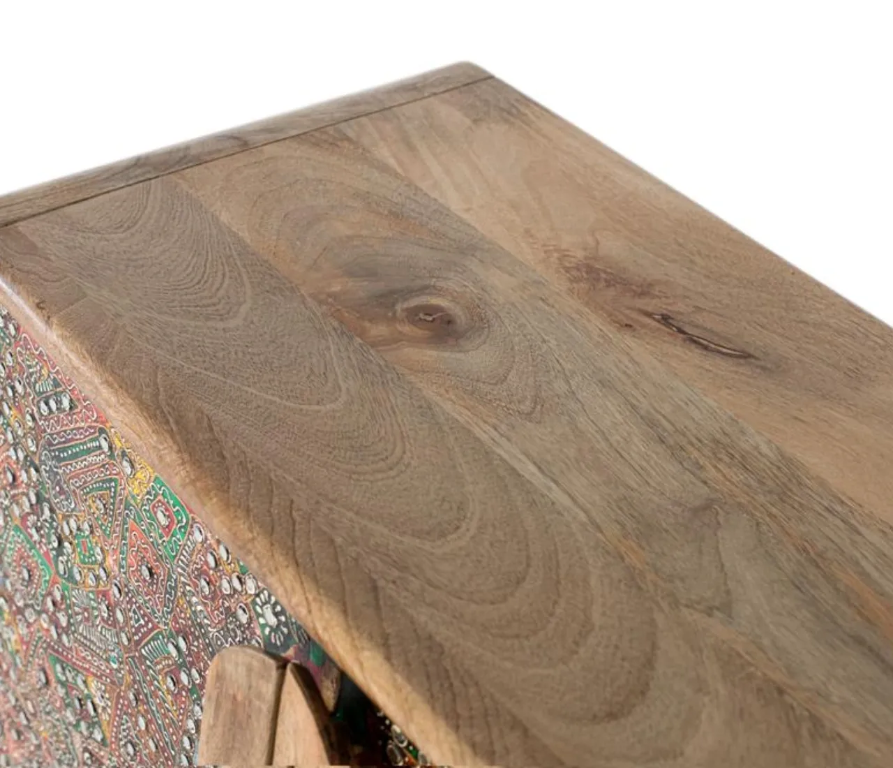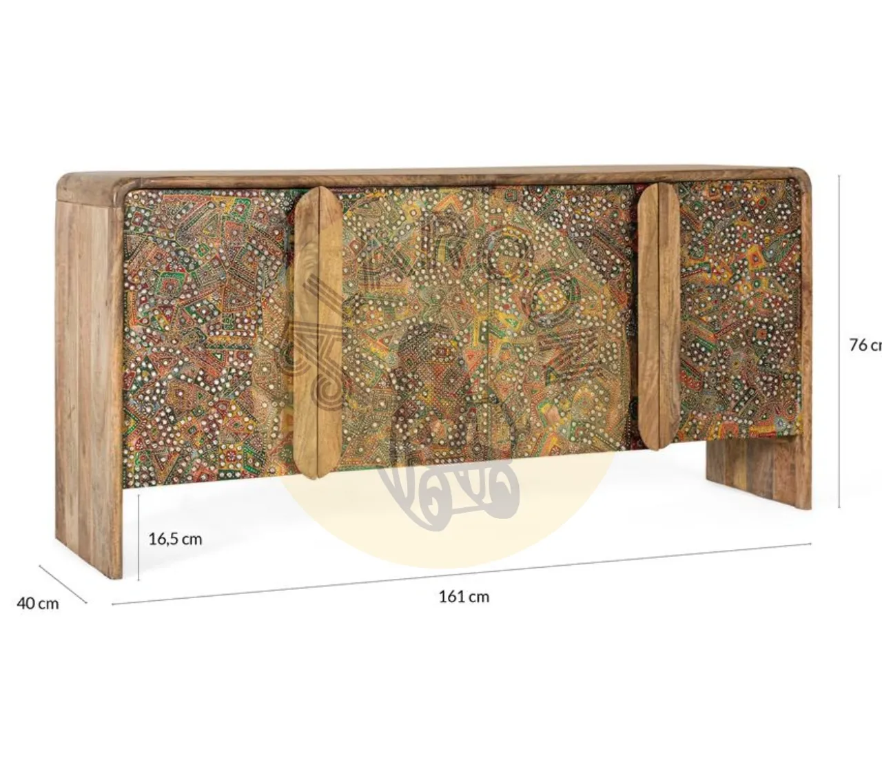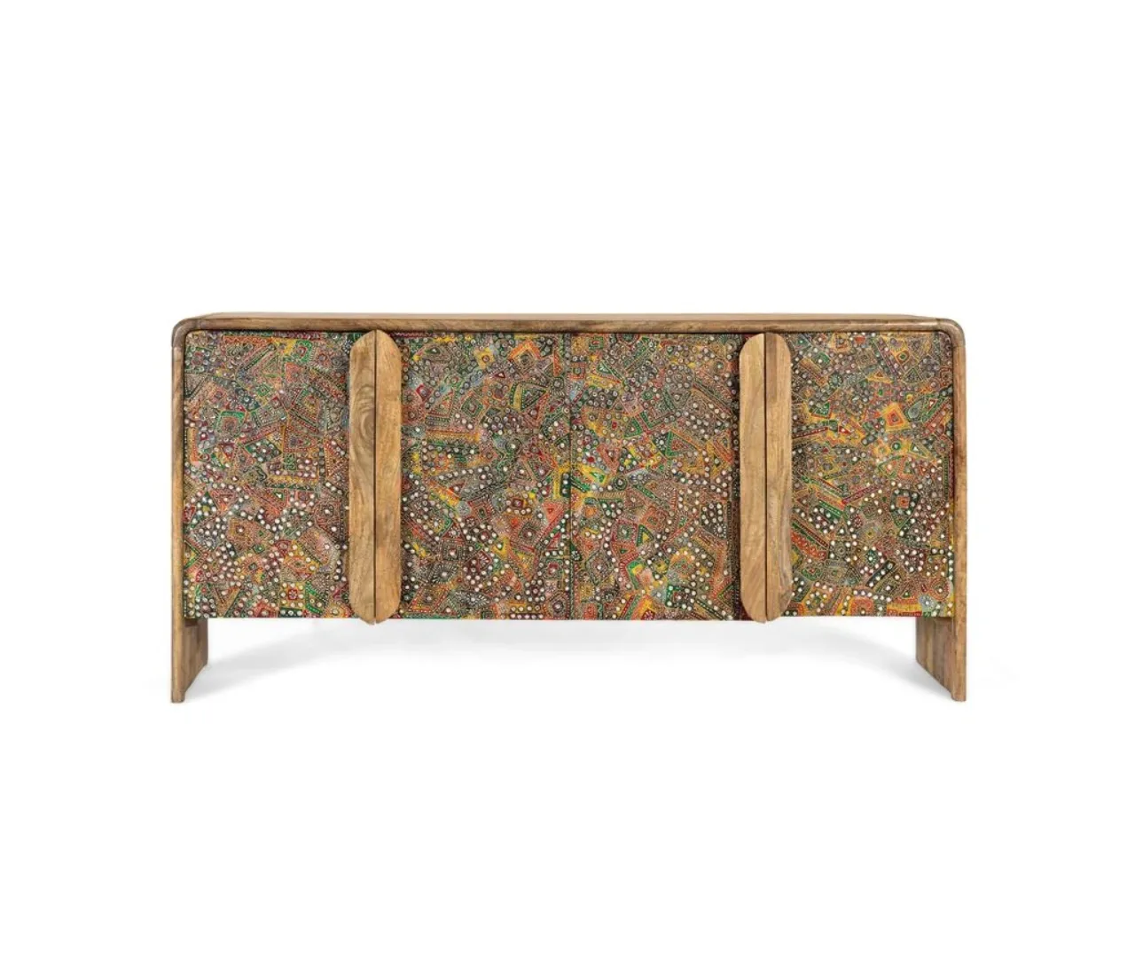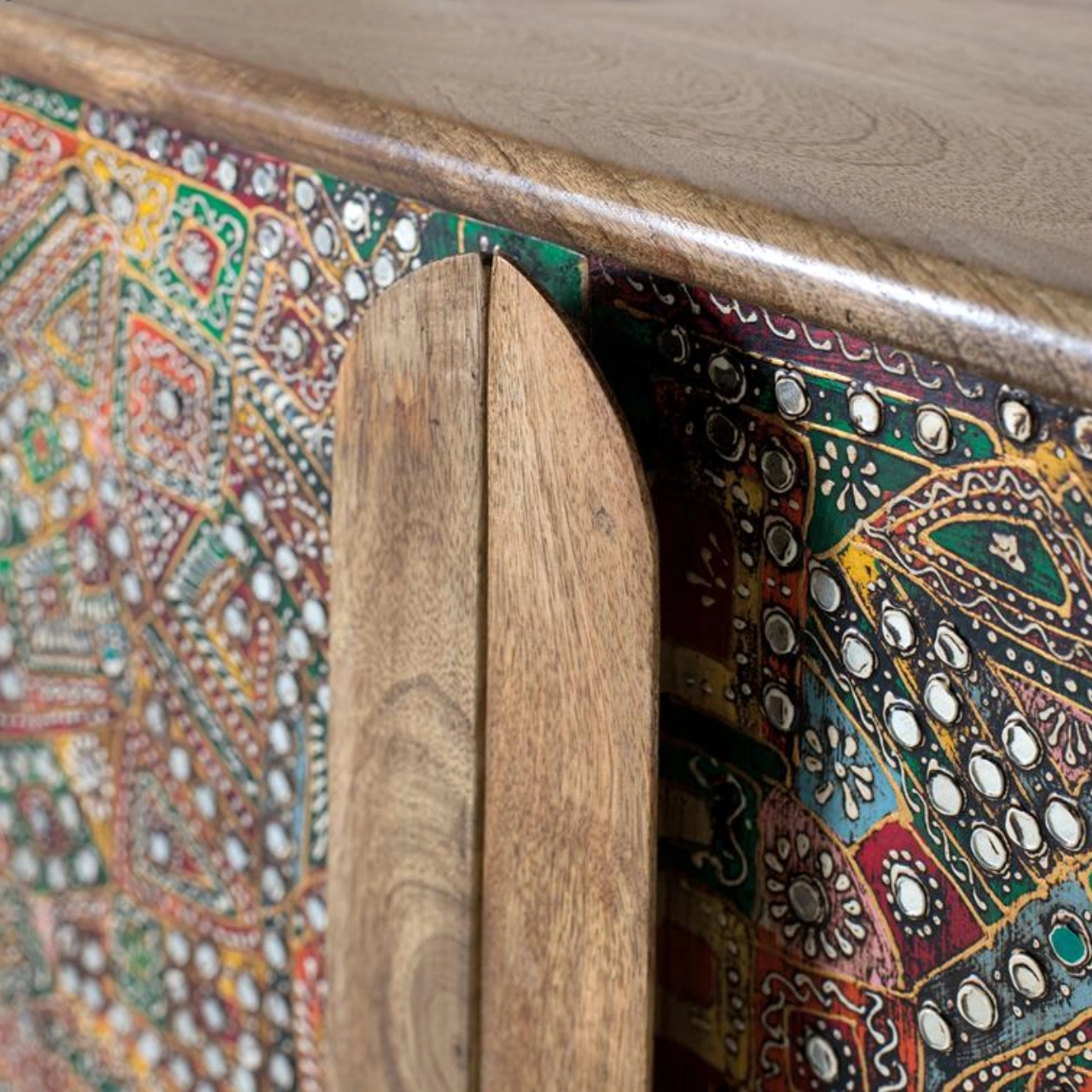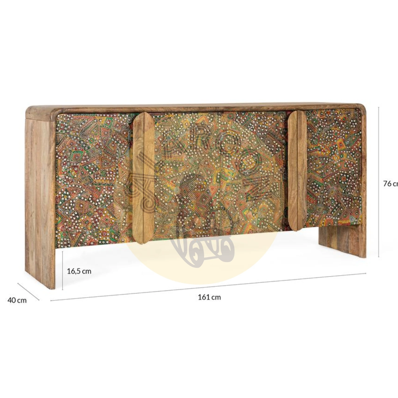 Aporta carácter y autenticidad a tu hogar con este aparador de madera de mango, una pieza única que combina el acabado natural con frentes artesanales multicolor. Su diseño de estilo étnico realza la estética del salón o comedor, convirtiéndose en un elemento decorativo que eleva cualquier ambiente con personalidad y calidez.