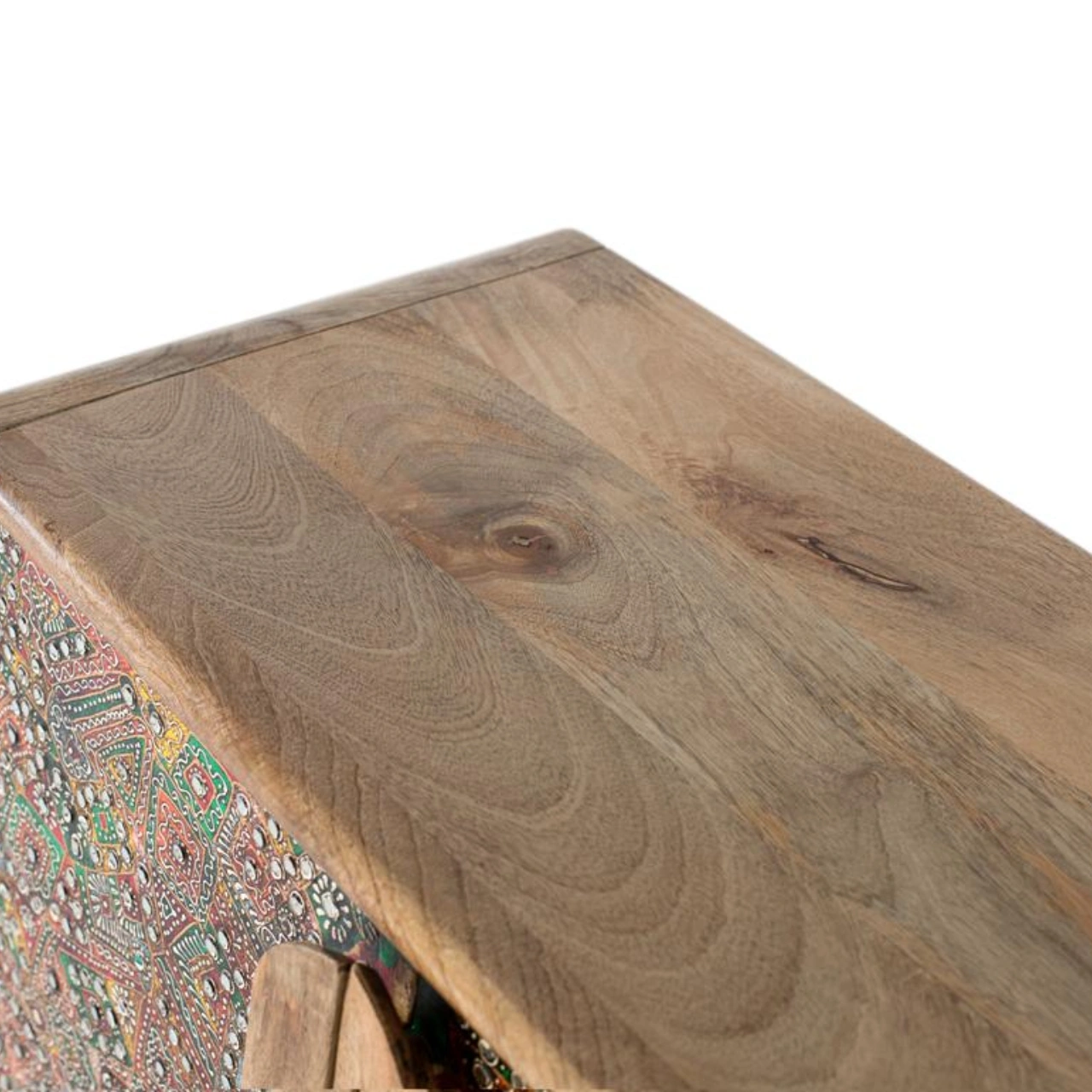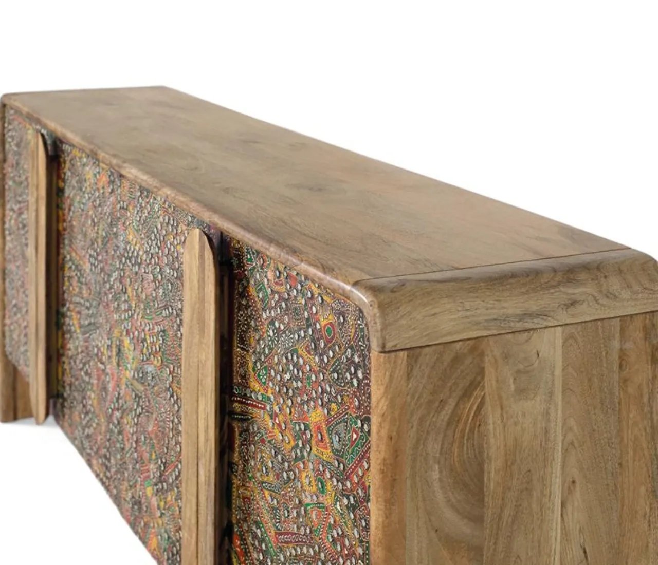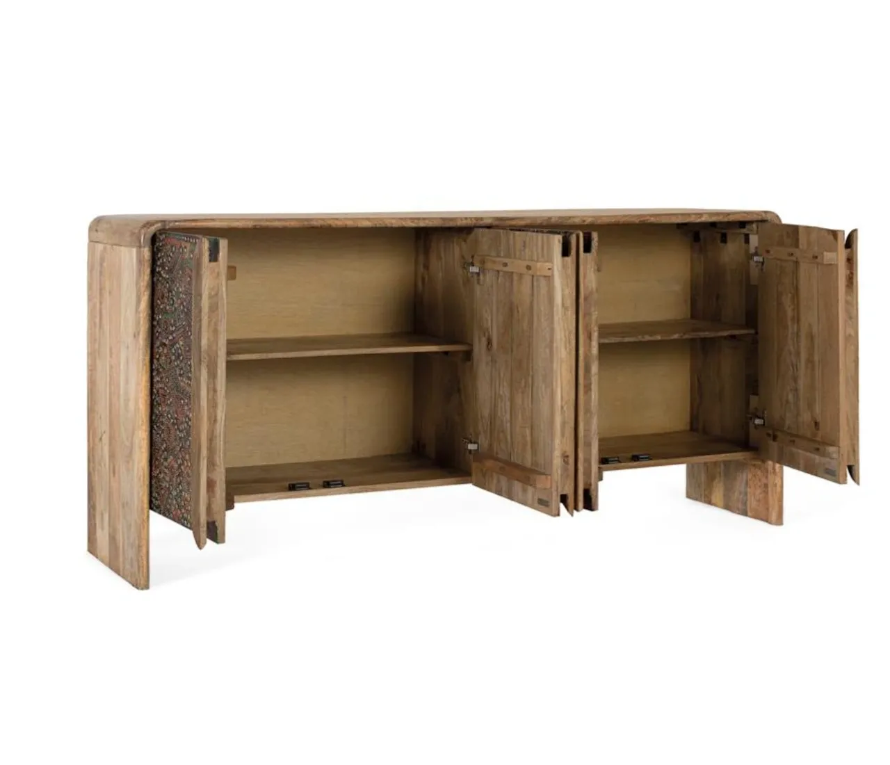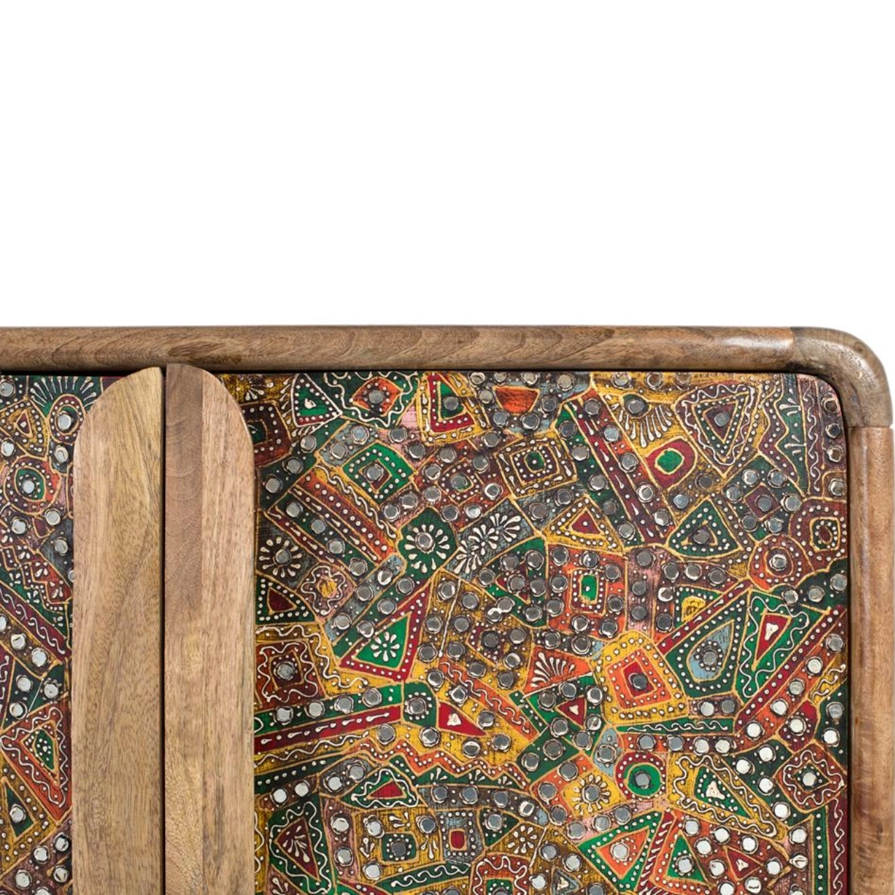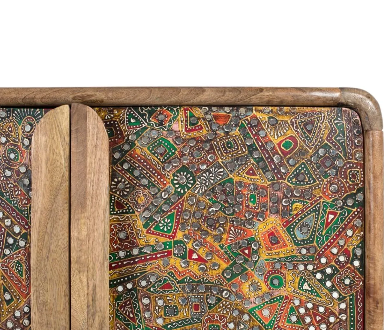 Aporta carácter y autenticidad a tu hogar con este aparador de madera de mango, una pieza única que combina el acabado natural con frentes artesanales multicolor. Su diseño de estilo étnico realza la estética del salón o comedor, convirtiéndose en un elemento decorativo que eleva cualquier ambiente con personalidad y calidez.