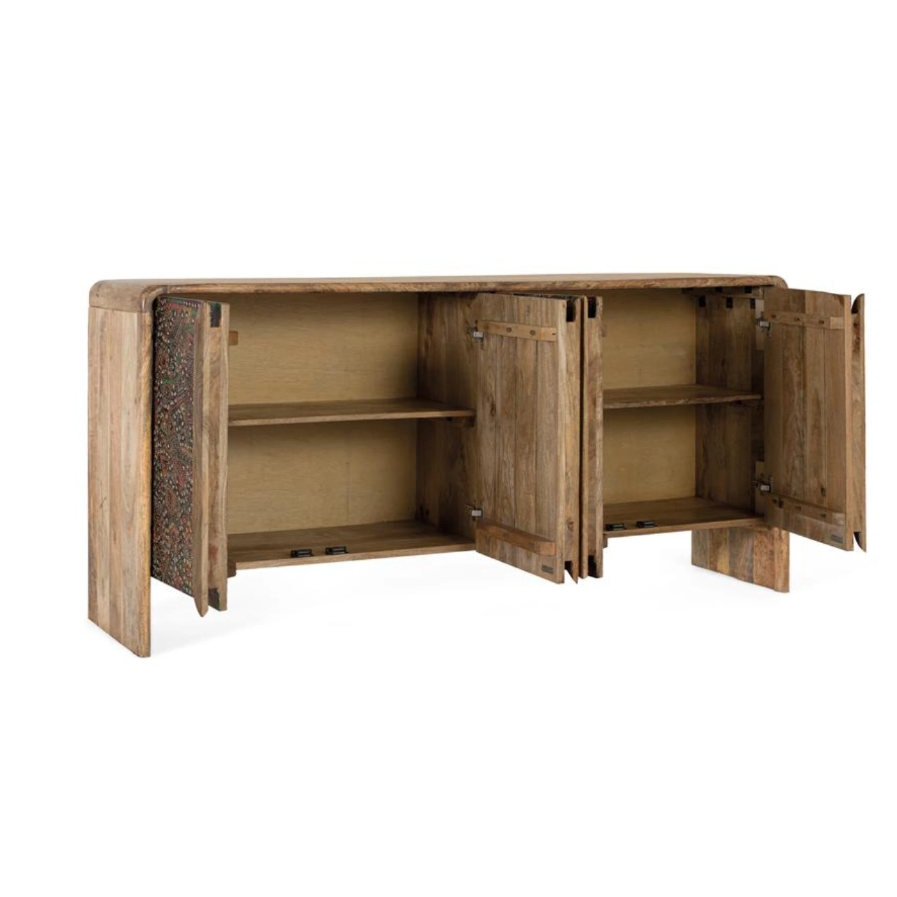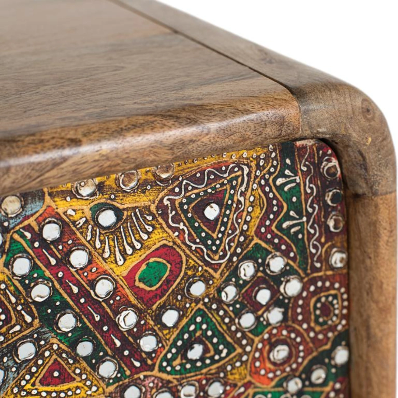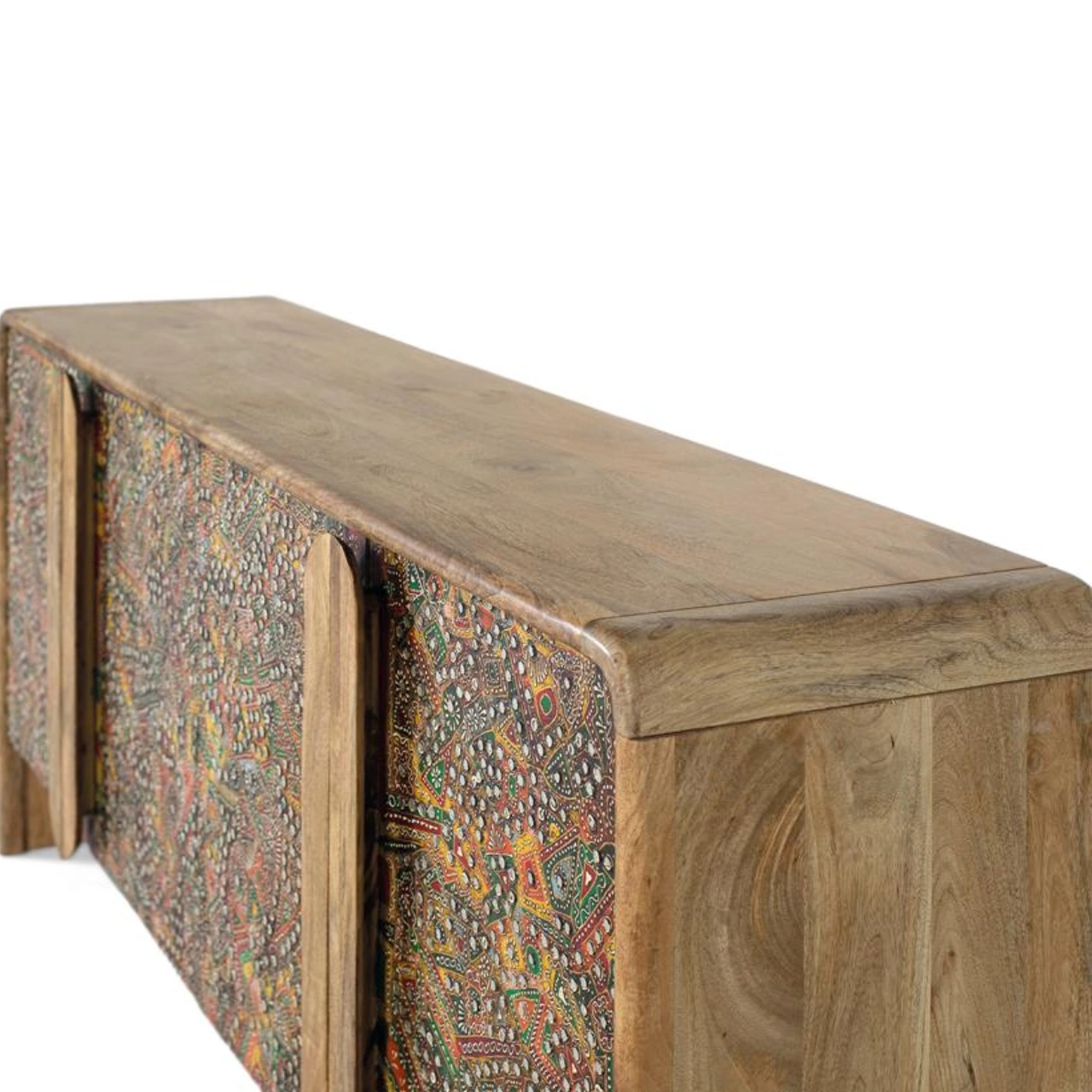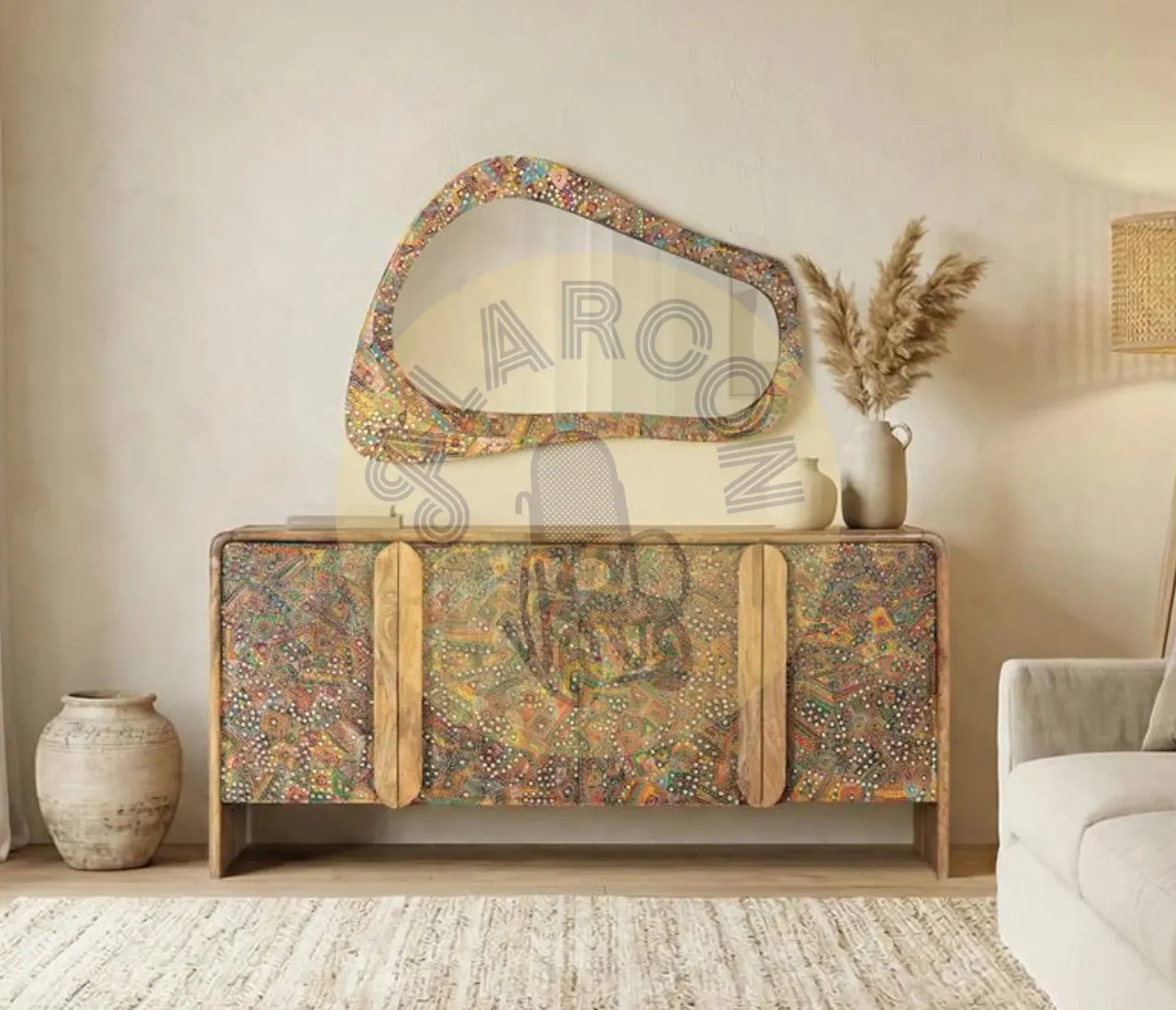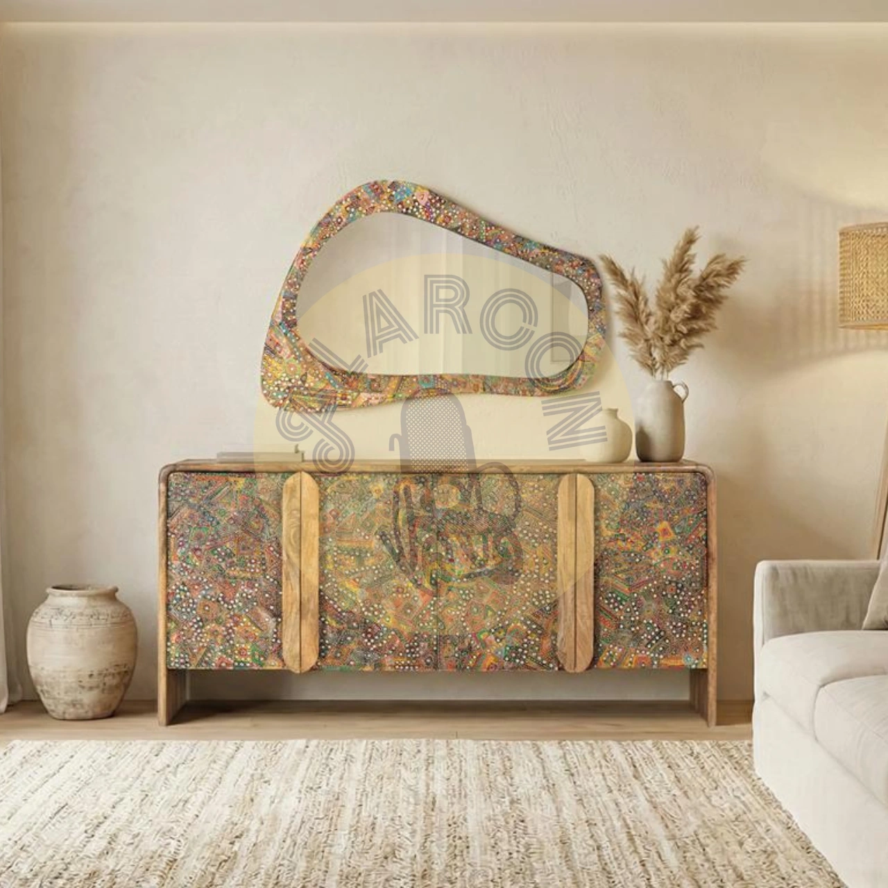 Aporta carácter y autenticidad a tu hogar con este aparador de madera de mango, una pieza única que combina el acabado natural con frentes artesanales multicolor. Su diseño de estilo étnico realza la estética del salón o comedor, convirtiéndose en un elemento decorativo que eleva cualquier ambiente con personalidad y calidez.