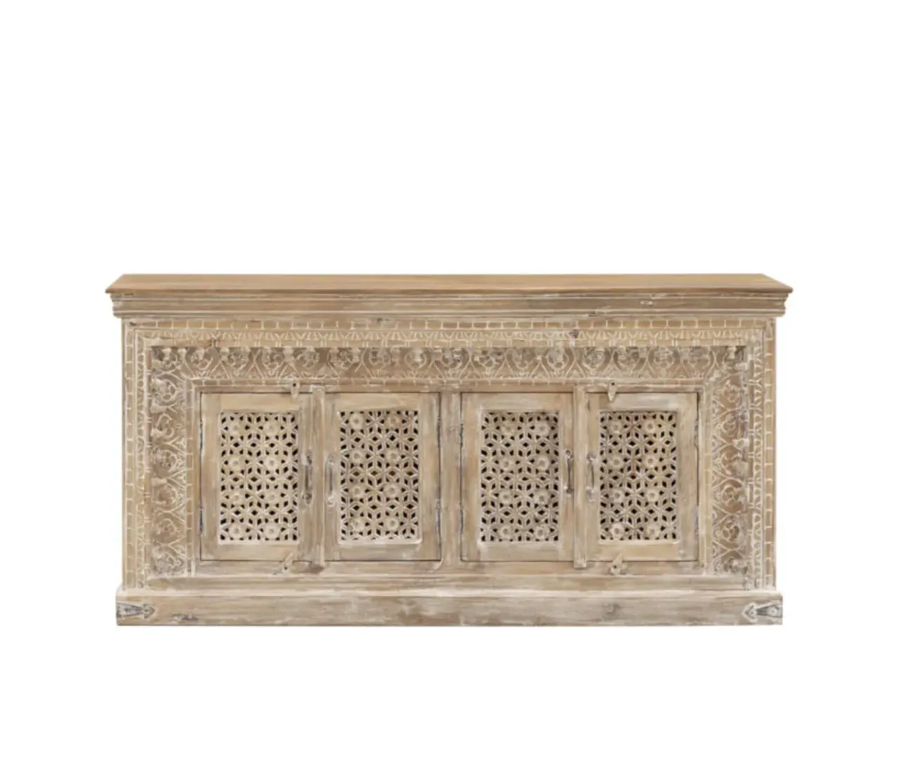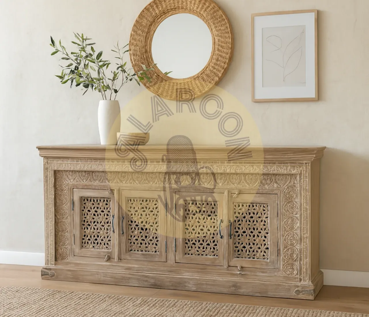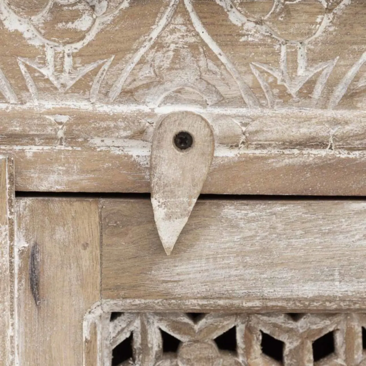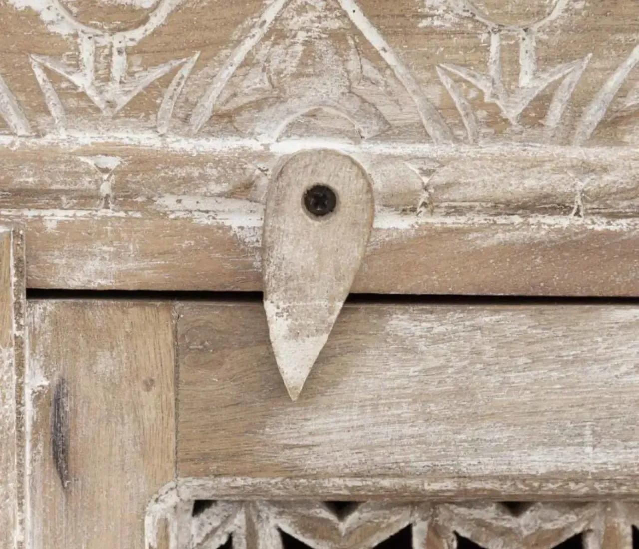 El aparador de madera de mango tallado a mano destaca por su acabado natural y sus delicados detalles artesanales que aportan carácter y autenticidad a cualquier espacio. Su diseño refleja un estilo rústico bohemio, ideal para quienes buscan un mueble con personalidad y calidez.