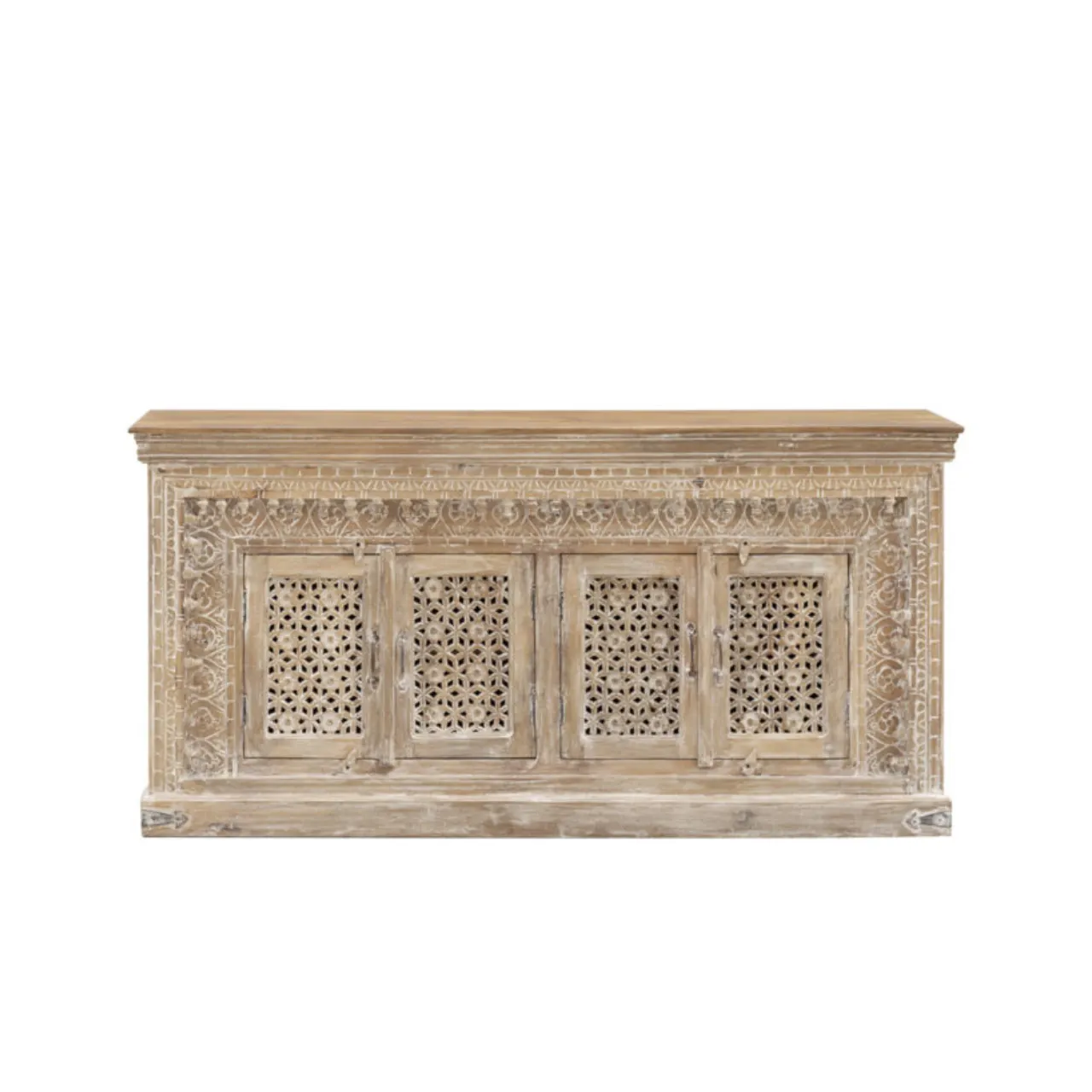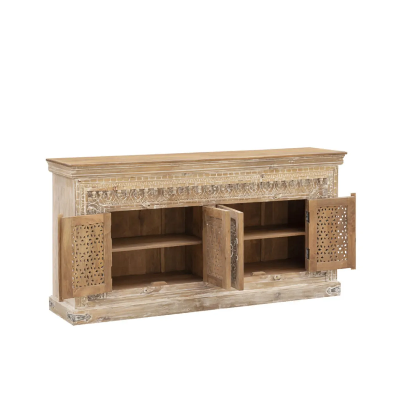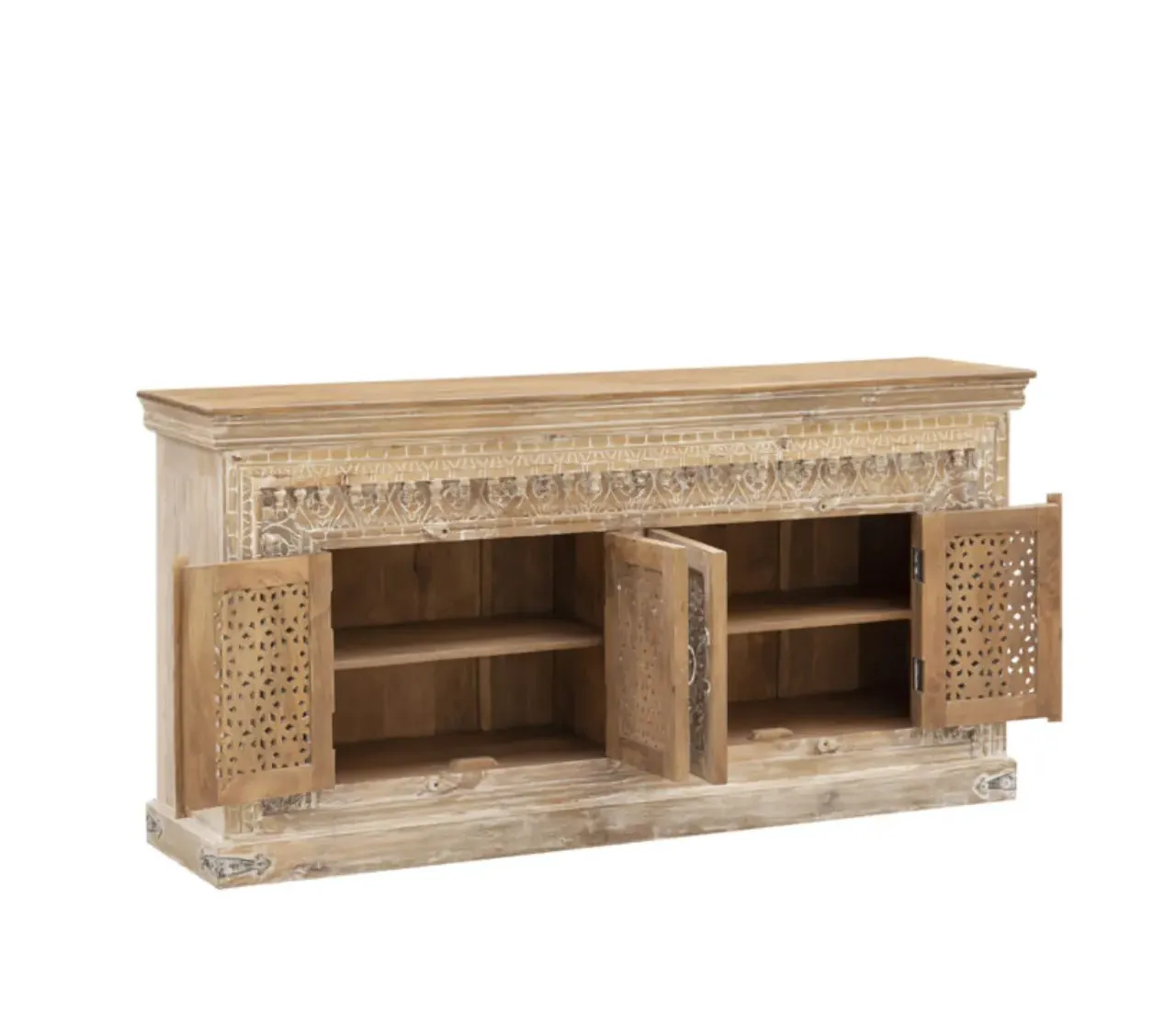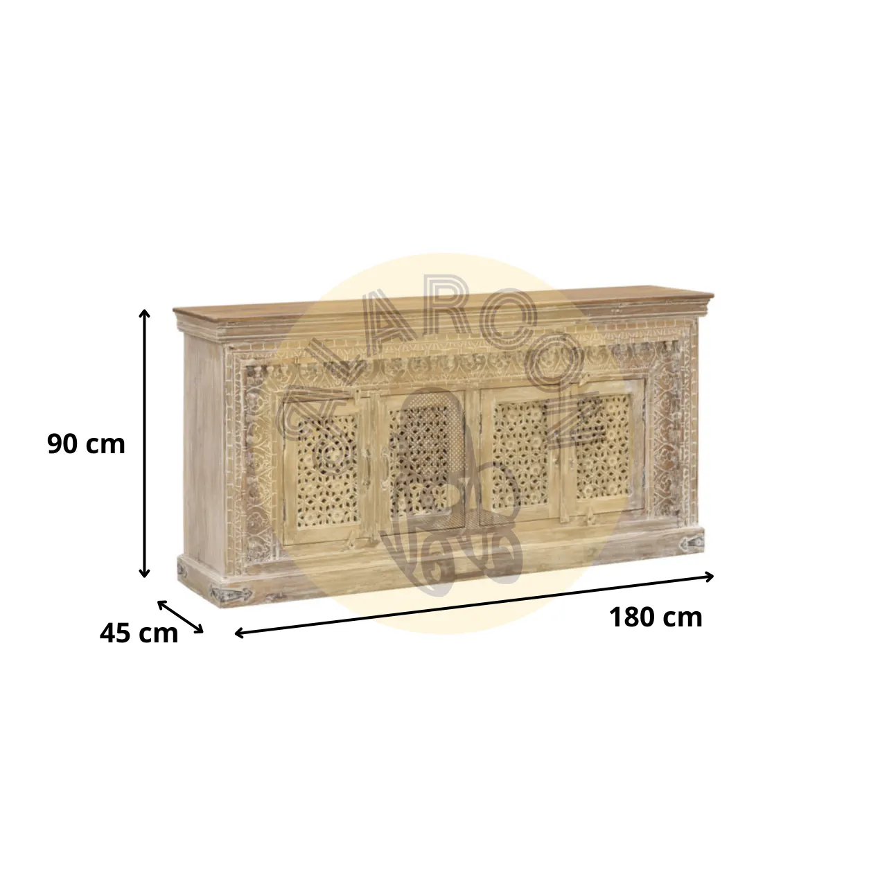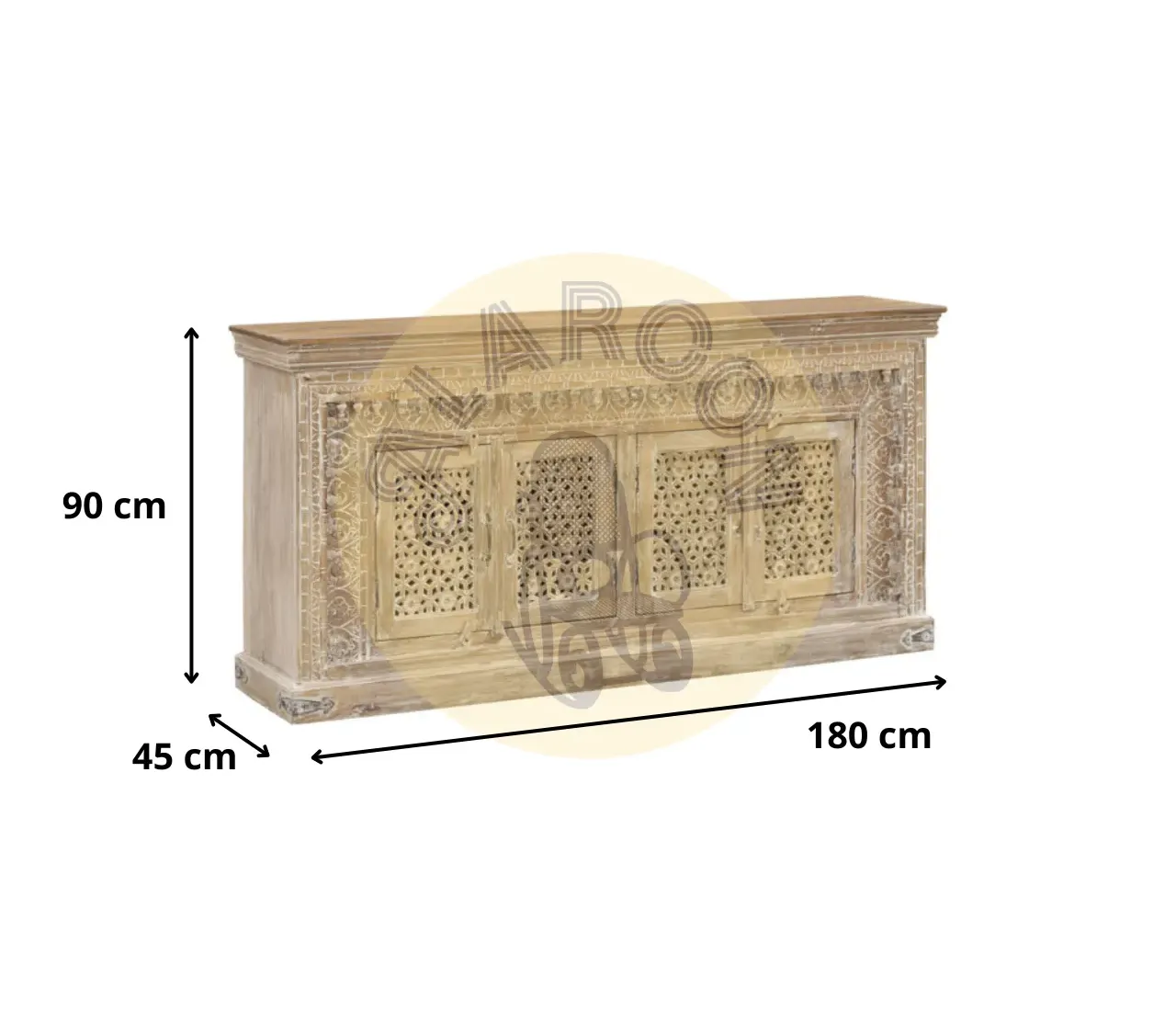 Con unas medidas de 180 x 45 x 90 cm, ofrece un amplio espacio de almacenamiento gracias a sus cuatro puertas con tallados decorativos, perfectas para mantener el orden sin renunciar al estilo. Su estructura sólida y el toque envejecido del acabado lo convierten en una pieza única y duradera.