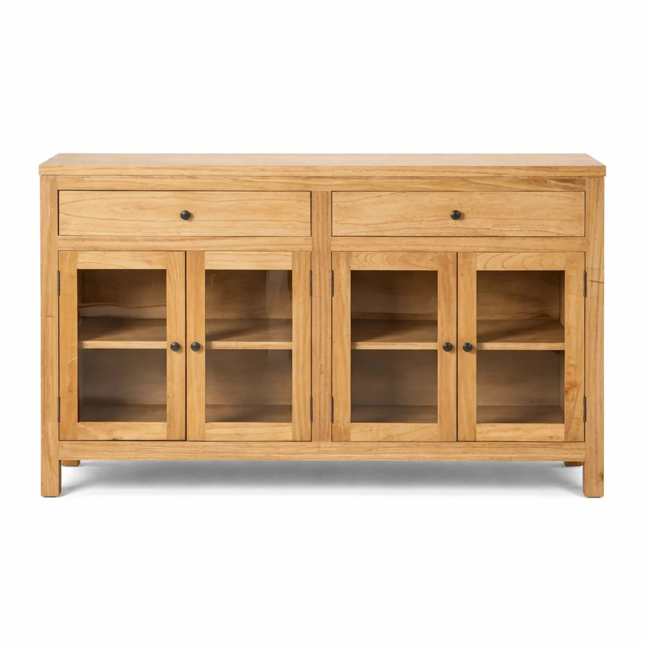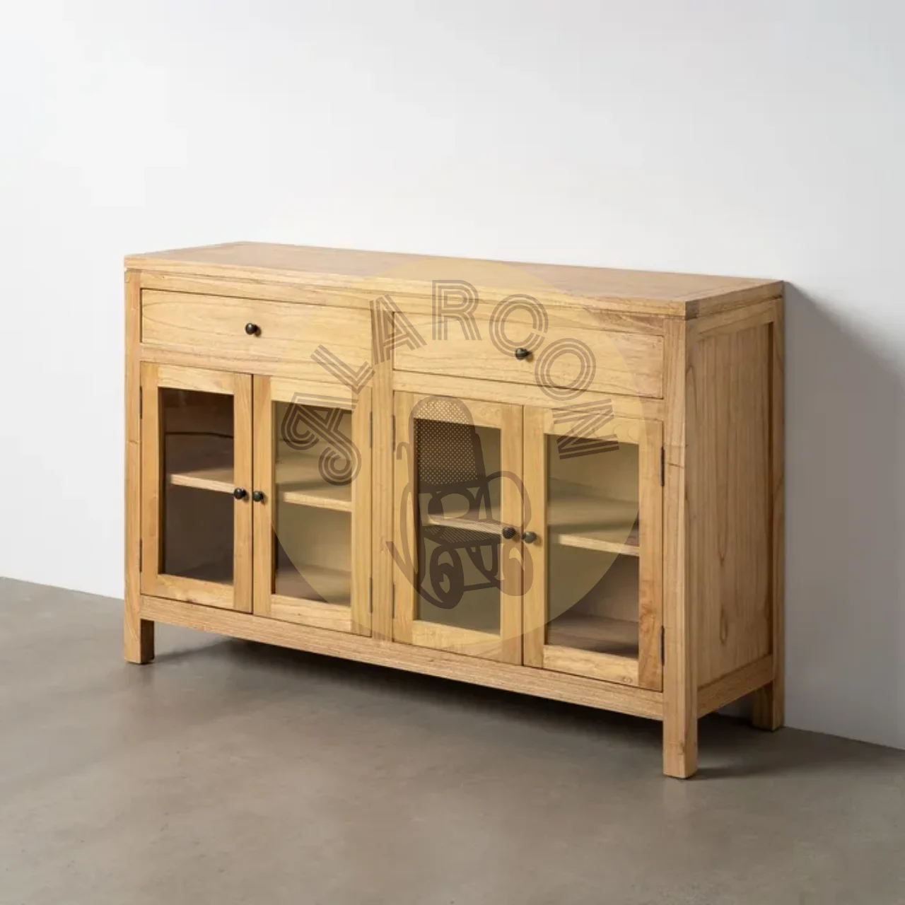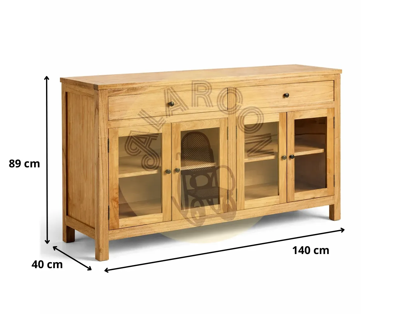 Fabricado en madera de mindi, este aparador de color natural destaca por su diseño limpio y atemporal, ideal para integrar en salón o comedor con un estilo actual y bien definido. Las puertas de cristal aportan ligereza visual y permiten mostrar el contenido con orden y elegancia.