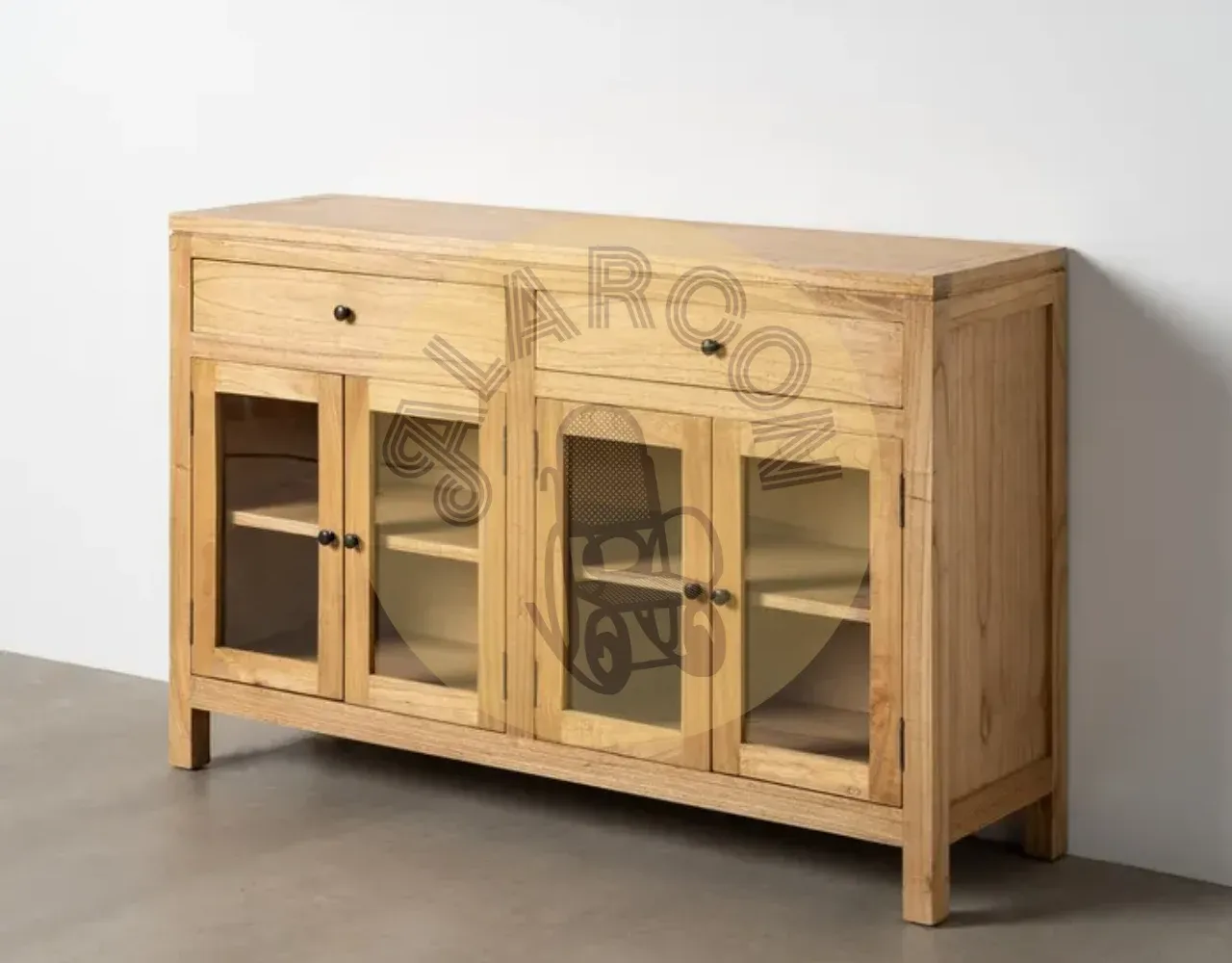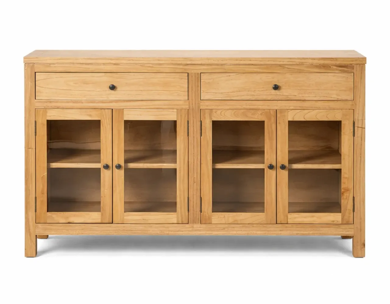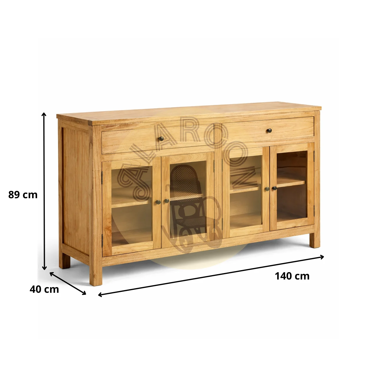 Fabricado en madera de mindi, este aparador de color natural destaca por su diseño limpio y atemporal, ideal para integrar en salón o comedor con un estilo actual y bien definido. Las puertas de cristal aportan ligereza visual y permiten mostrar el contenido con orden y elegancia.