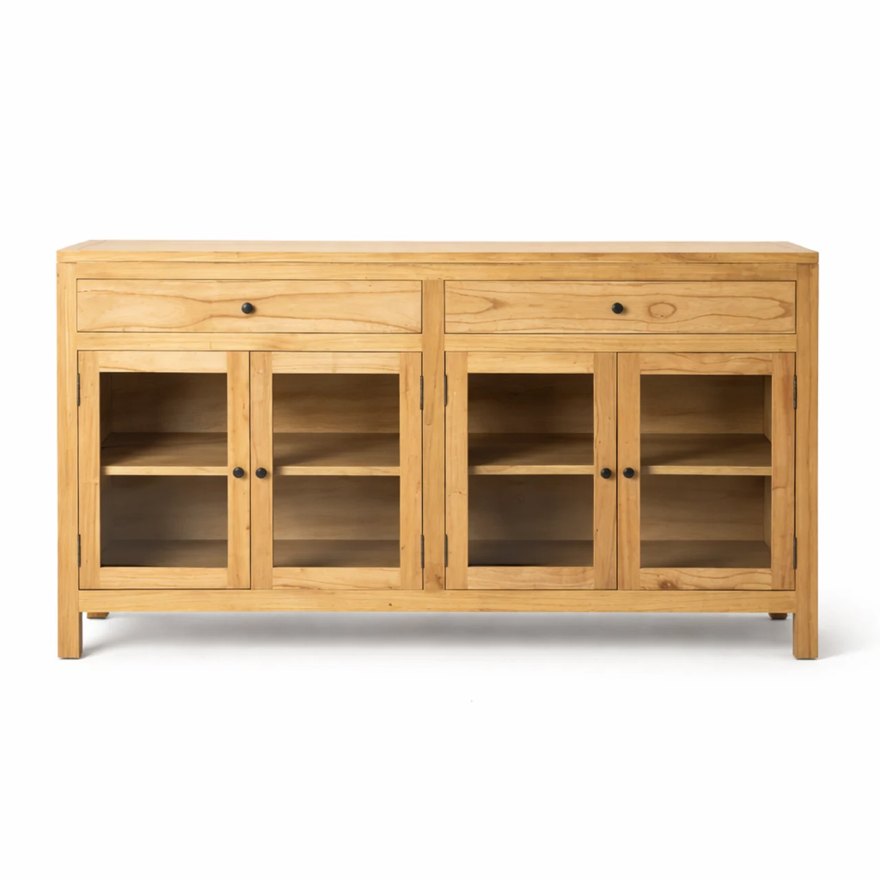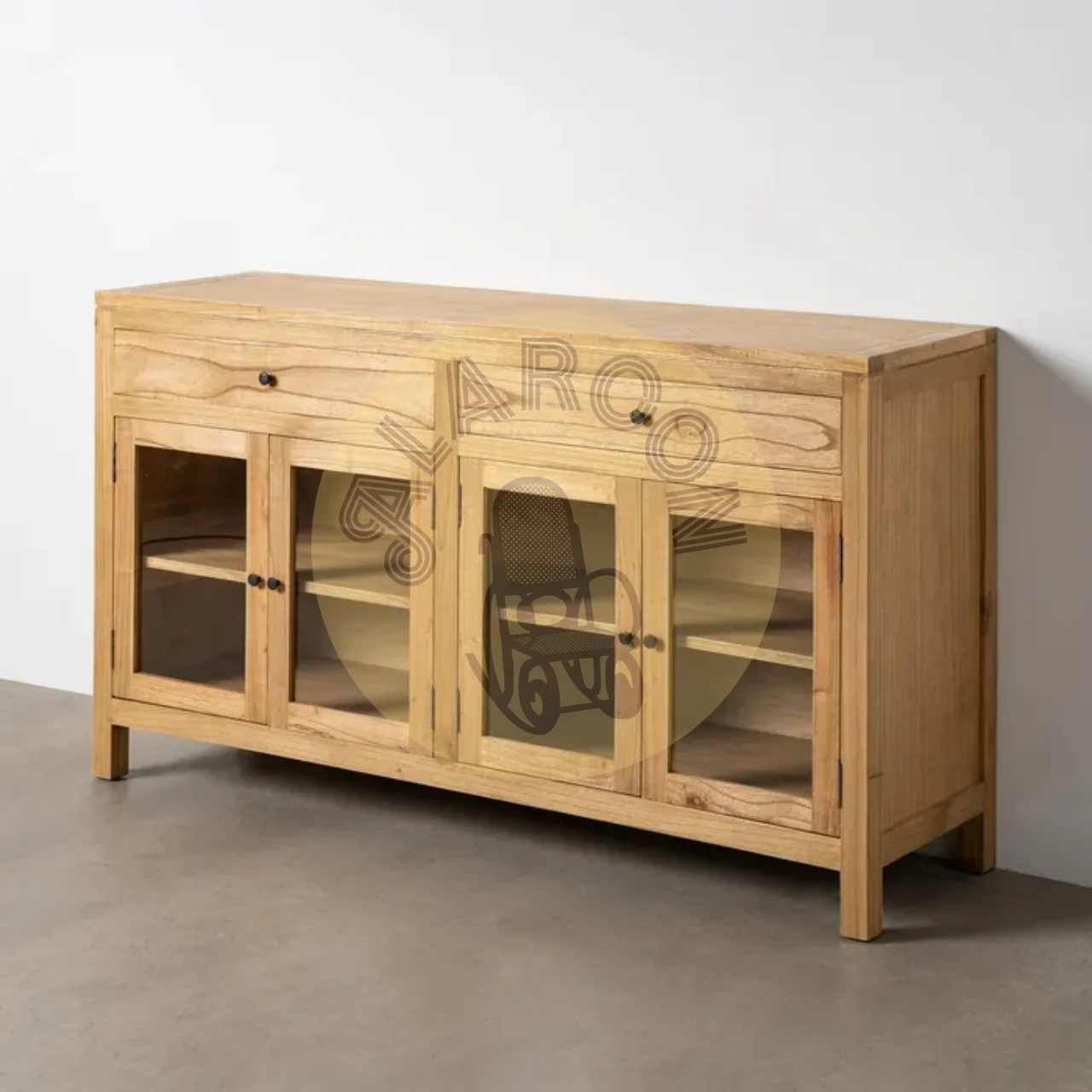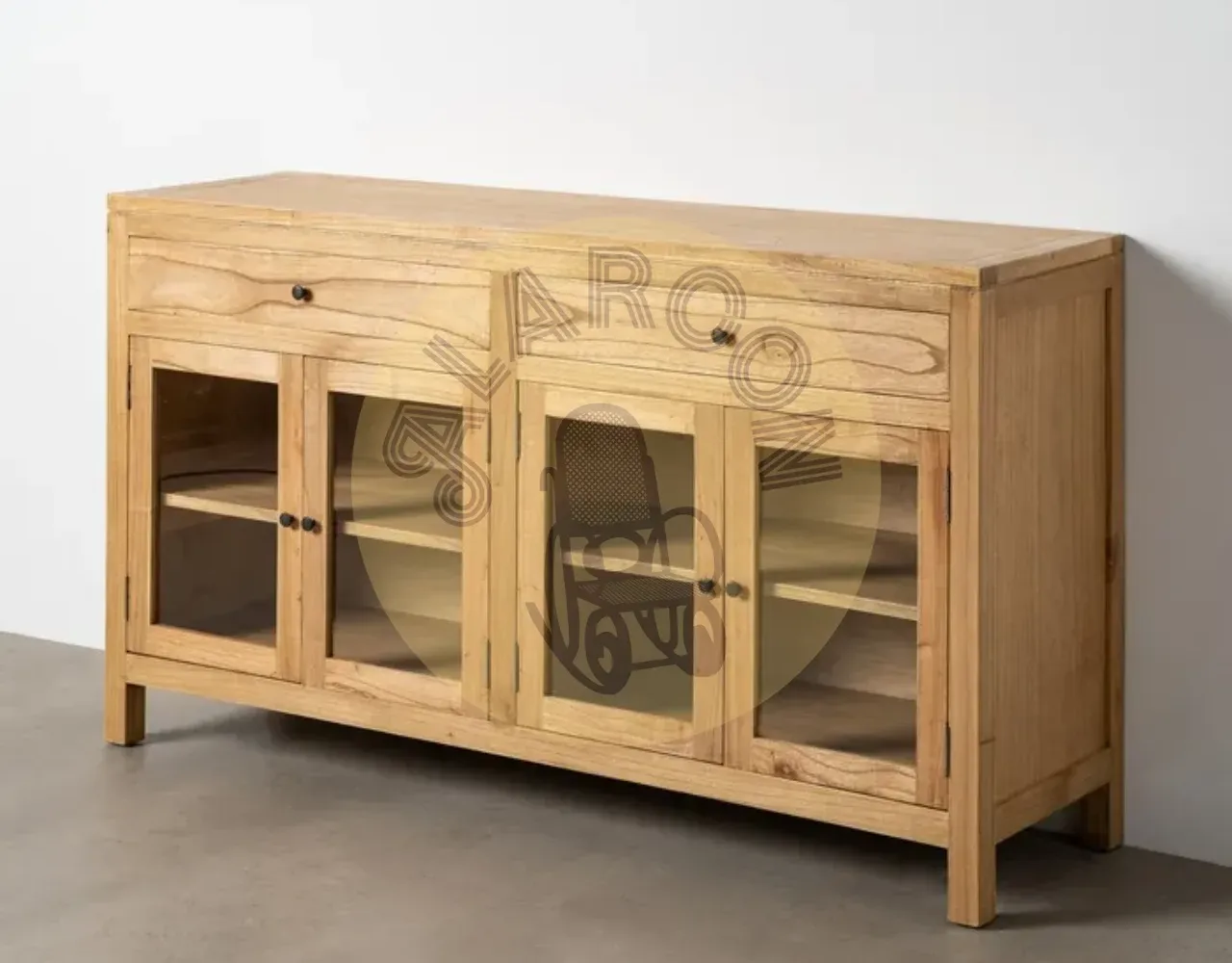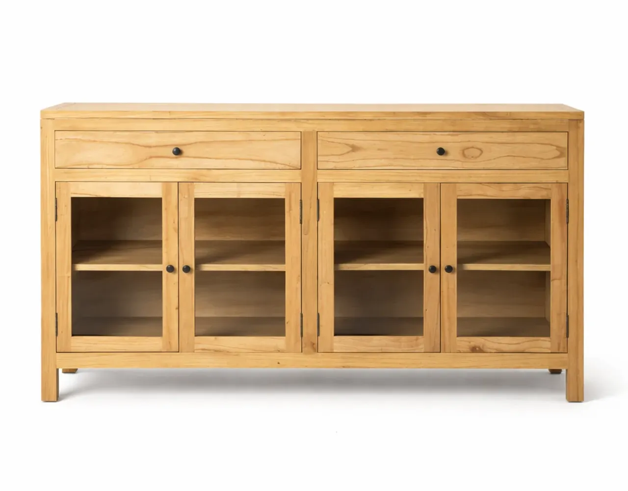 Su diseño ofrece almacenaje práctico gracias a los cajones de 62 x 11,5 cm y las puertas de cristal de 31 x 50,5 cm, ideales para mantener el orden y mostrar vajilla u objetos decorativos con elegancia. La estructura sólida y las patas elevadas facilitan la limpieza y aportan ligereza visual al conjunto.