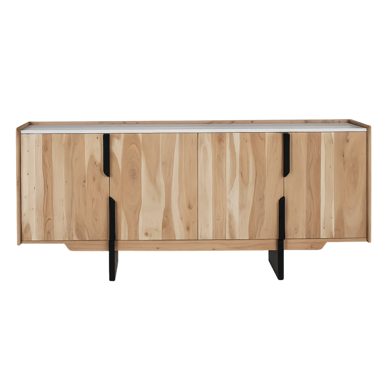 Su estructura con cuatro puertas de superficie lisa esconde un interior práctico con baldas funcionales, ideales para mantener el orden y aprovechar al máximo la capacidad de almacenamiento. El detalle de las patas metálicas en color negro aporta un contraste moderno y distintivo que realza su estilo.