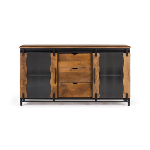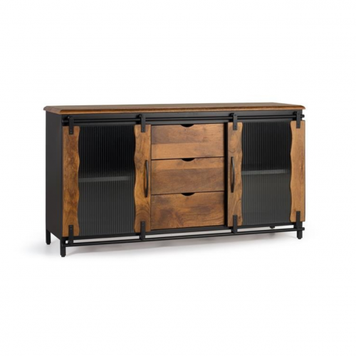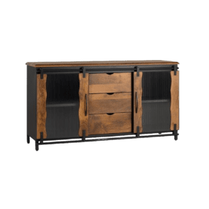 Apreciado en estilo industrial, nuestro aparador posee dos puertas correderas y tres cajones, brindando un diseño práctico y estilizado ideal para aquellas personas que valoran la funcionalidad y estética en los muebles. Se ha fabricado utilizando madera de mango de alta calidad y metal resistente, lo que asegura su durabilidad y resistencia.