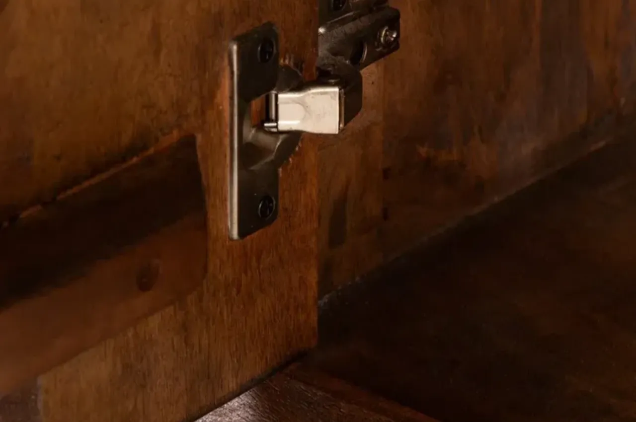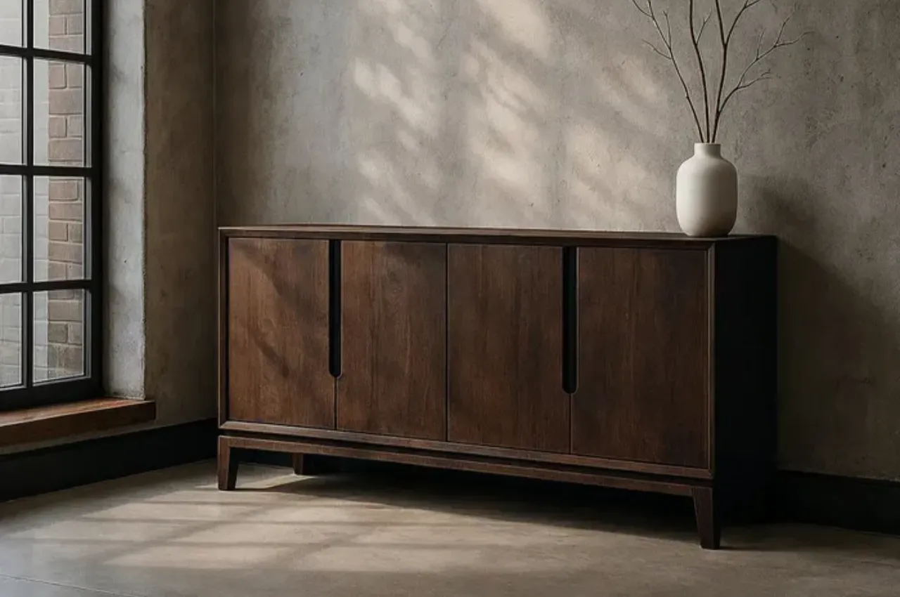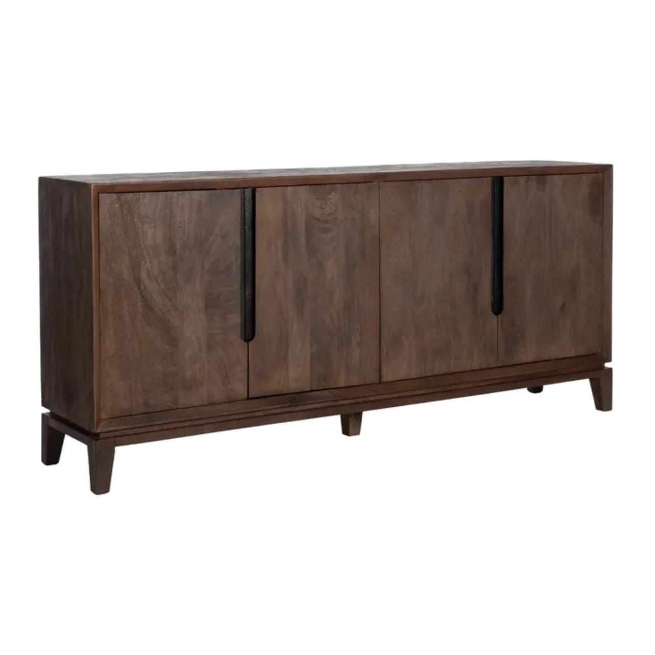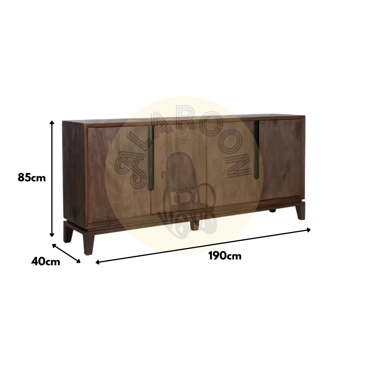 El aparador Kilian está fabricado en madera maciza de mango, un material resistente que realza las vetas naturales y aporta un estilo cálido y atemporal a cualquier estancia.