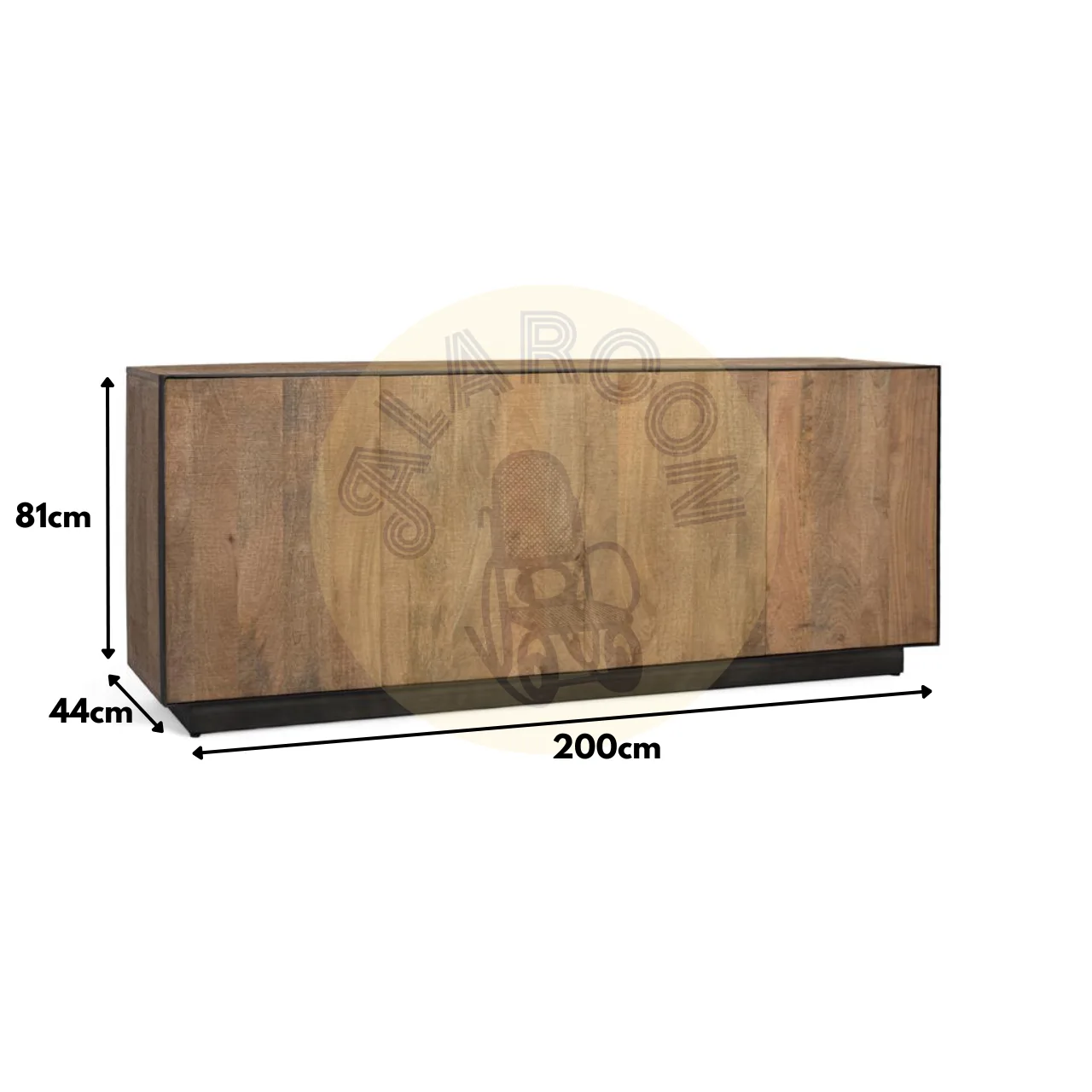 El perfil de metal negro que enmarca el cuerpo y el zócalo añade un contraste elegante con la madera, aportando un toque industrial y contemporáneo. Este aparador combina funcionalidad, diseño y calidad, convirtiéndose en una pieza clave para salones o comedores modernos.