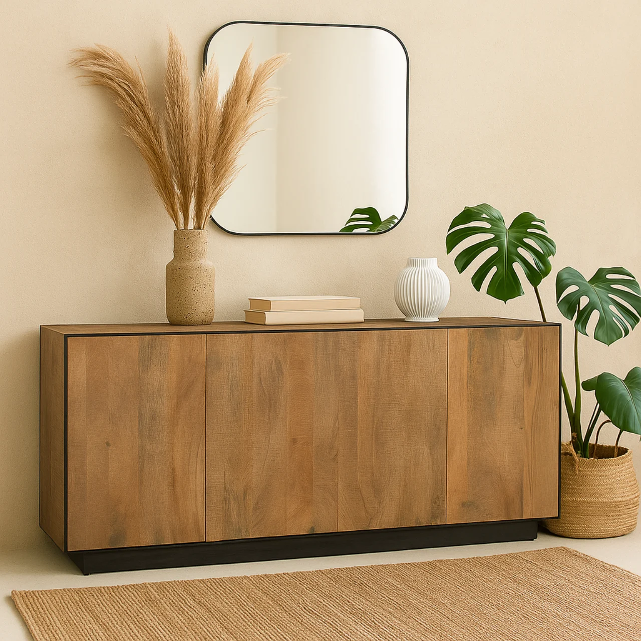 El aparador de 4 puertas destaca por su diseño minimalista y su fabricación en madera de mango natural, que resalta la textura y las vetas únicas de cada pieza. Su estética limpia se refuerza con el sistema de apertura push, que elimina la necesidad de tiradores y aporta un aspecto moderno y ordenado.