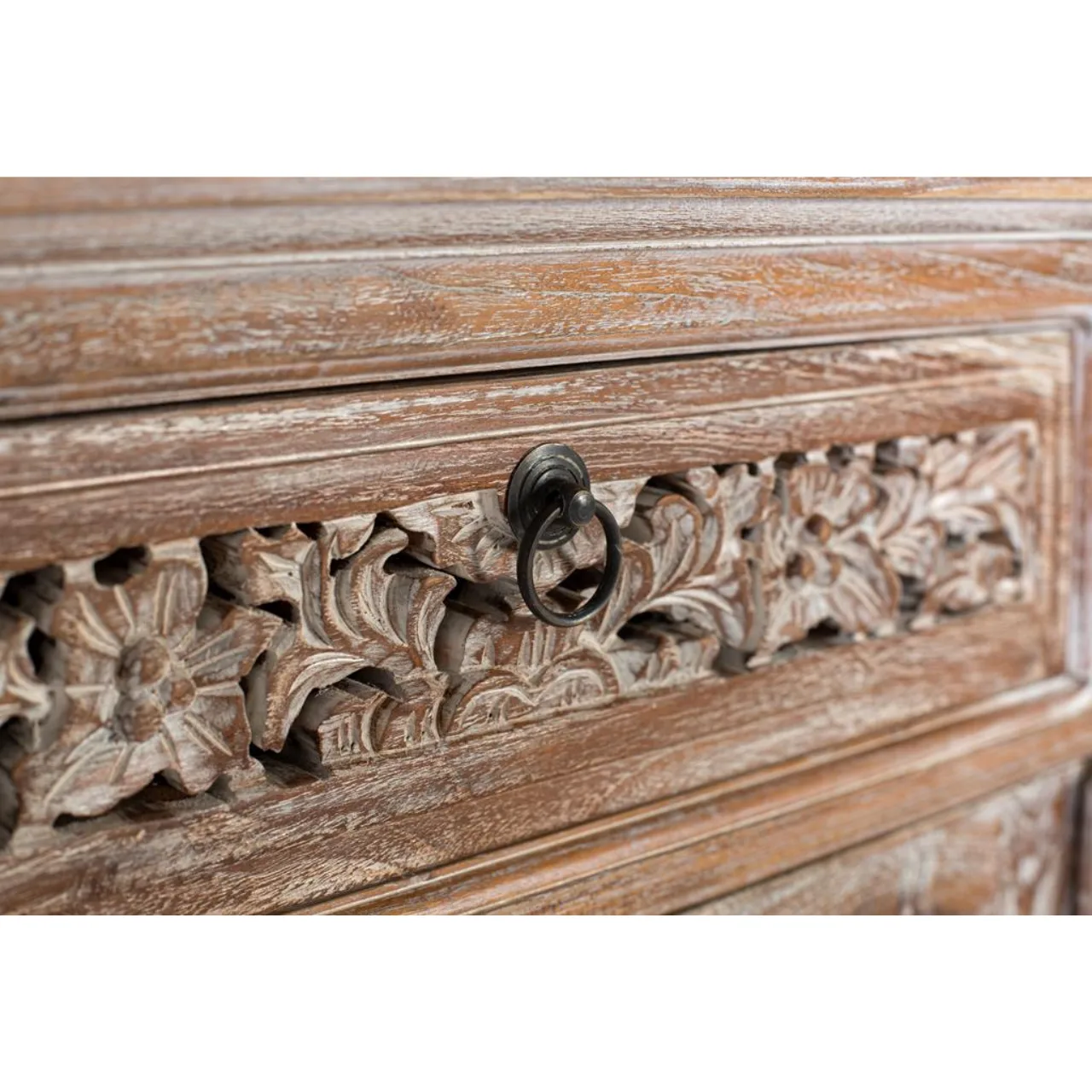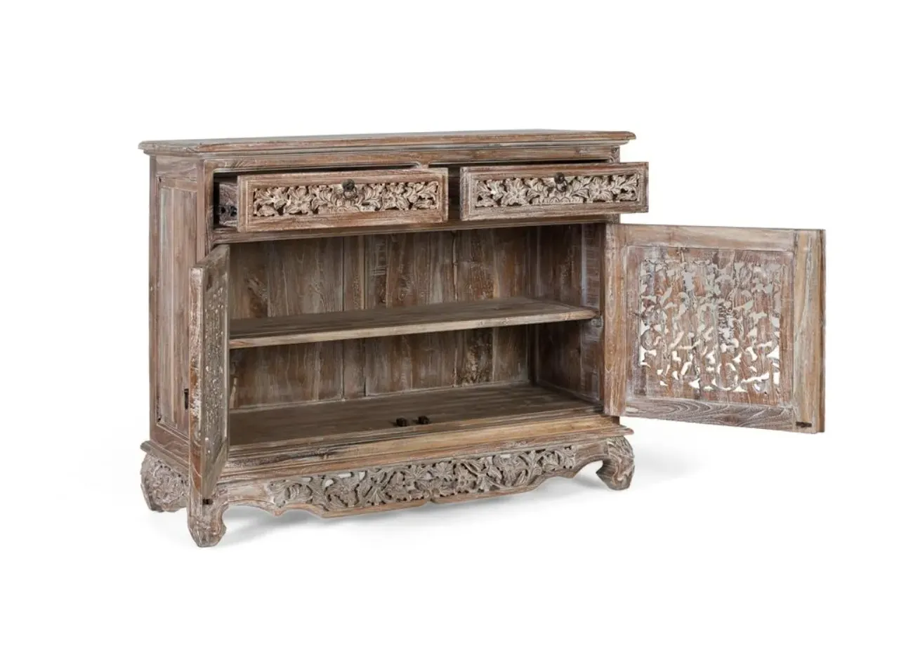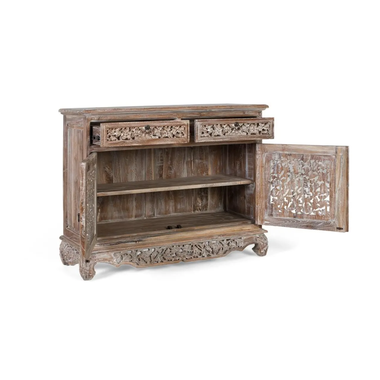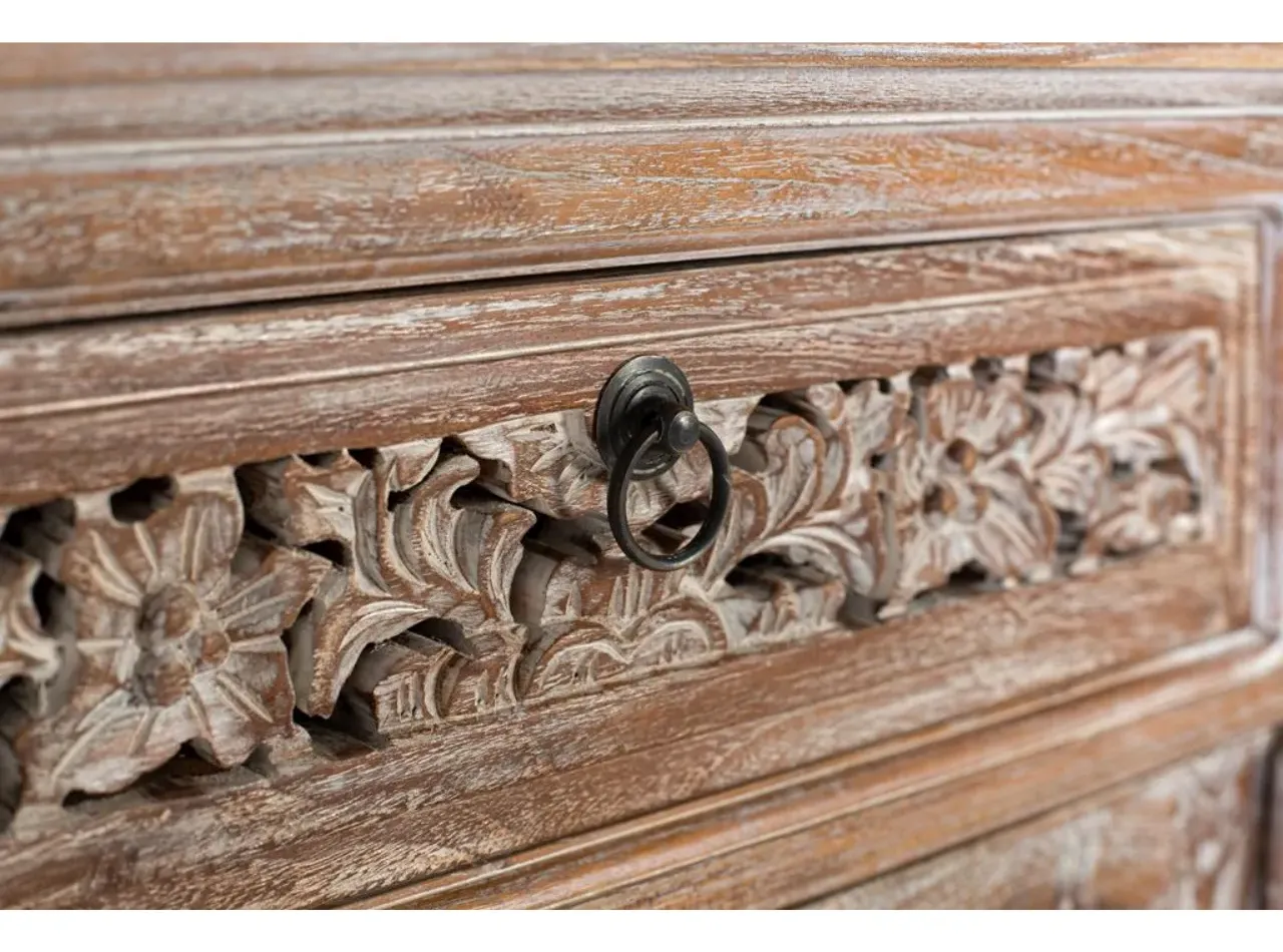 El aparador de madera maciza de teca destaca por su acabado blanco lavado, que realza las vetas naturales y aporta un estilo envejecido con encanto artesanal. Su diseño combina elegancia y autenticidad, ideal para espacios con inspiración balinesa o colonial.