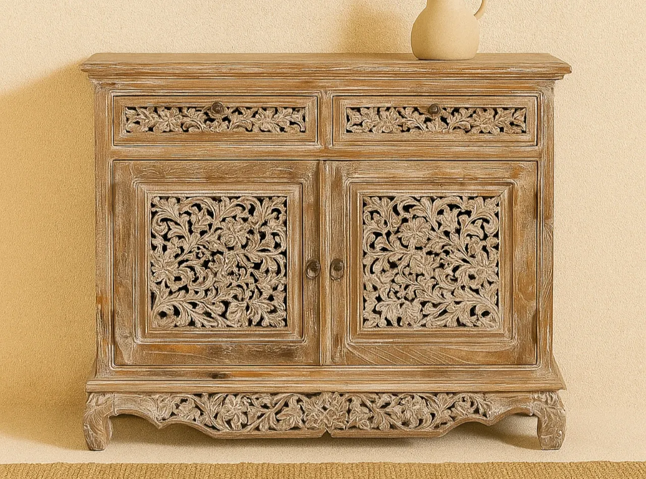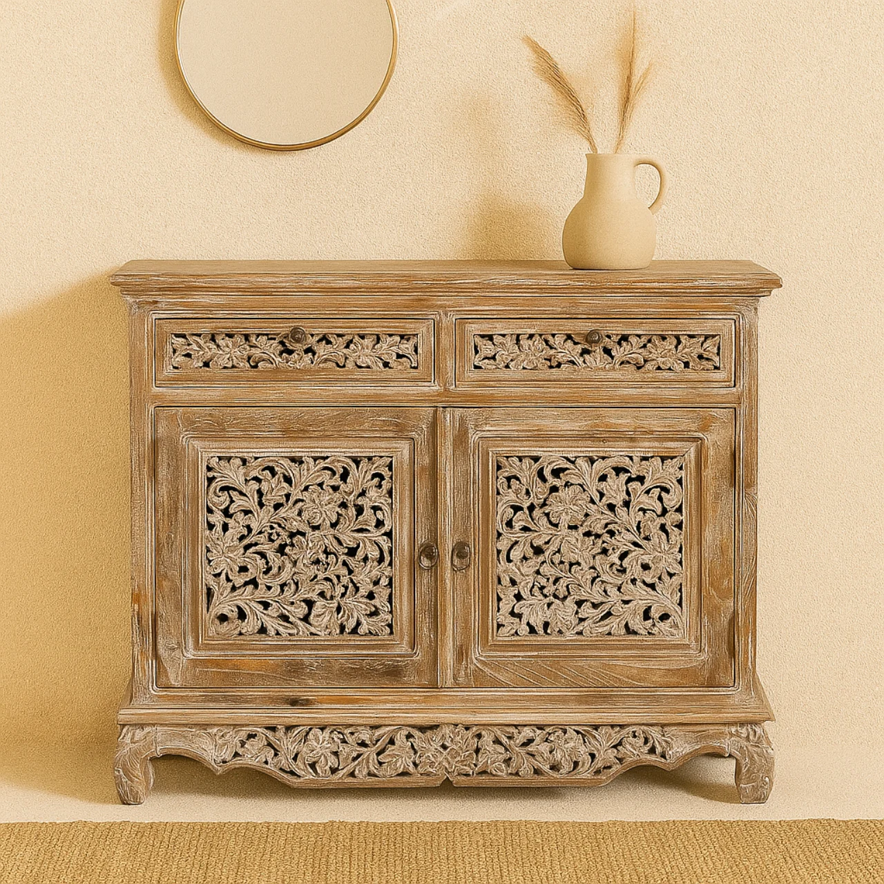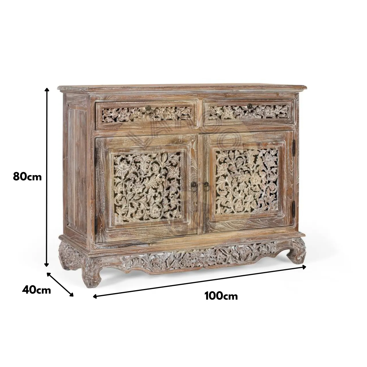 Con unas medidas de 100 cm de largo, 80 cm de alto y 40 cm de ancho, dispone de dos puertas y dos cajones tallados a mano con motivos florales y calados decorativos, creando un efecto visual lleno de detalle y textura.