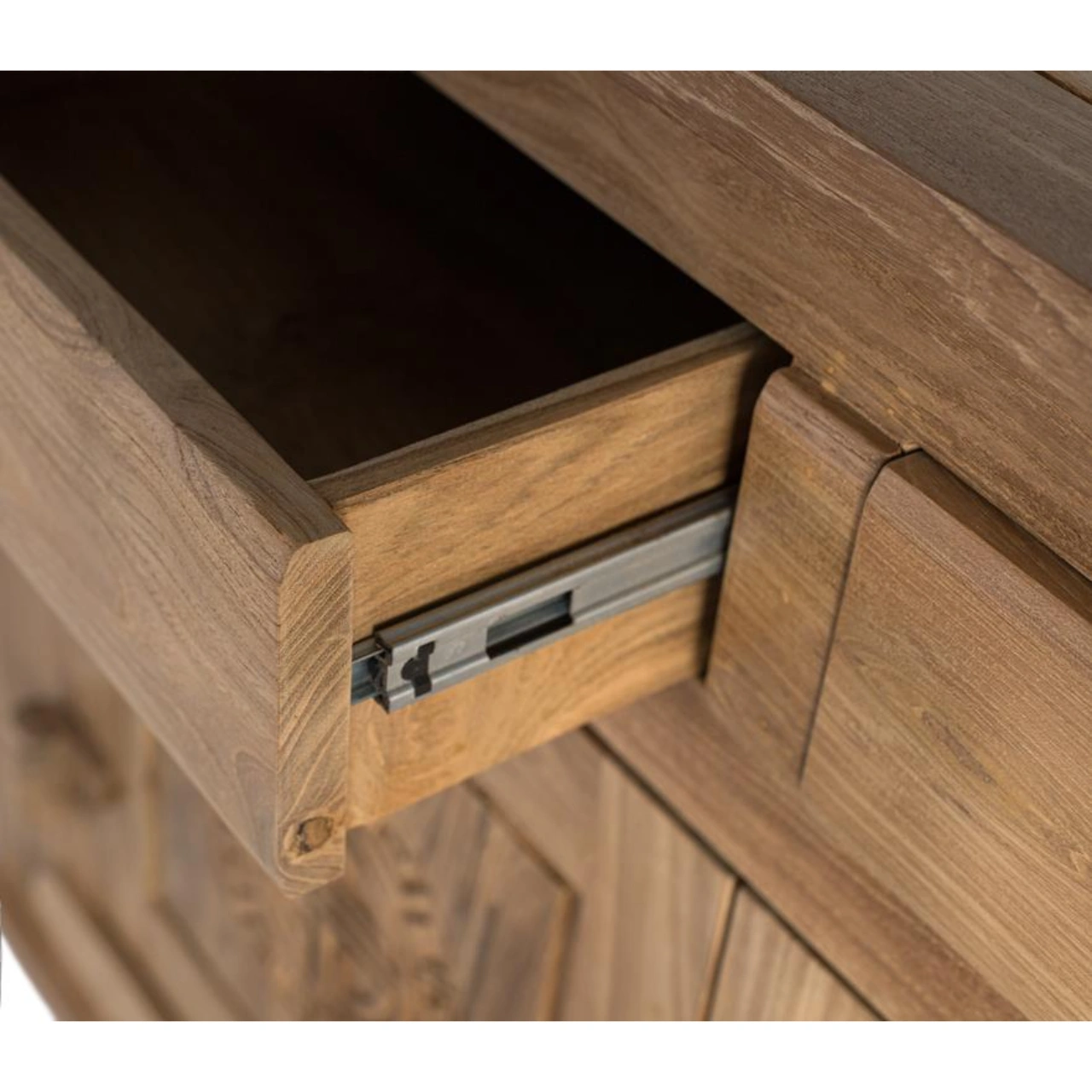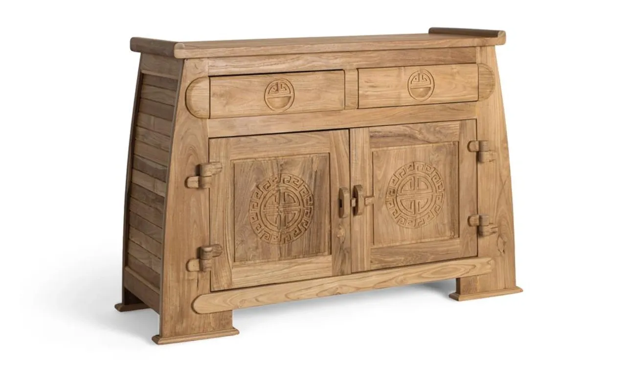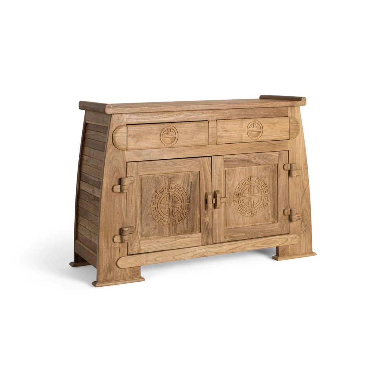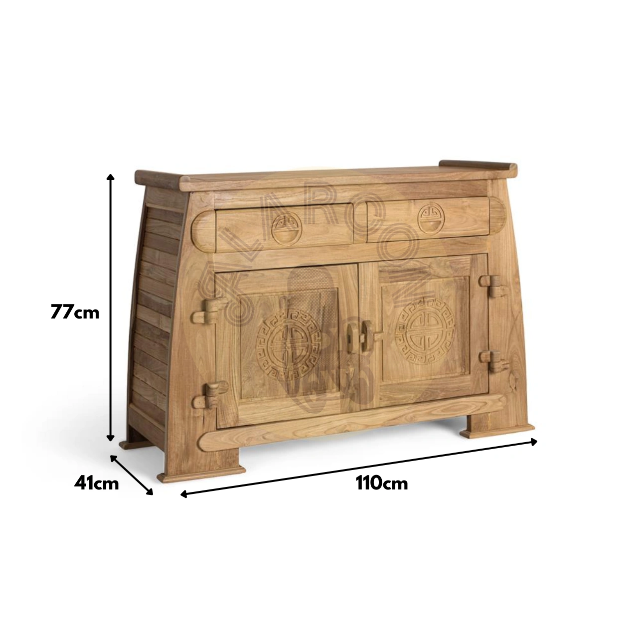 Elaborado en madera maciza de teca, este aparador destaca por su acabado natural rústico, que realza las vetas orgánicas y aporta una calidez característica del material. Su diseño muestra una clara influencia oriental, creando una pieza con presencia decorativa y auténtica.