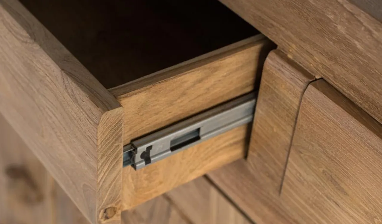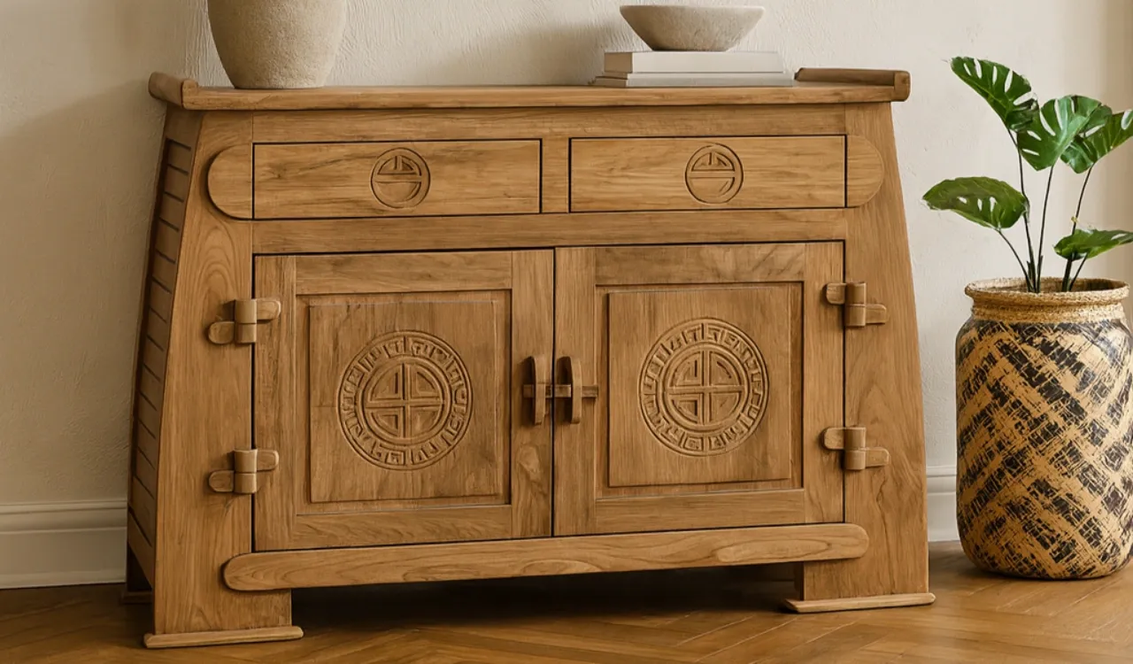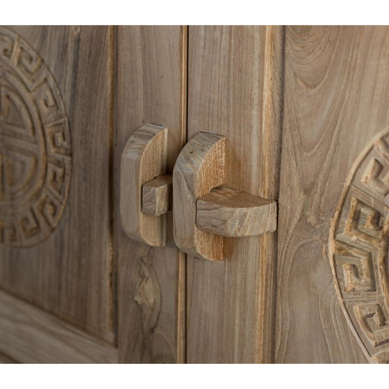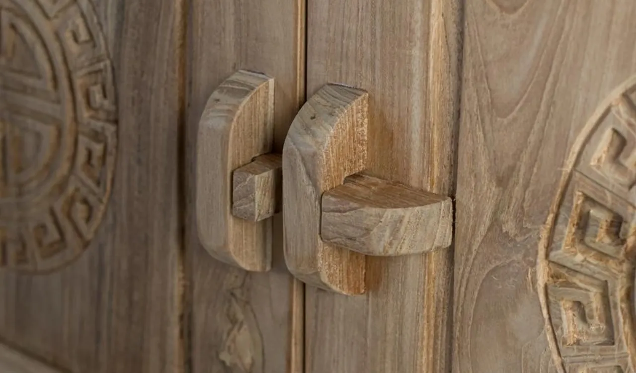 Elaborado en madera maciza de teca, este aparador destaca por su acabado natural rústico, que realza las vetas orgánicas y aporta una calidez característica del material. Su diseño muestra una clara influencia oriental, creando una pieza con presencia decorativa y auténtica.