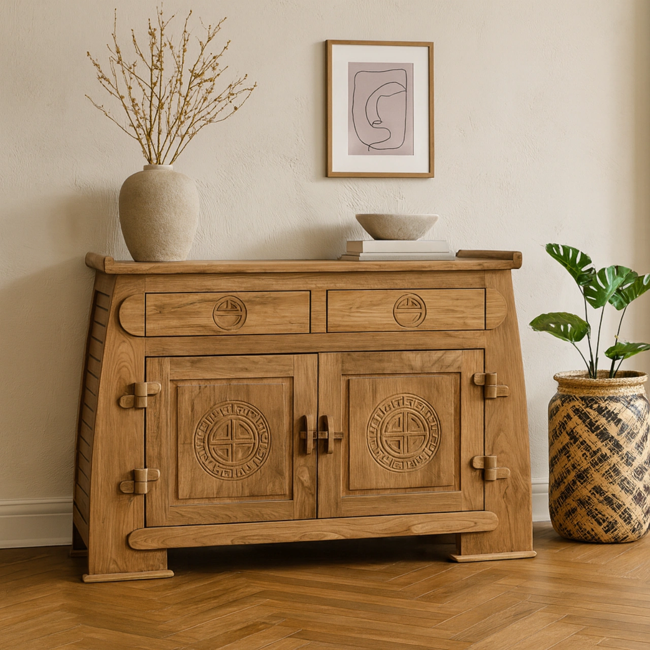 Los laterales ligeramente curvos y los detalles tallados aportan personalidad, mientras que la base sólida y elevada garantiza estabilidad, durabilidad y un estilo atemporal ideal para interiores que buscan naturalidad, carácter y una estética cálida.