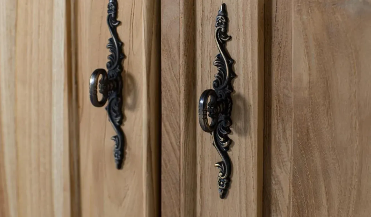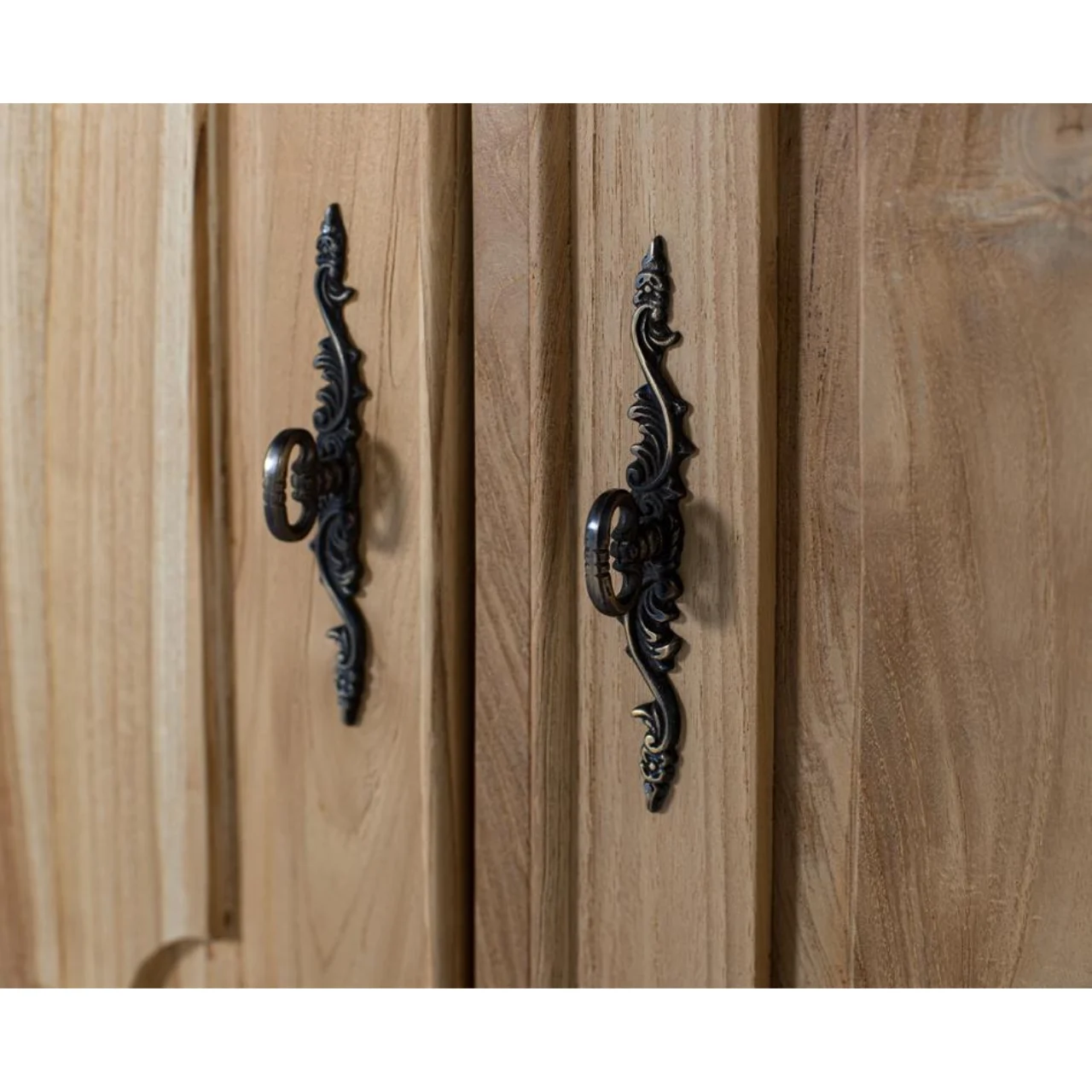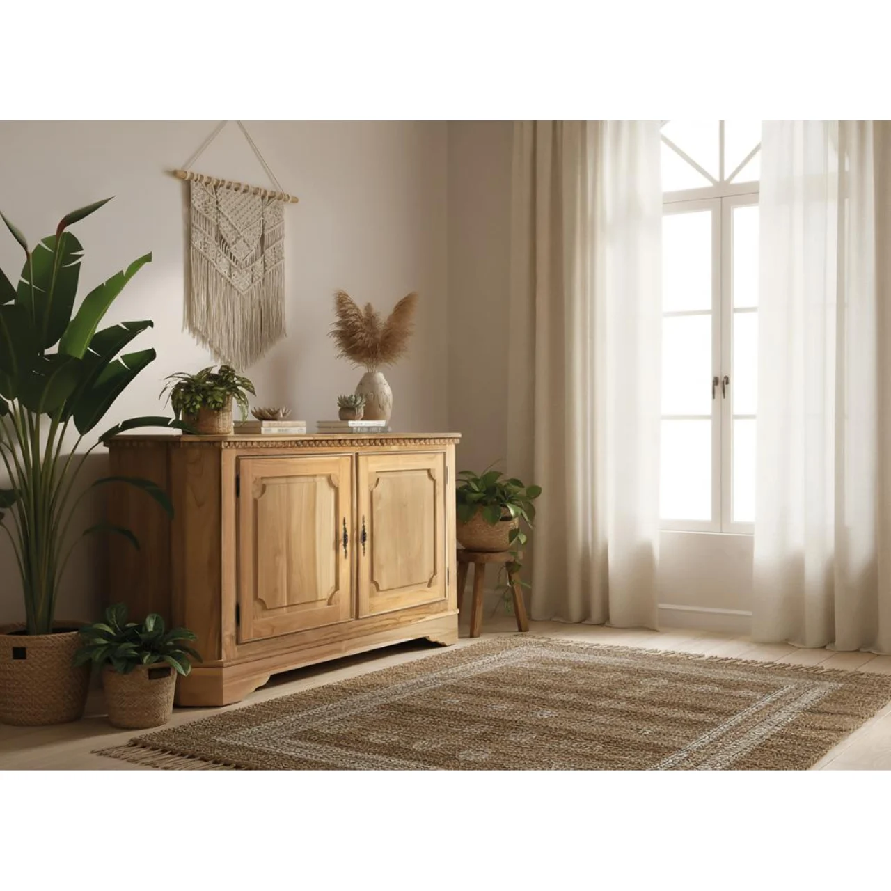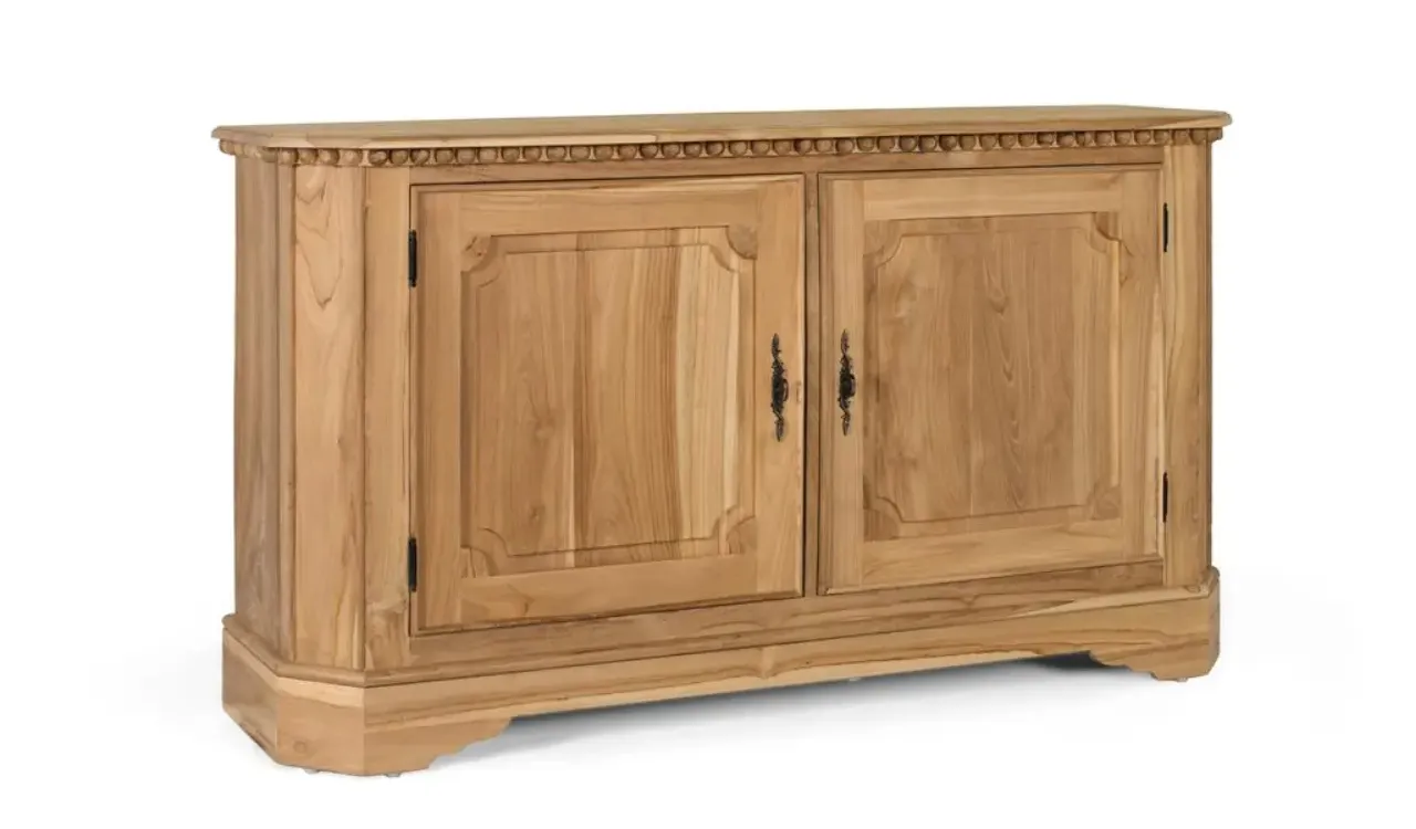 El aparador de madera maciza de teca destaca por su acabado natural, que realza la veta dorada y aporta calidez a cualquier espacio. Su diseño clásico y líneas sobrias transmiten elegancia atemporal, ideal para interiores de estilo rústico o colonial.