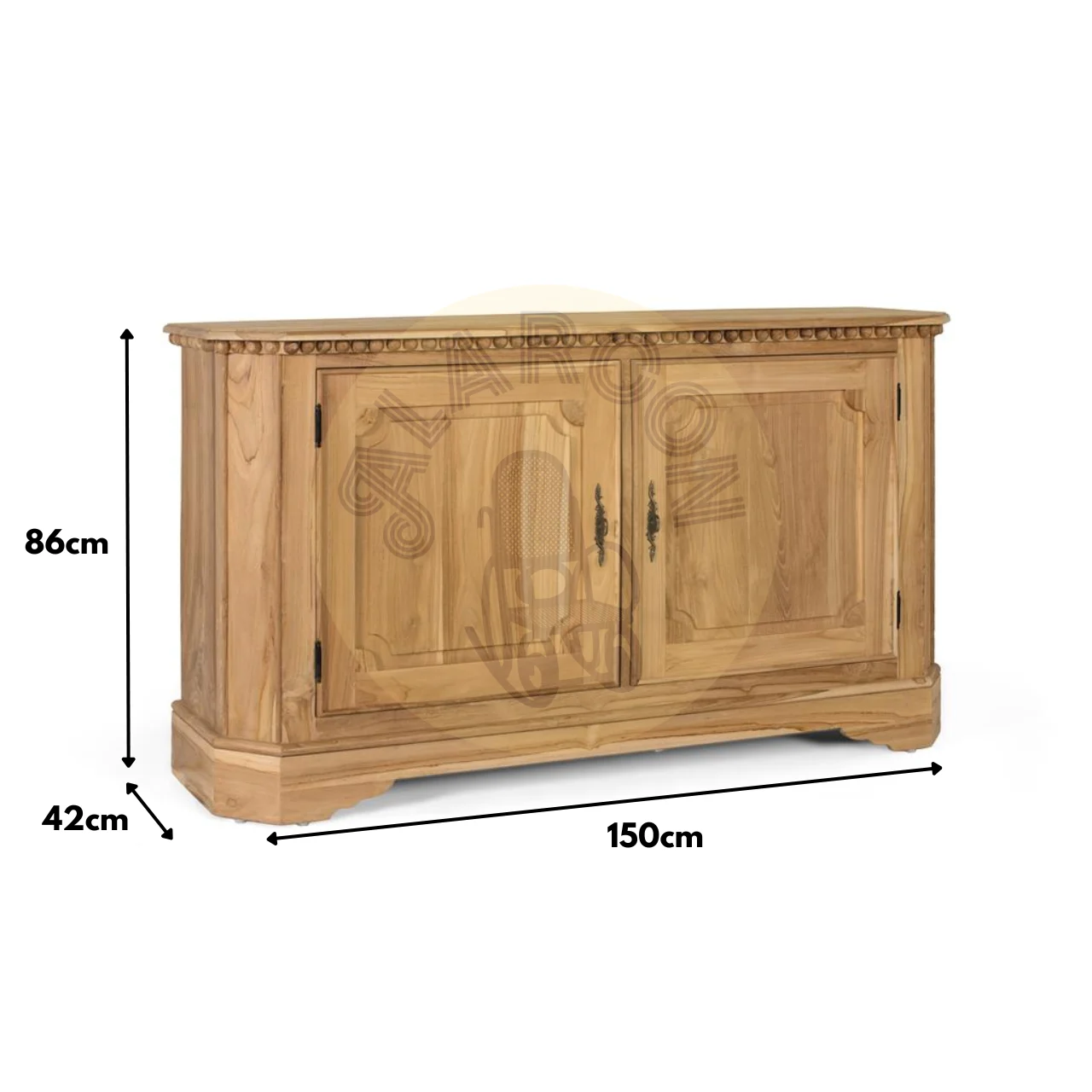 Con unas medidas de 150 cm de largo, 86 cm de alto y 41,5 cm de ancho, cuenta con dos puertas frontales con molduras decorativas y dos baldas interiores, ofreciendo amplio espacio de almacenaje para mantener el orden sin perder estilo.