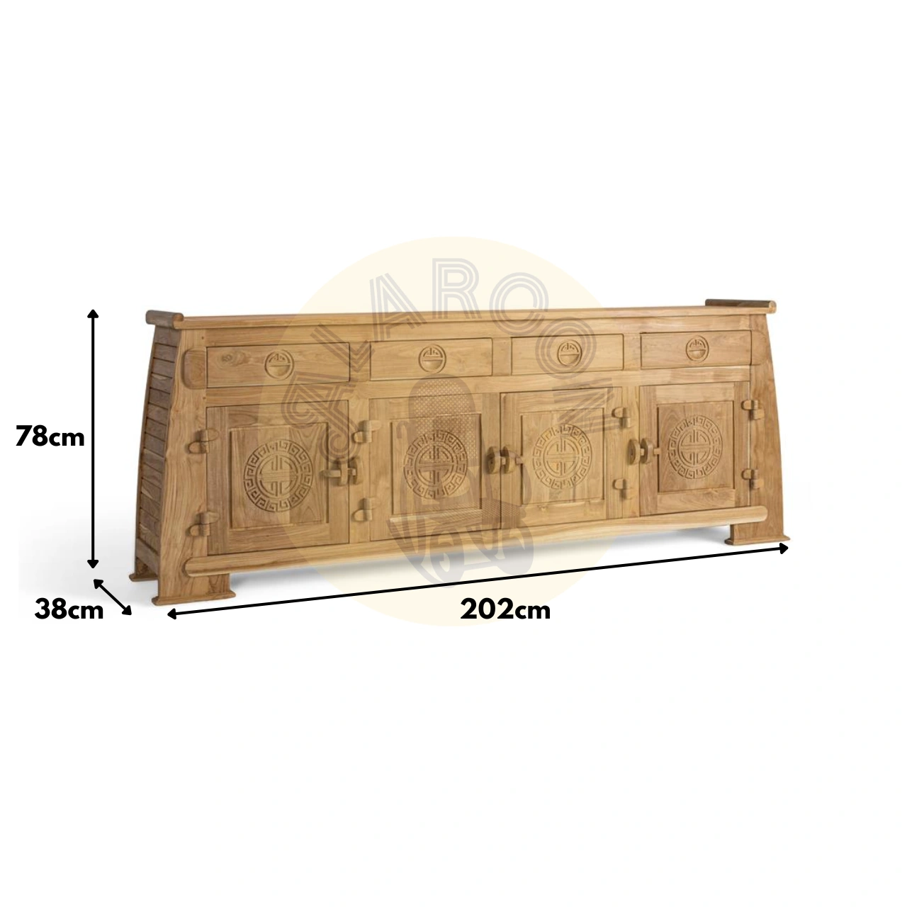 Con unas medidas de 202 × 78 × 38 cm, este aparador se apoya sobre una base sólida que aporta estabilidad y eleva la pieza de forma ligera. Su estilo atemporal, su riqueza artesanal y su presencia imponente lo convierten en una opción ideal para interiores que buscan naturalidad, detalle y elegancia cálida.