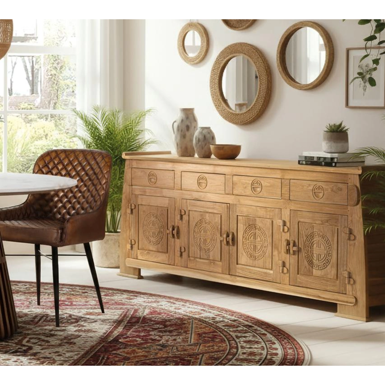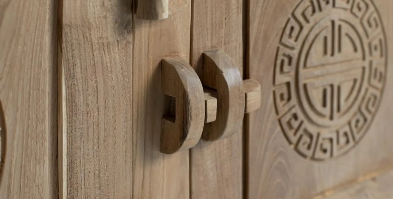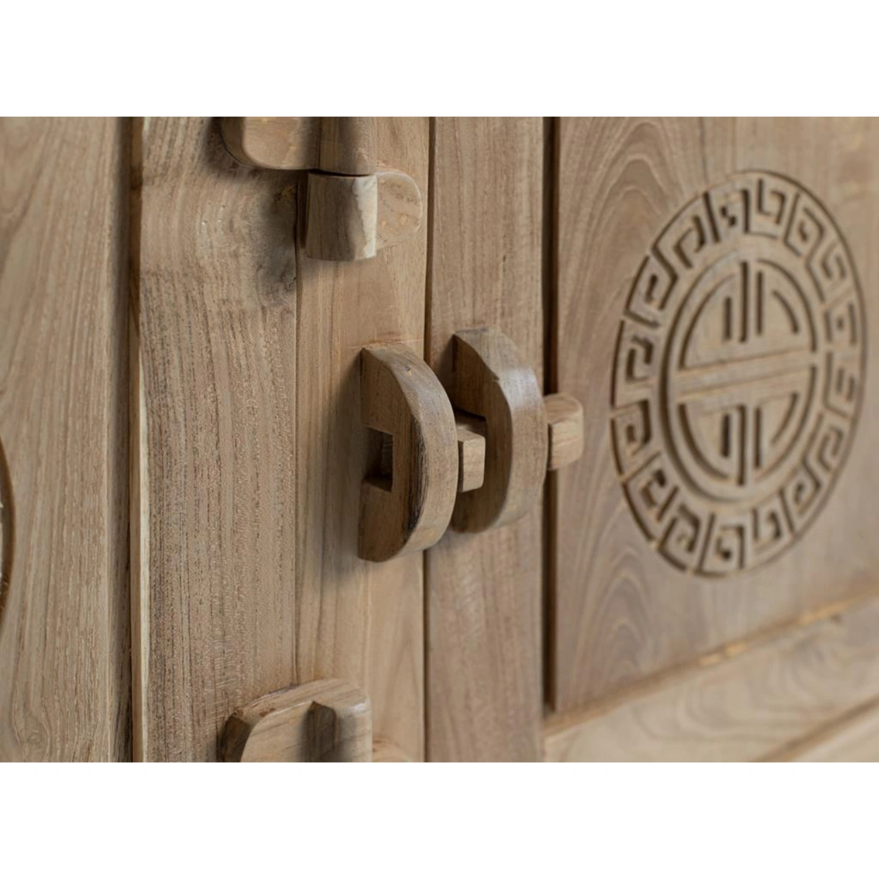 Realzado en madera maciza de teca, este aparador en tono natural rústico destaca por sus vetas visibles y por una estética de inspiración oriental que aporta carácter y autenticidad al espacio. Los cuatro cajones superiores incorporan tiradores circulares tallados, reforzando el trabajo artesanal del diseño.