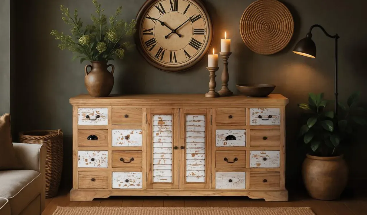El aparador rústico de madera maciza de mindi destaca por su acabado natural envejecido, que resalta las vetas y aporta un estilo artesanal lleno de carácter y autenticidad.