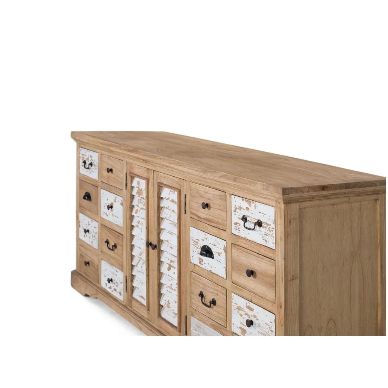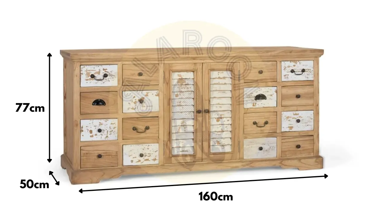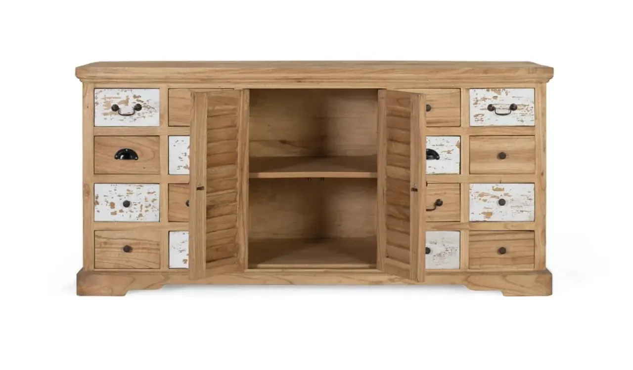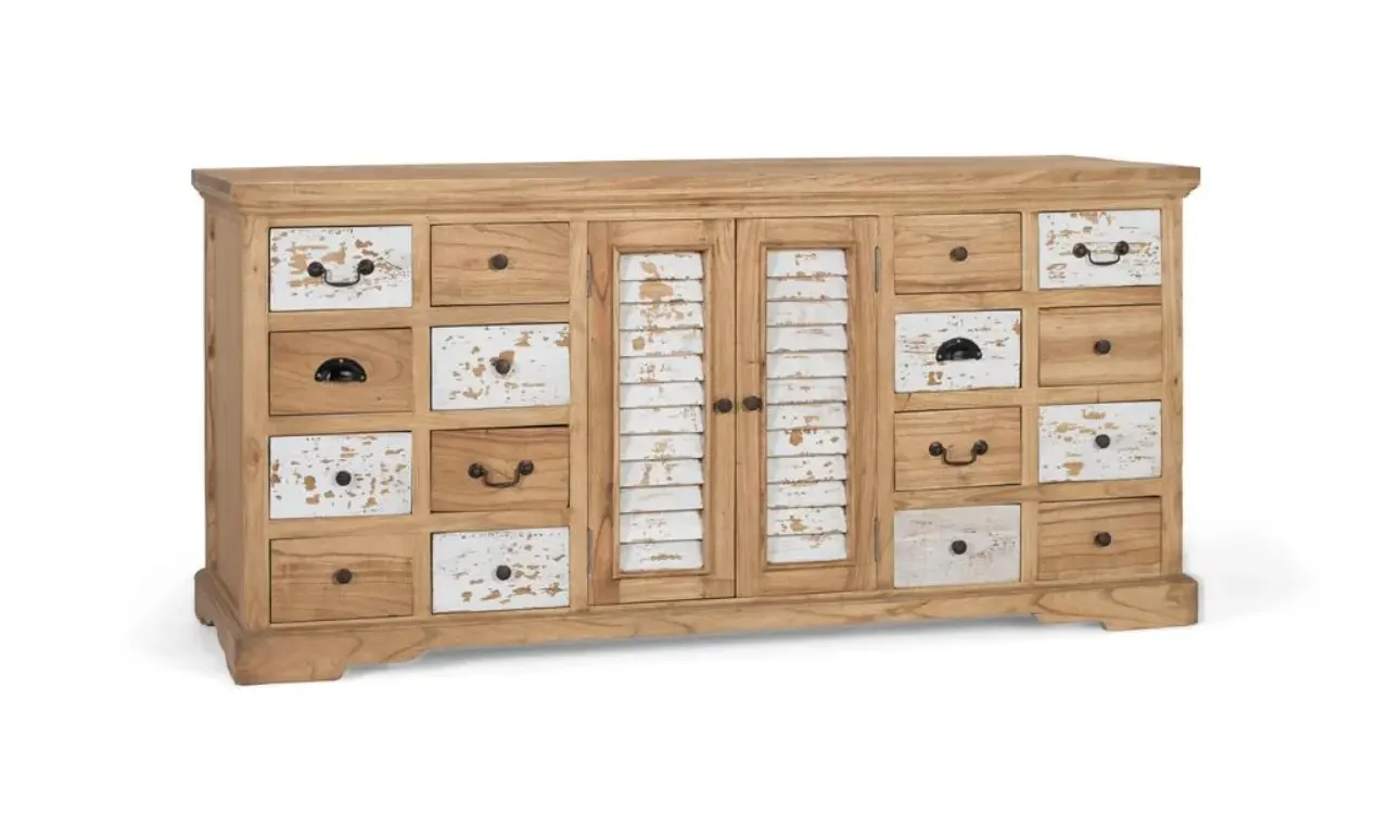 Su diseño combina 12 cajones con tiradores metálicos y 2 puertas centrales con lamas verticales en blanco envejecido, ofreciendo almacenaje práctico y una estética ecléctica muy decorativa.