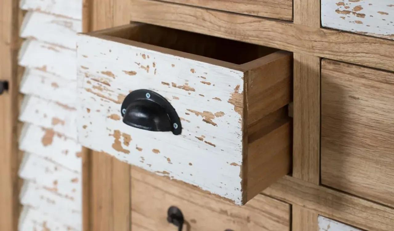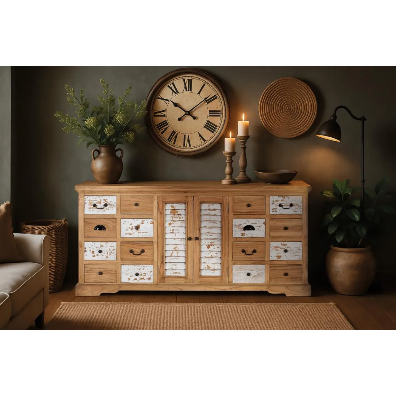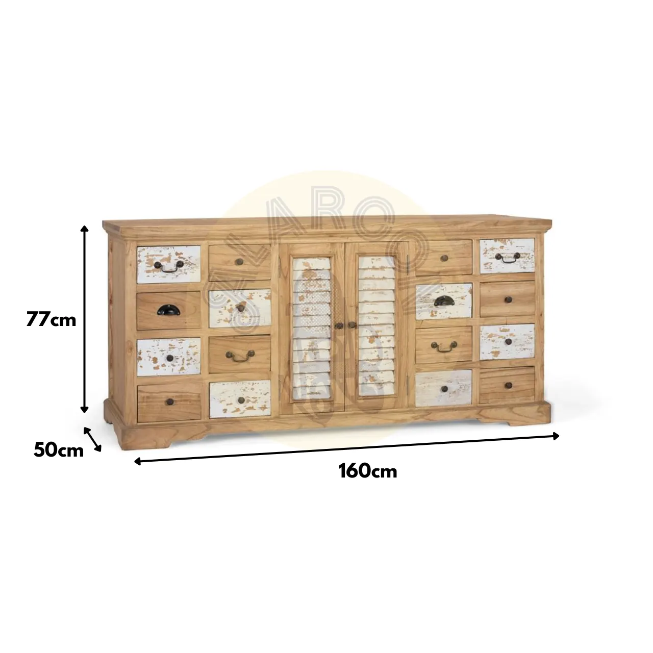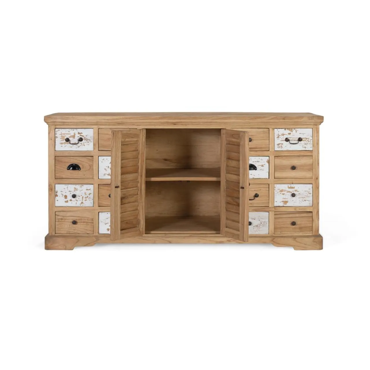 Su diseño combina 12 cajones con tiradores metálicos y 2 puertas centrales con lamas verticales en blanco envejecido, ofreciendo almacenaje práctico y una estética ecléctica muy decorativa.